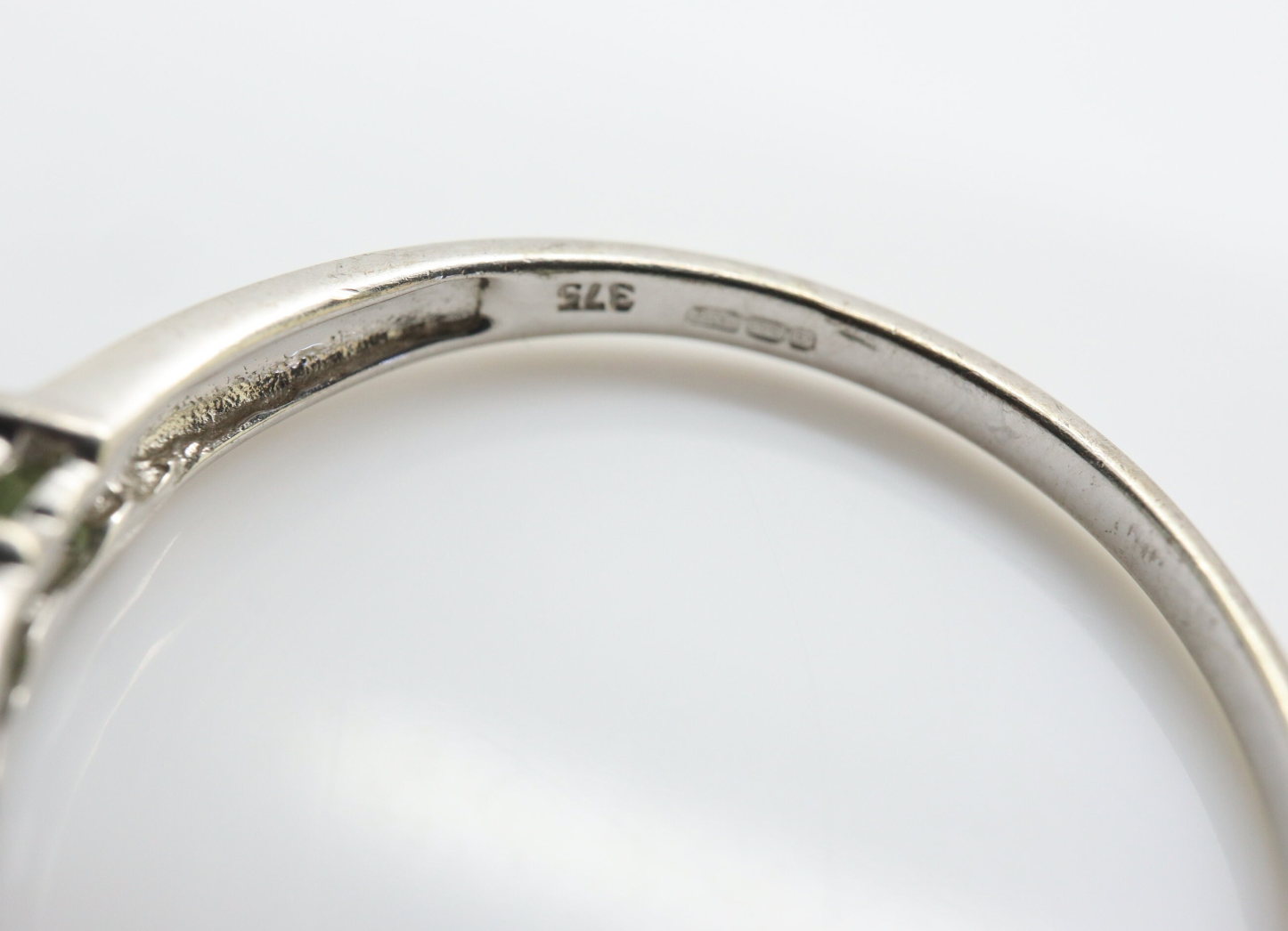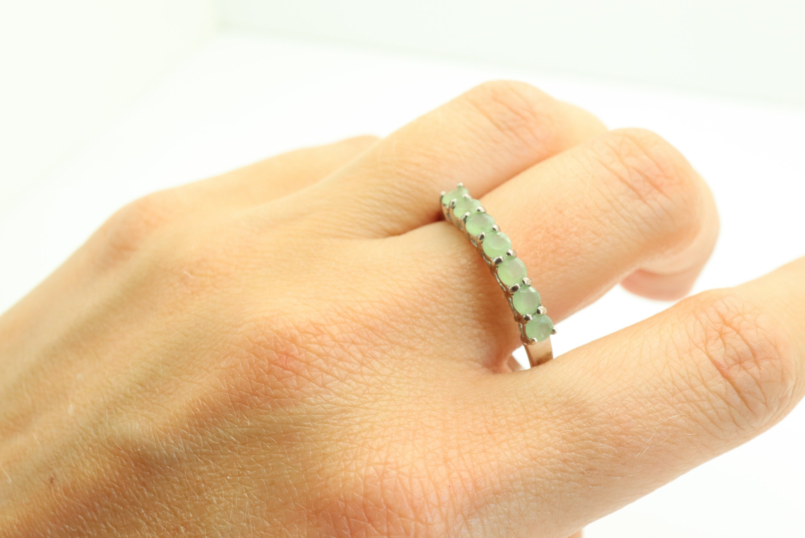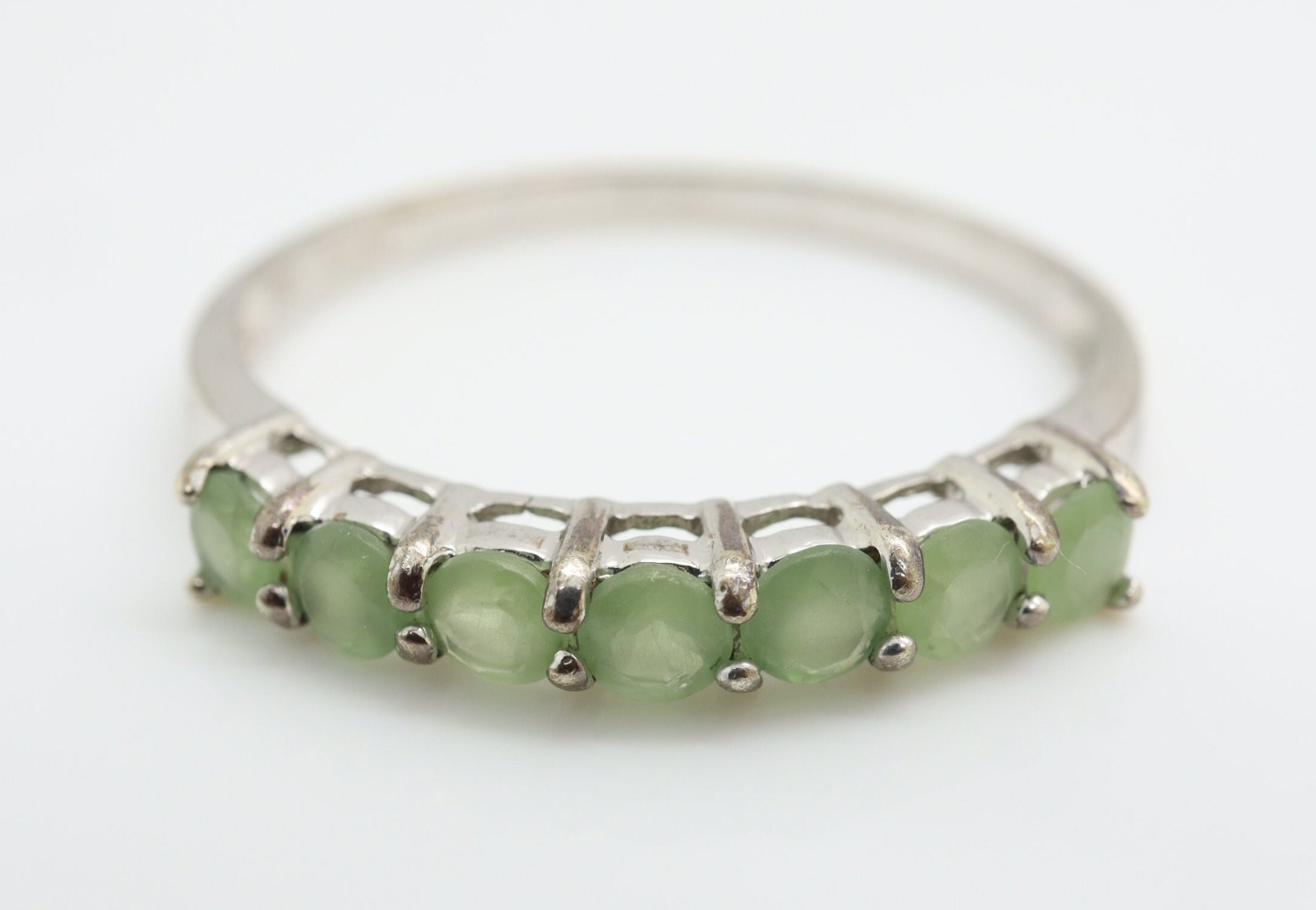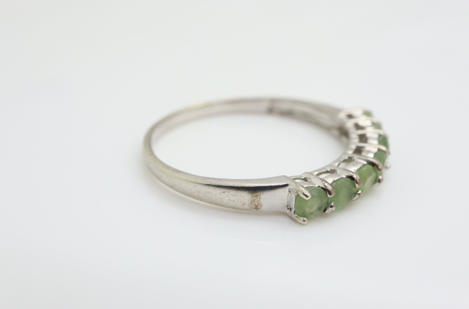 Crafted from 9ct white gold, this beautiful ring is set with 7 round shaped pale green gemstones (3 mm each).