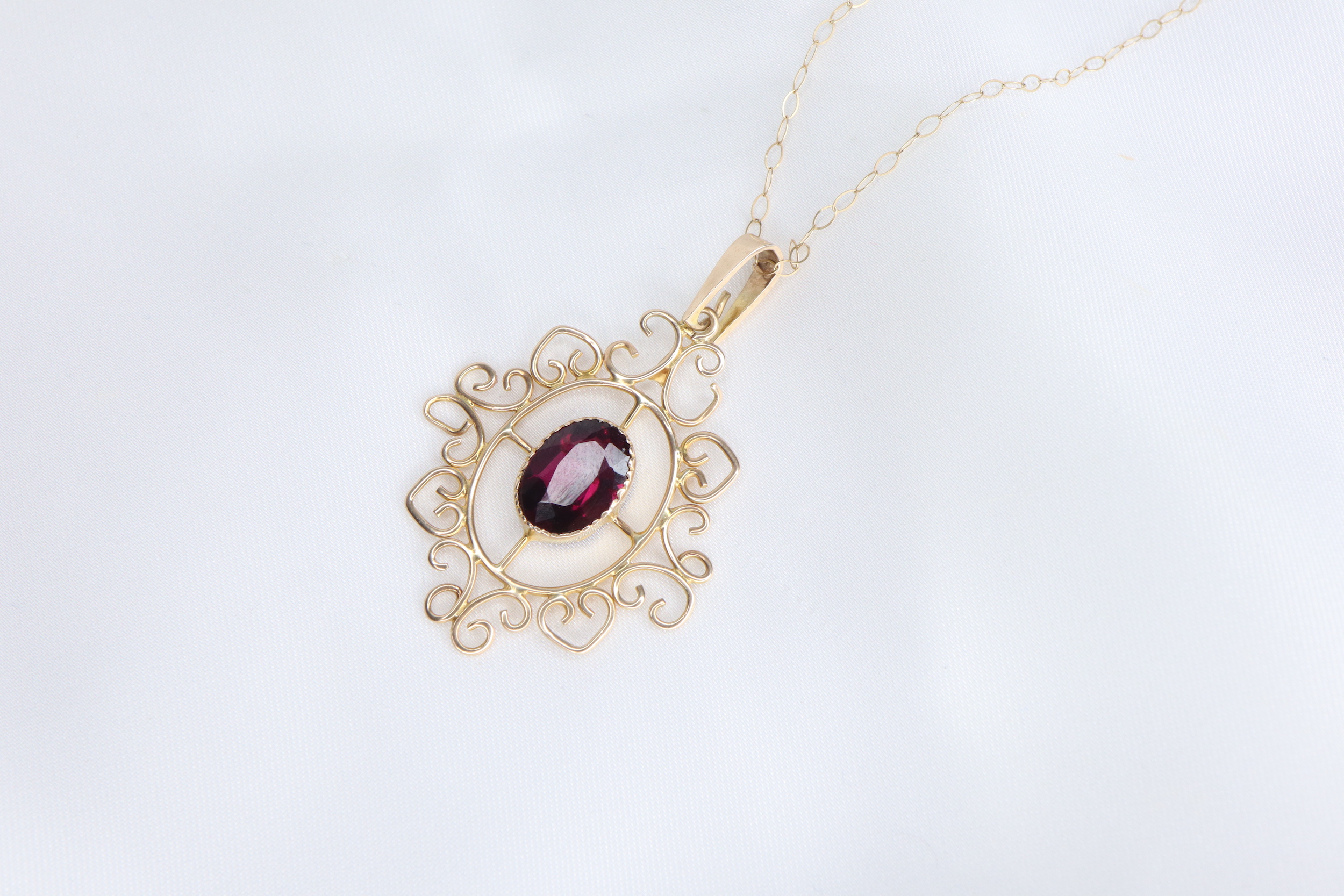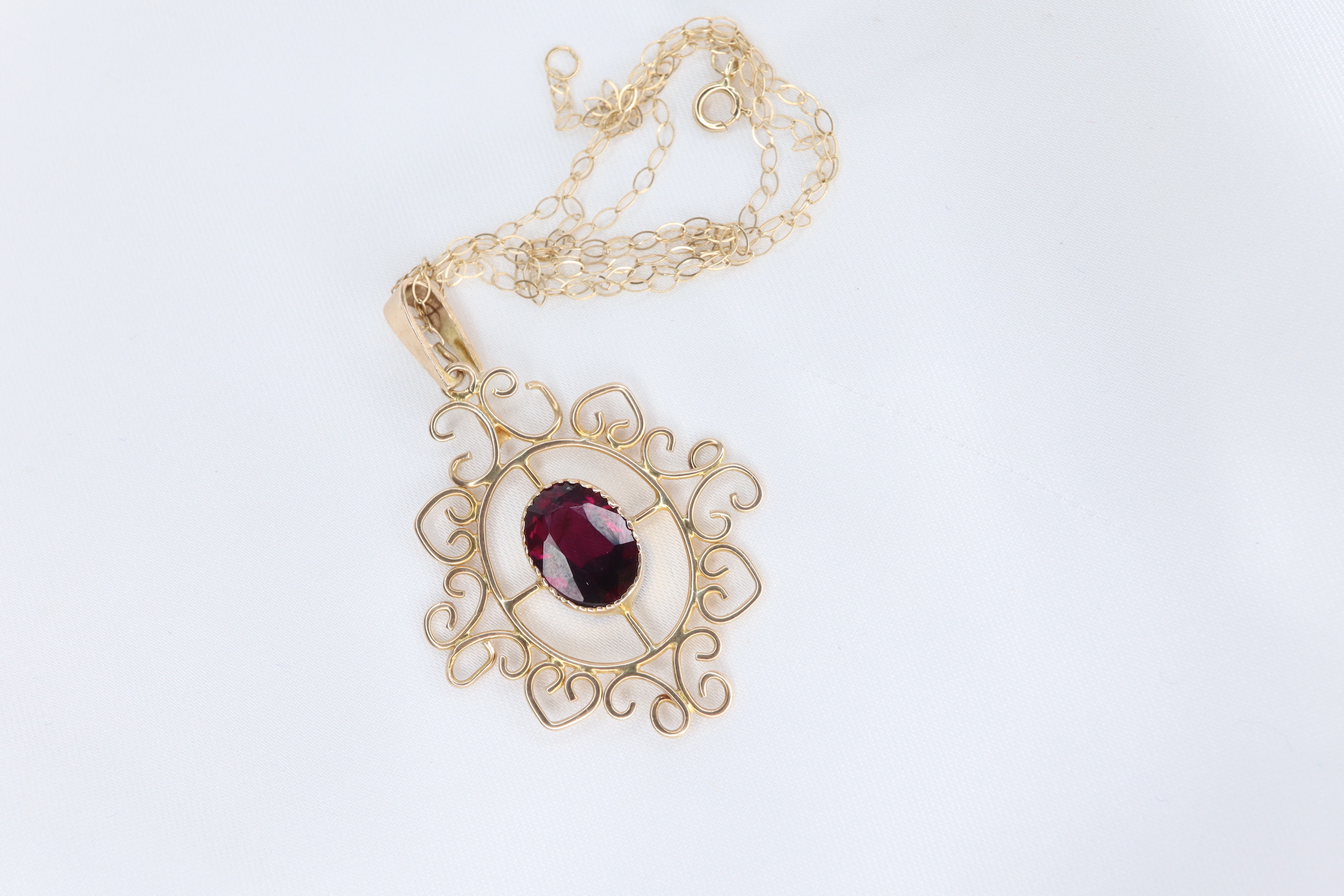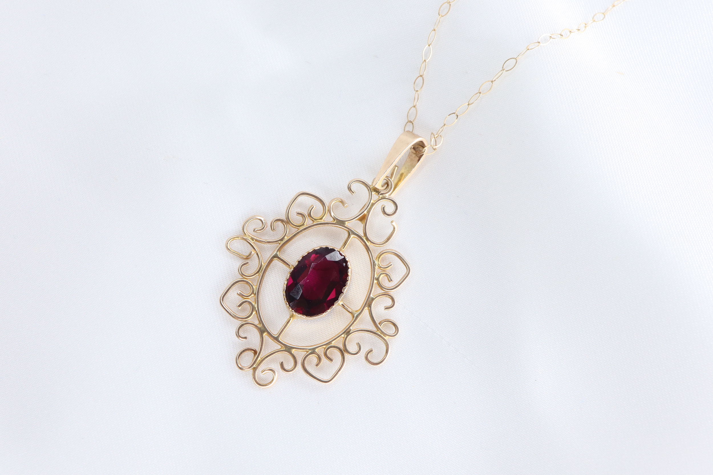 Stylowy naszyjnik z ażurowym wisiorkiem o dynamicznej formie, wykonany z 9-karatowego złota. Centralnym elementem jest owalny granat o głębokim, różowoczerwonym odcieniu, który doskonale współgra z ciepłym blaskiem złota.