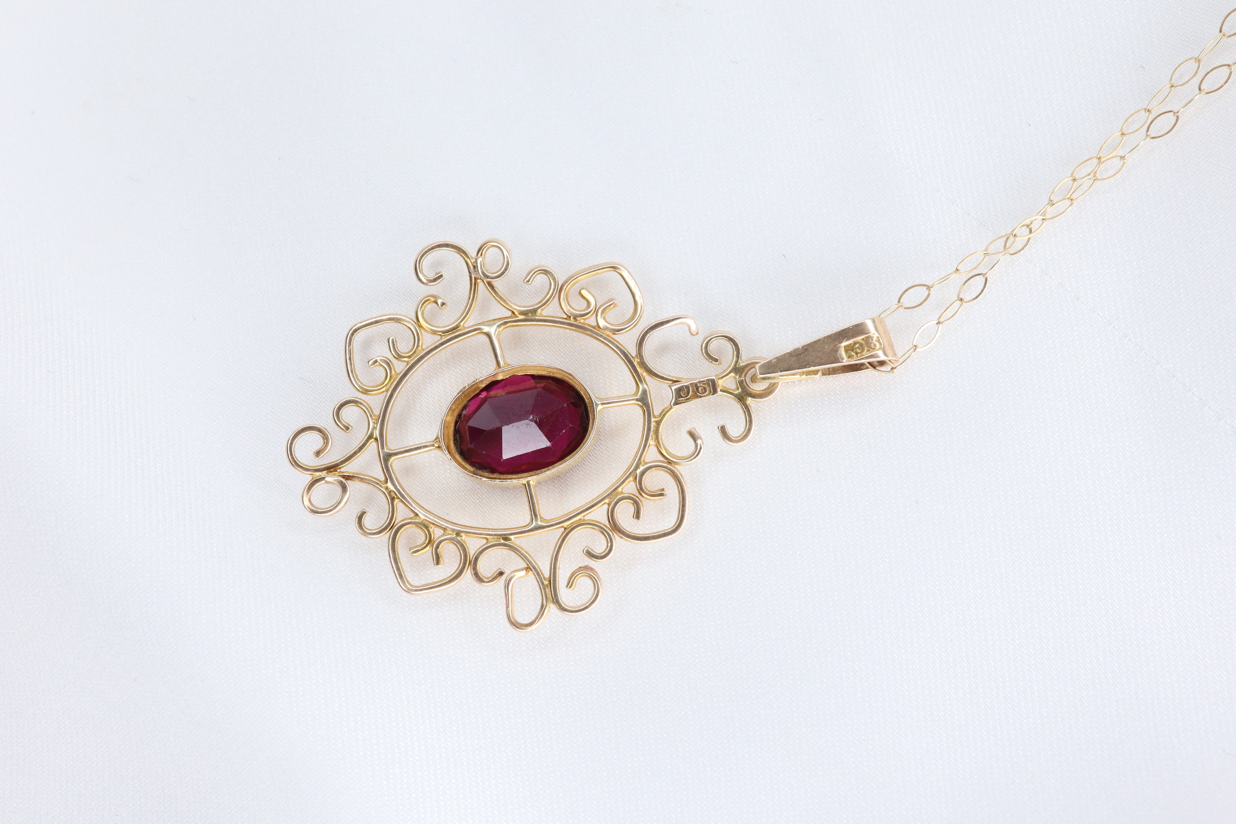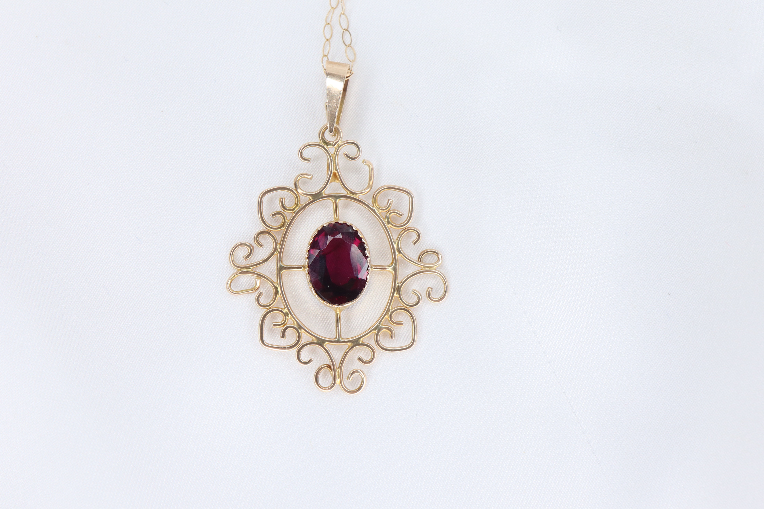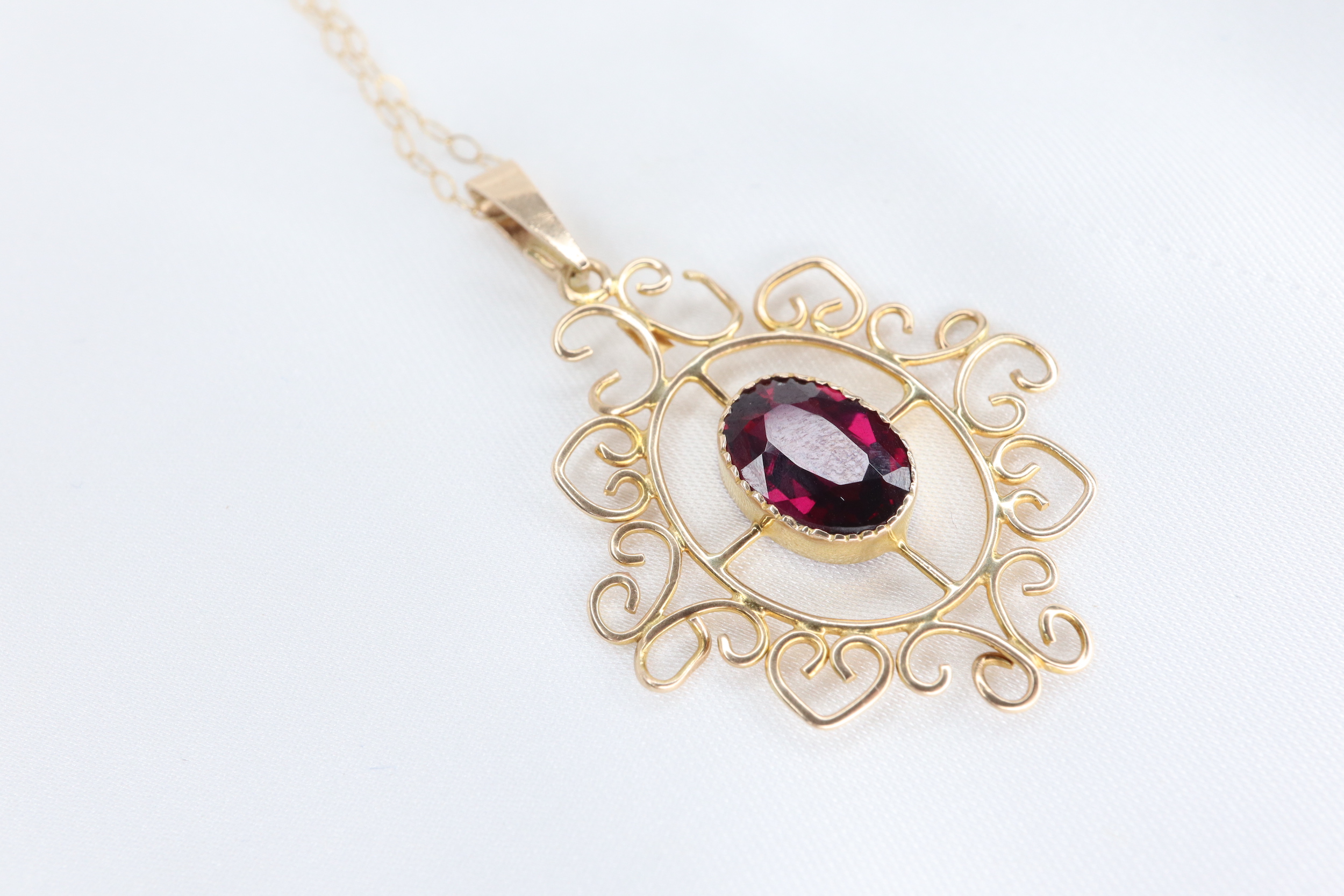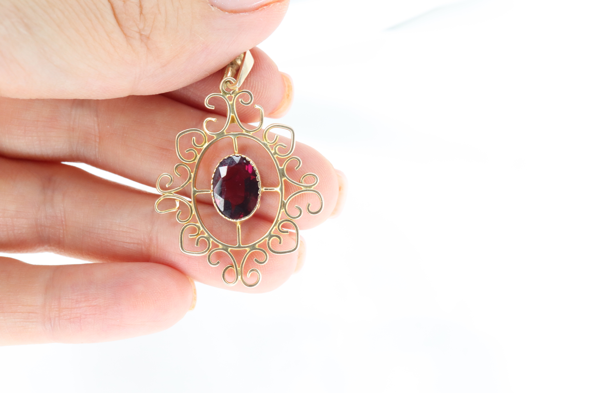 Stylowy naszyjnik z ażurowym wisiorkiem o dynamicznej formie, wykonany z 9-karatowego złota. Centralnym elementem jest owalny granat o głębokim, różowoczerwonym odcieniu, który doskonale współgra z ciepłym blaskiem złota.