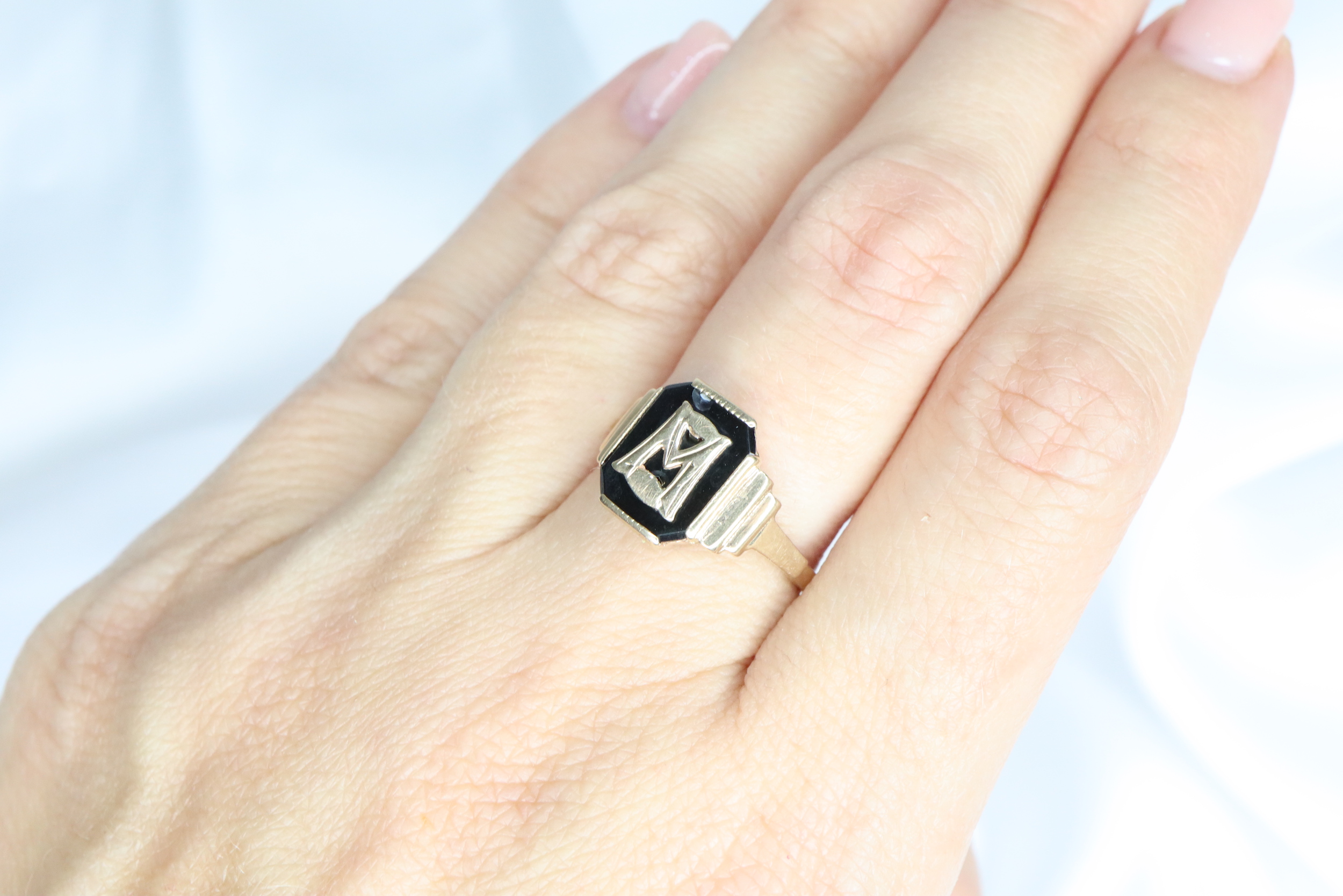 Elegancki sygnet z epoki wiktoriańskiej, wykonany z 9-karatowego żółtego złota. W centrum osadzono prostokątny, naturalny czarny onyks, ozdobiony starą angielską literą „M” lub „W”.
