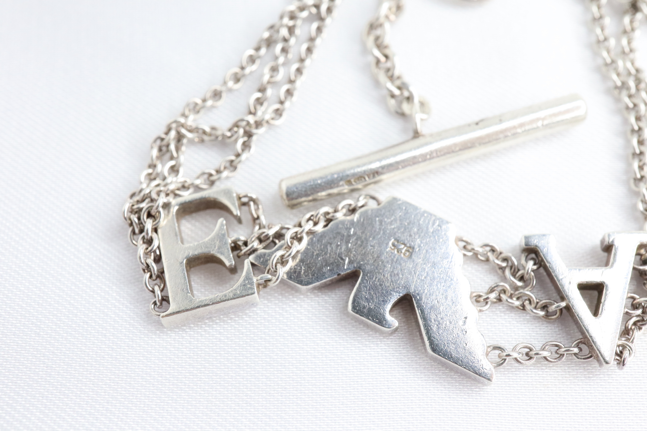 Bransoletka składa się z potrójnego łańcuszka, ozdobionego charakterystycznym logo marki. Zapięcie typu T-bar jest nie tylko wygodne w użyciu, ale również pozwala na subtelną regulację długości – dzięki dwóm pierścieniom na końcu dopasujesz ją idealnie do swojego nadgarstka.