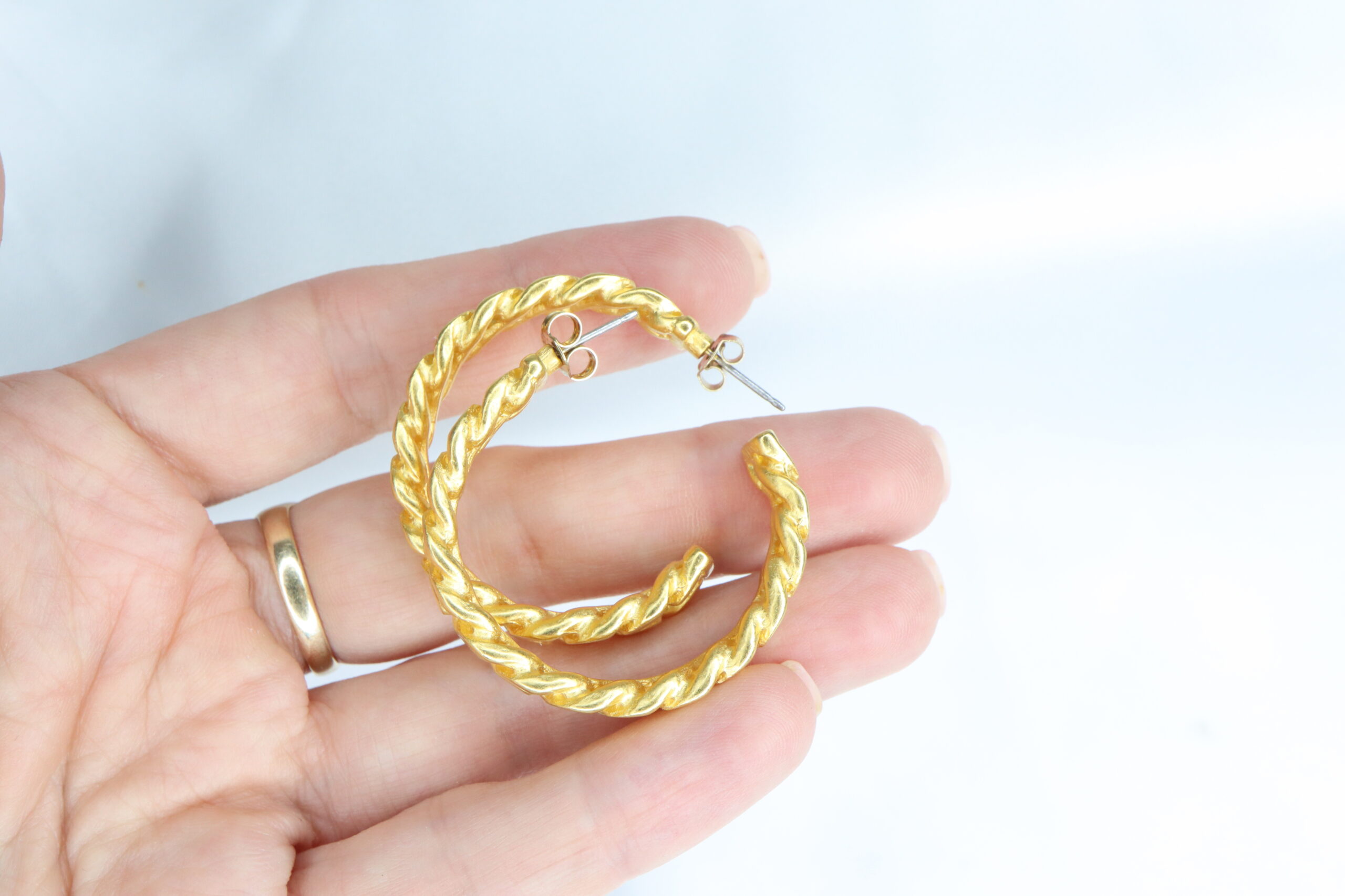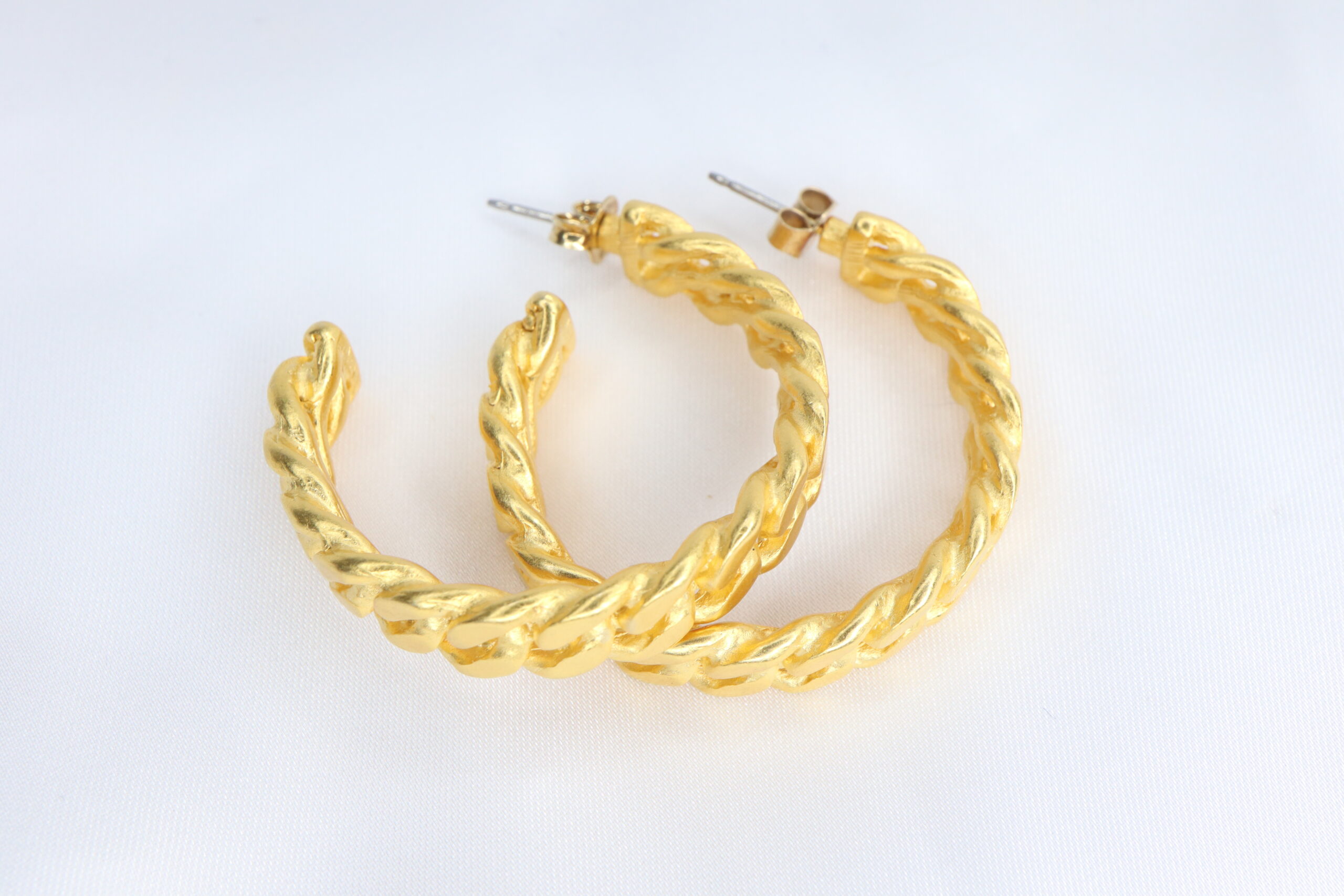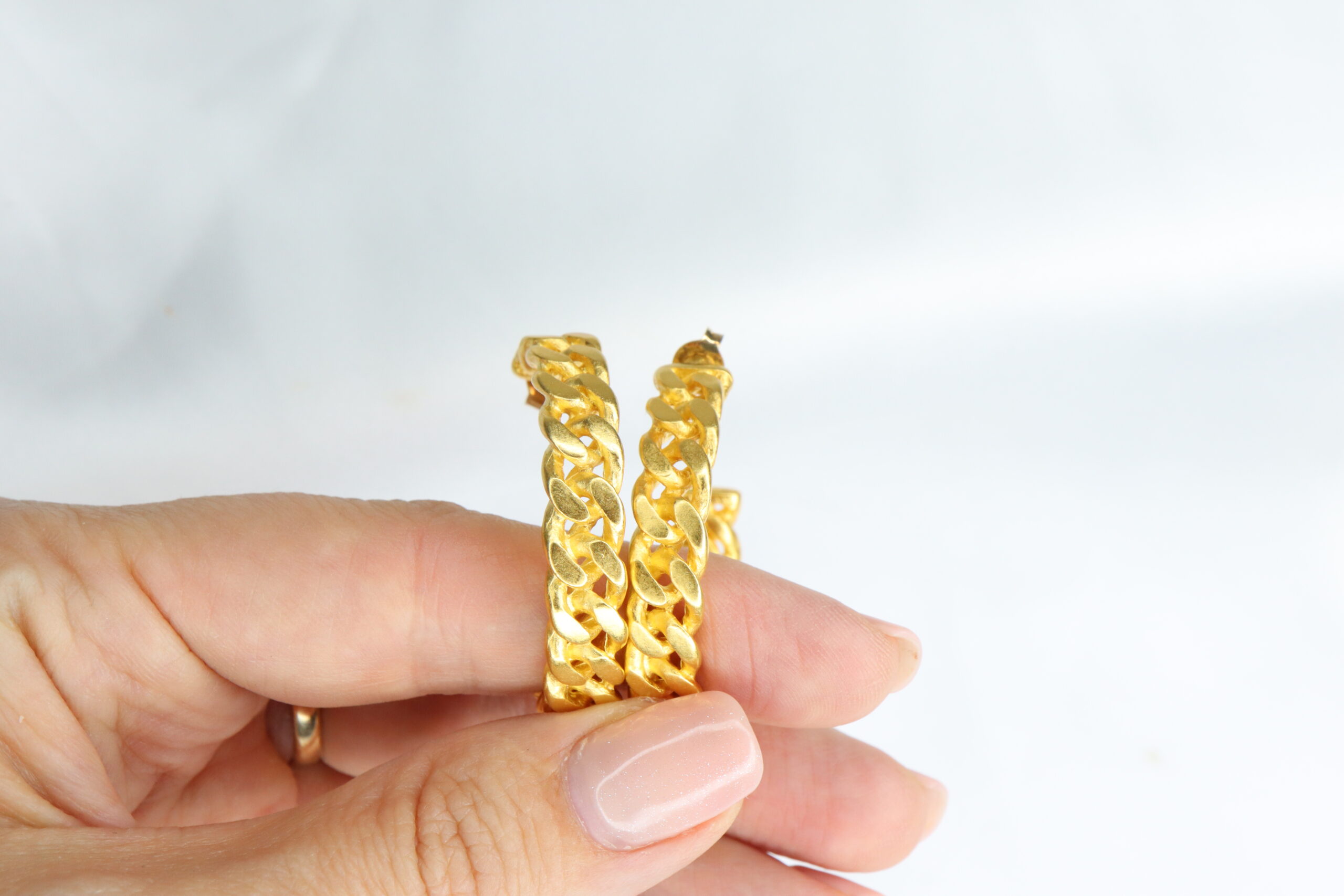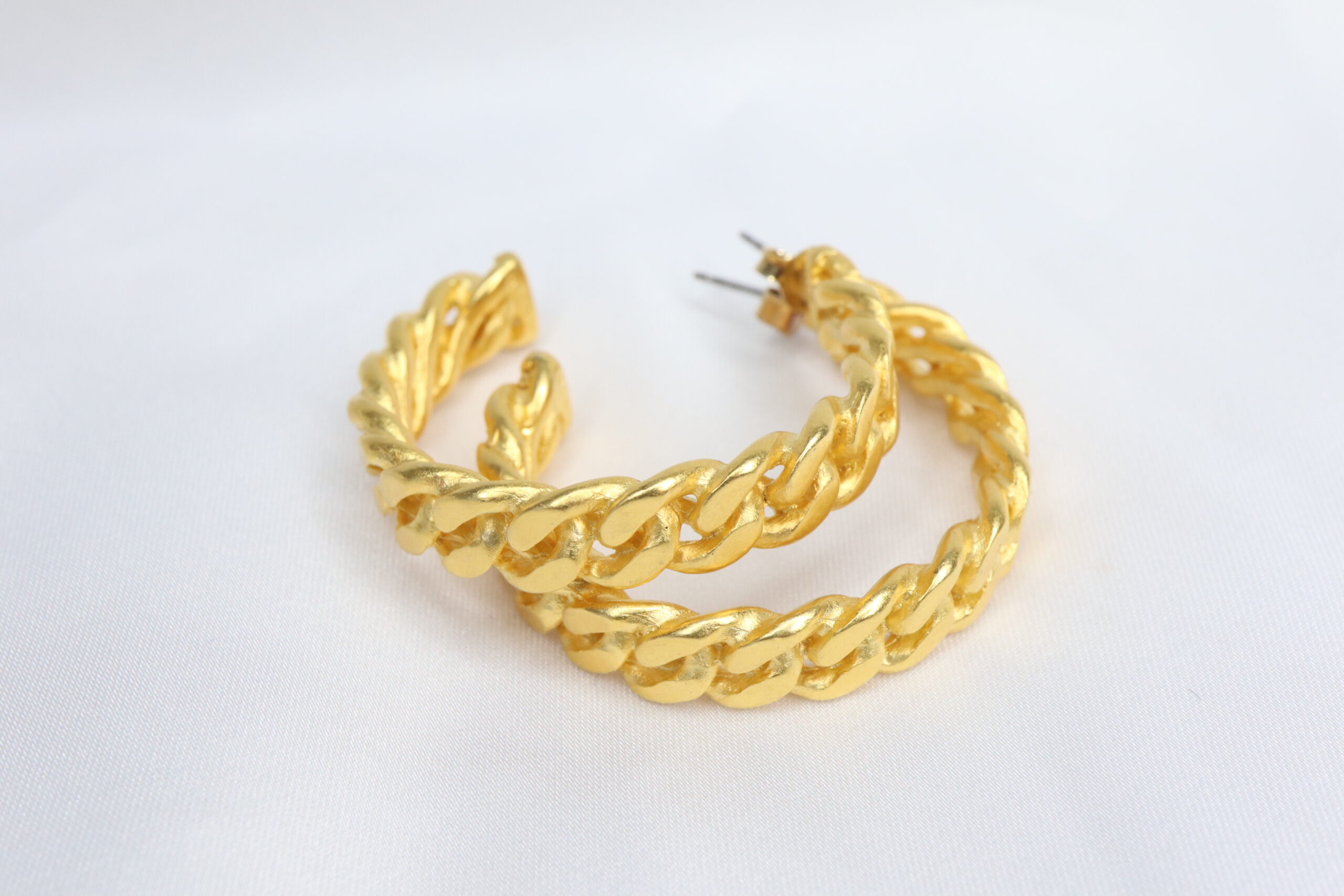 Masywne, vintage’owe kolczyki z lat 80., ozdobione wzorem łańcucha – sztywne, okrągłe formy.