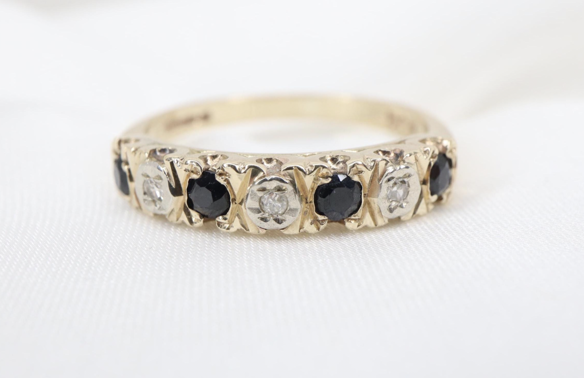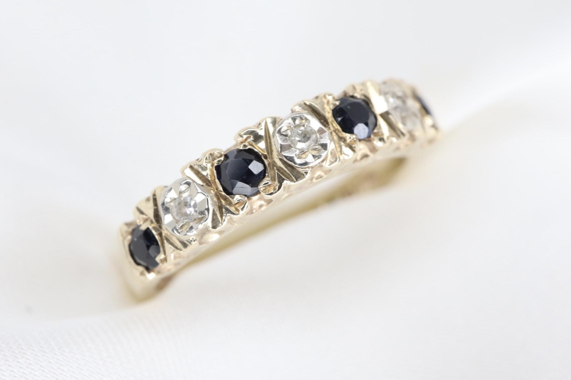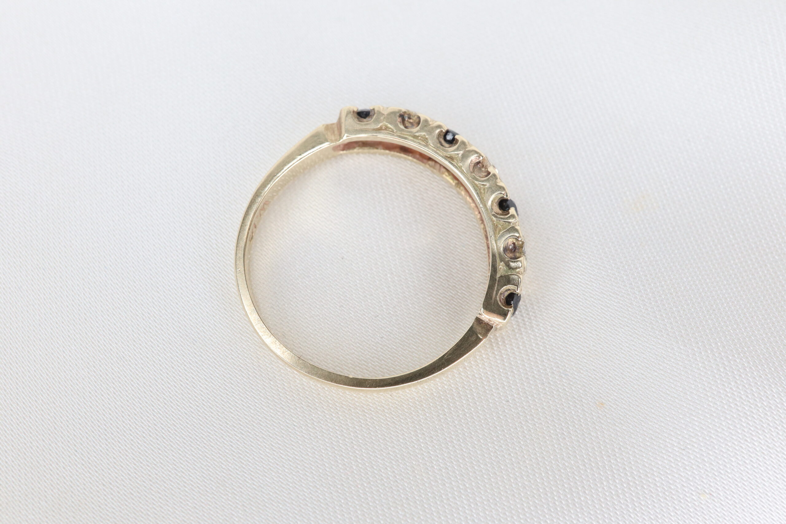 Zachwycający pierścionek wykonany z 9-karatowego żółtego złota, ozdobiony czterema drobnymi szafirami (ok. 2 mm każdy), pomiędzy którymi osadzono trzy diamenty (ok. 1,2 mm każdy).