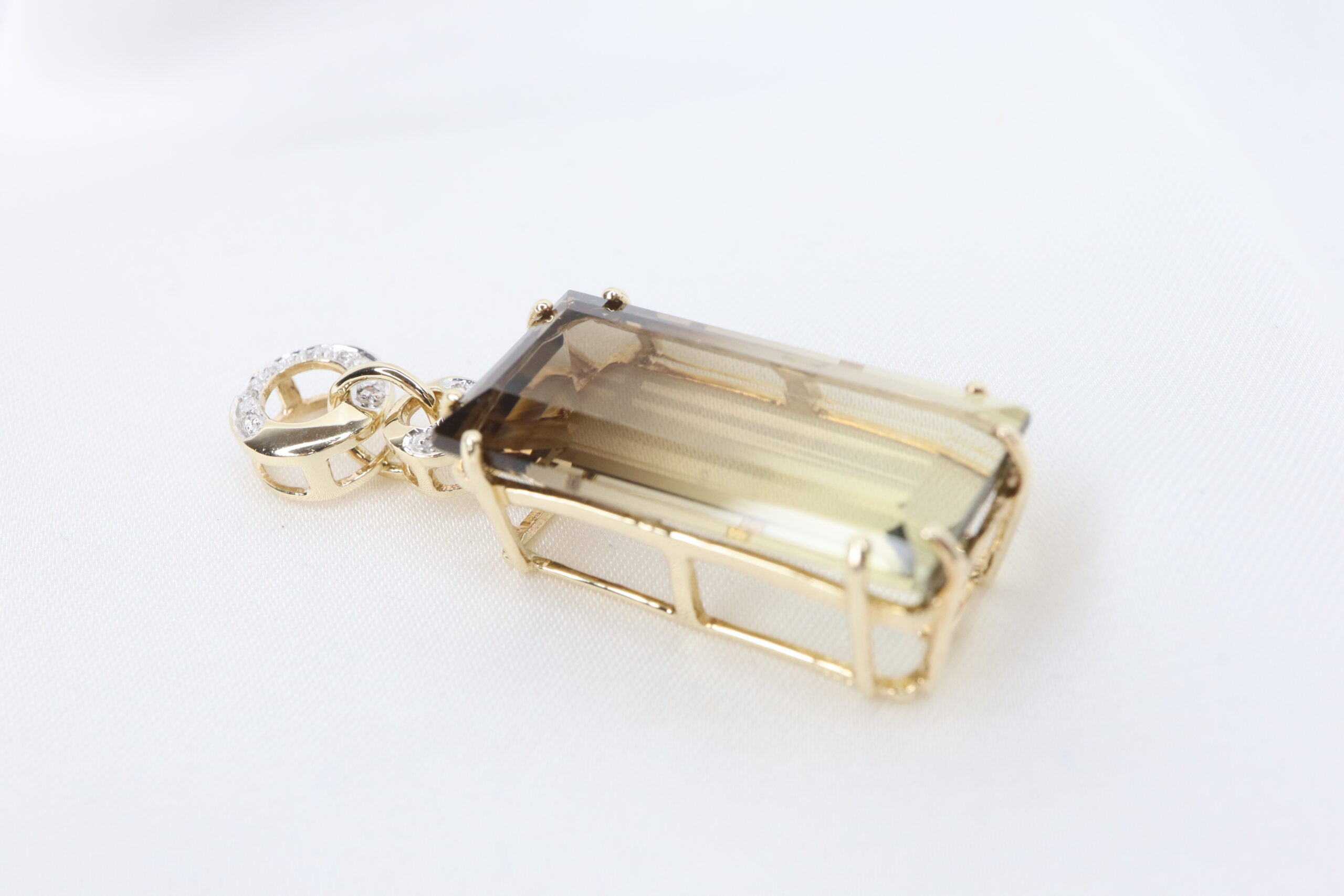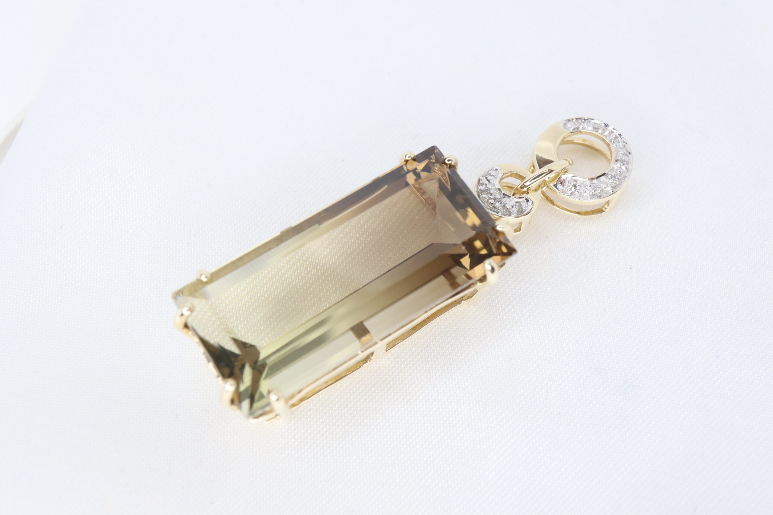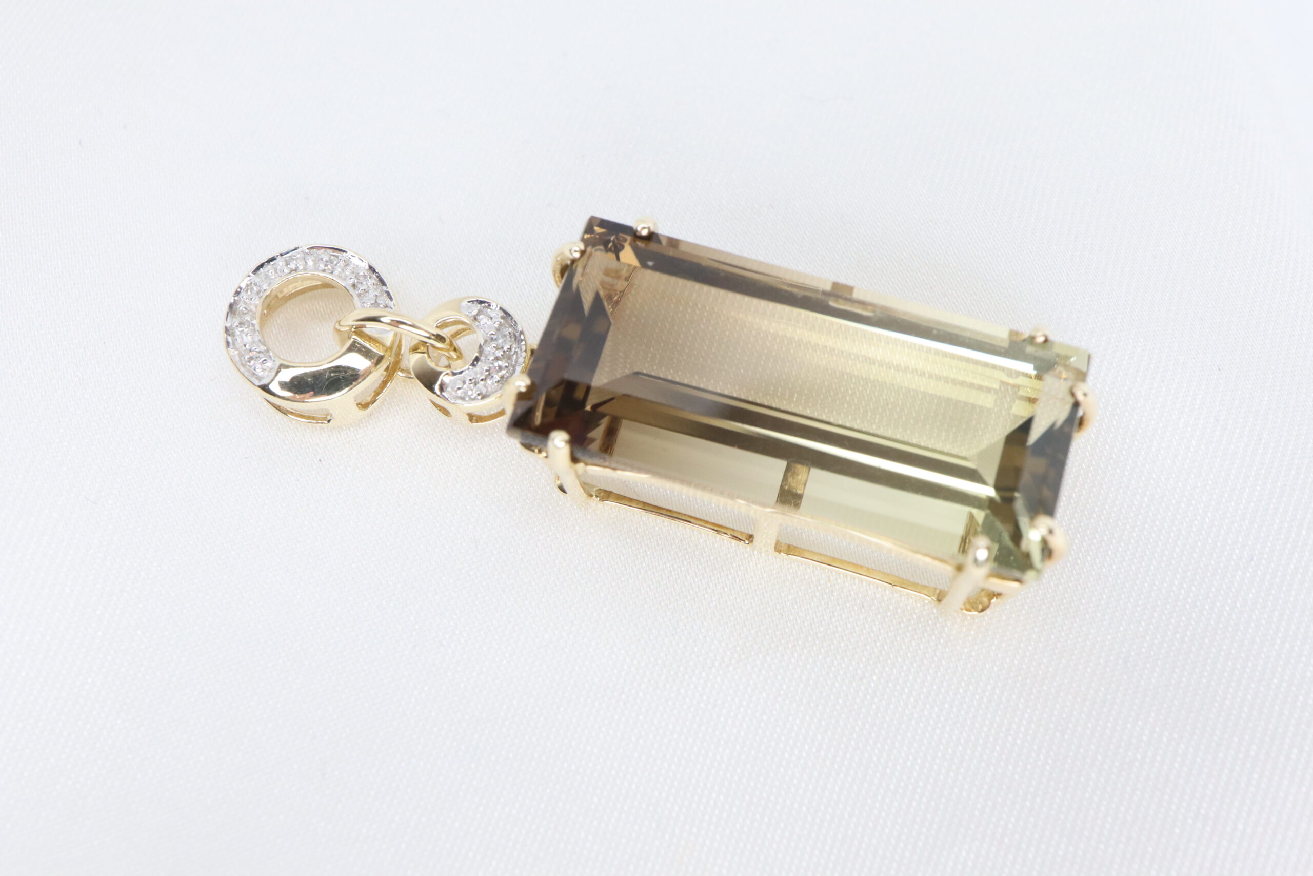 Elegancki wisiorek z 9-karatowego złota z diamentami i dużym prostokątnym kwarcem dymnym
