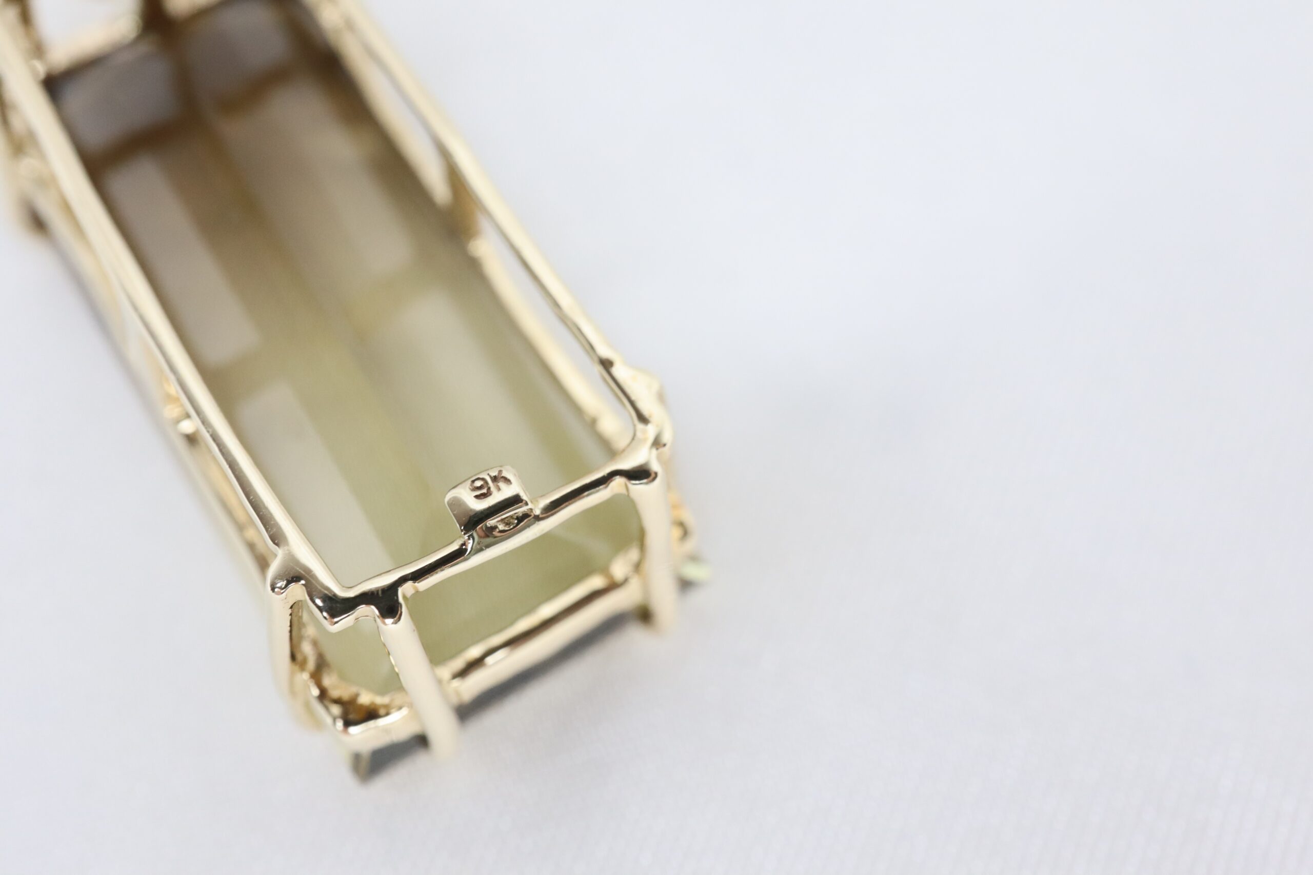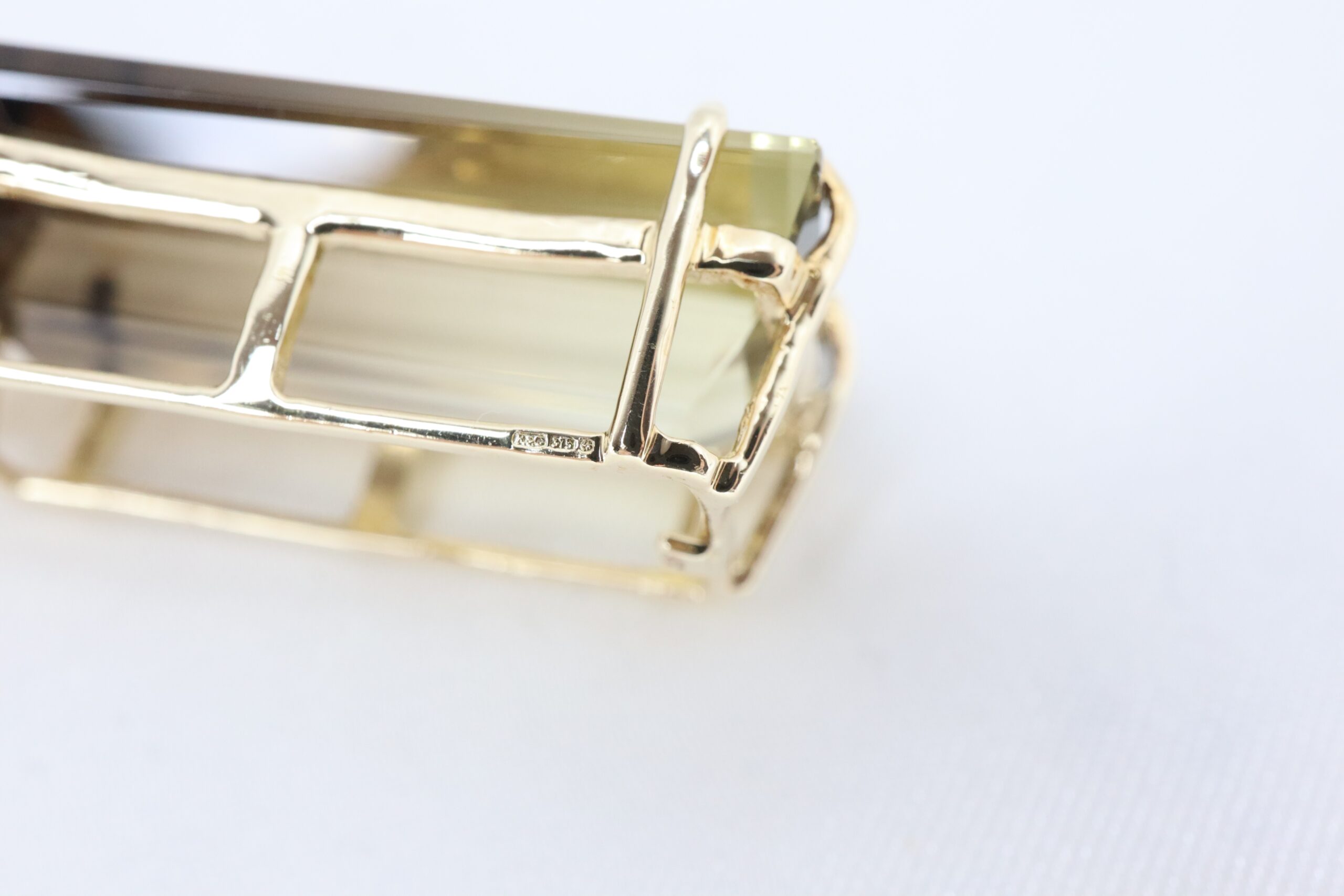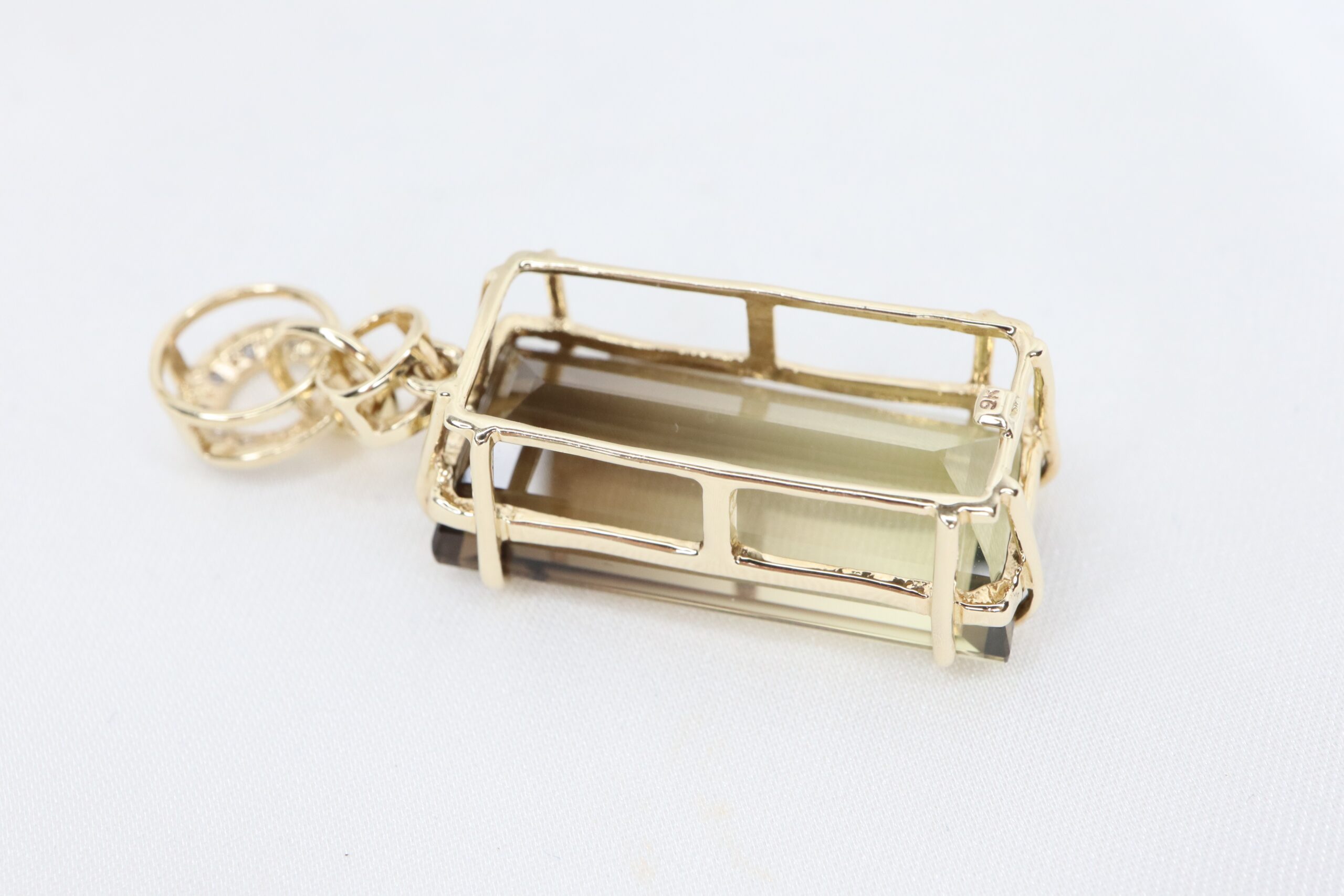 Piękny wisiorek wykonany z 9-karatowego żółtego złota, ozdobiony imponującym, dużym prostokątnym kwarcem dymnym o stopniowanej barwie – od głębokiego brązu po delikatne, złociste odcienie.
