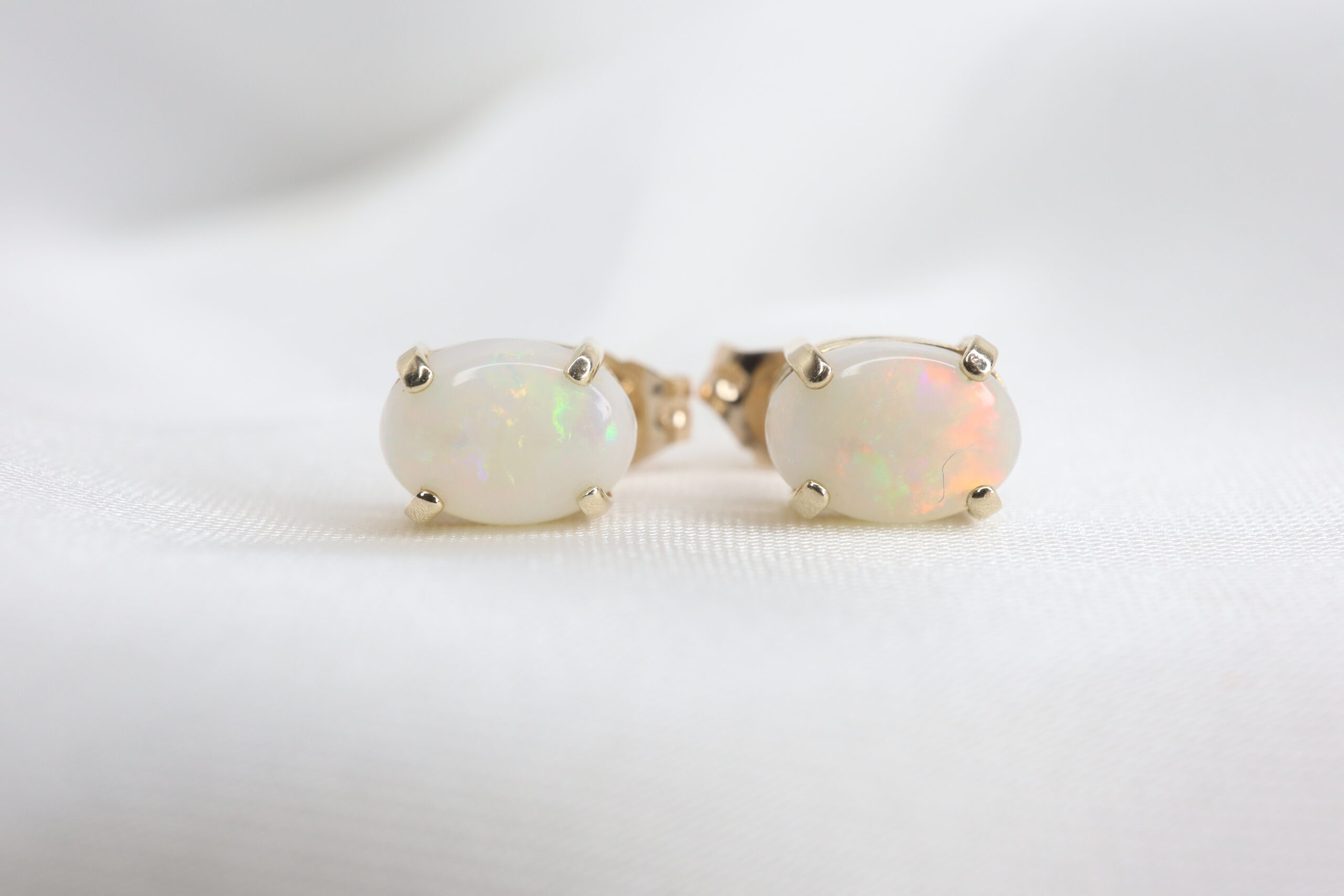 Kamienie mają mlecznobiałą barwę i zachwycają wielobarwną opalizacją — widoczne są złote, różowe, fioletowe, niebieskie i pomarańczowe refleksy.