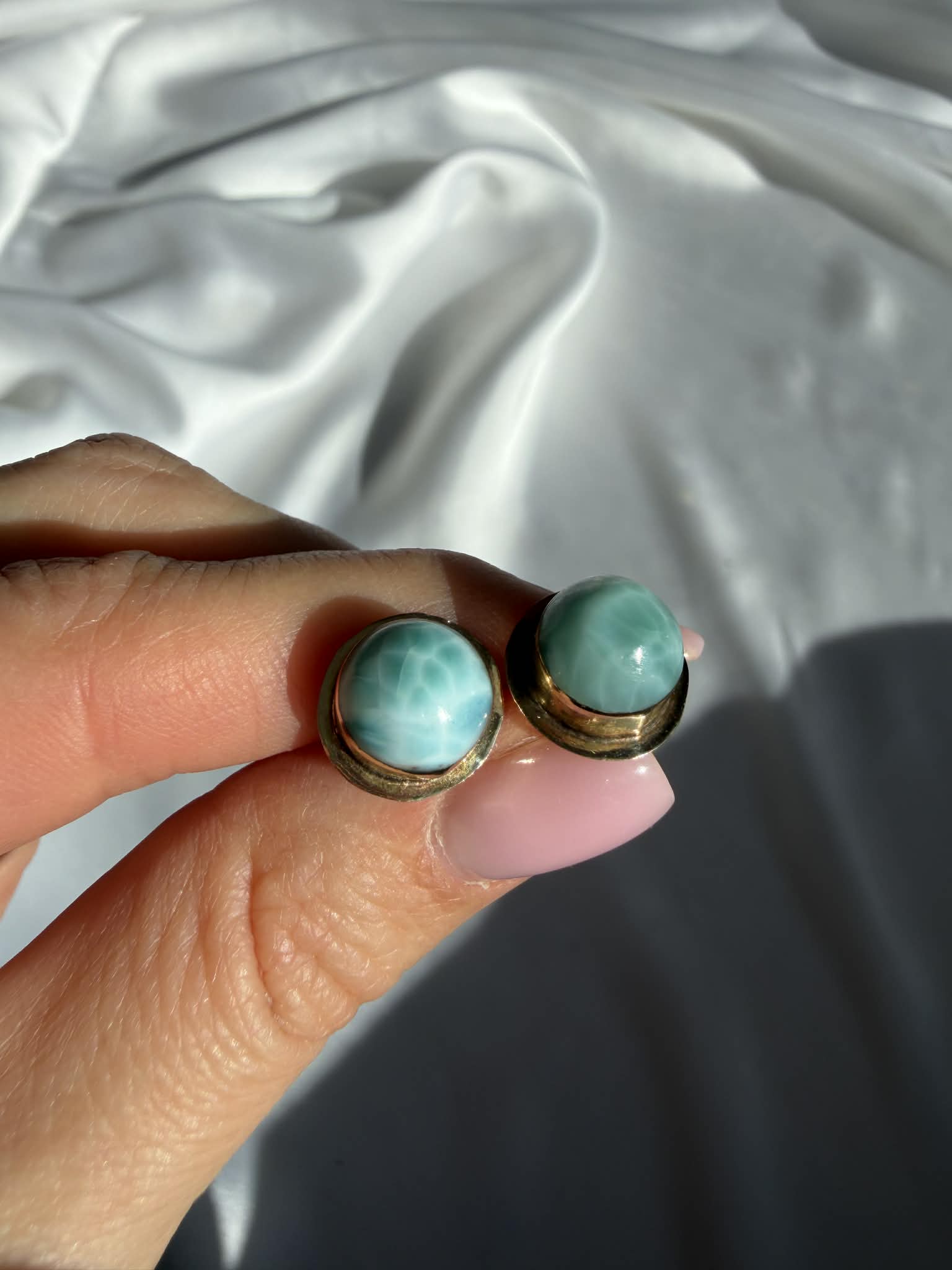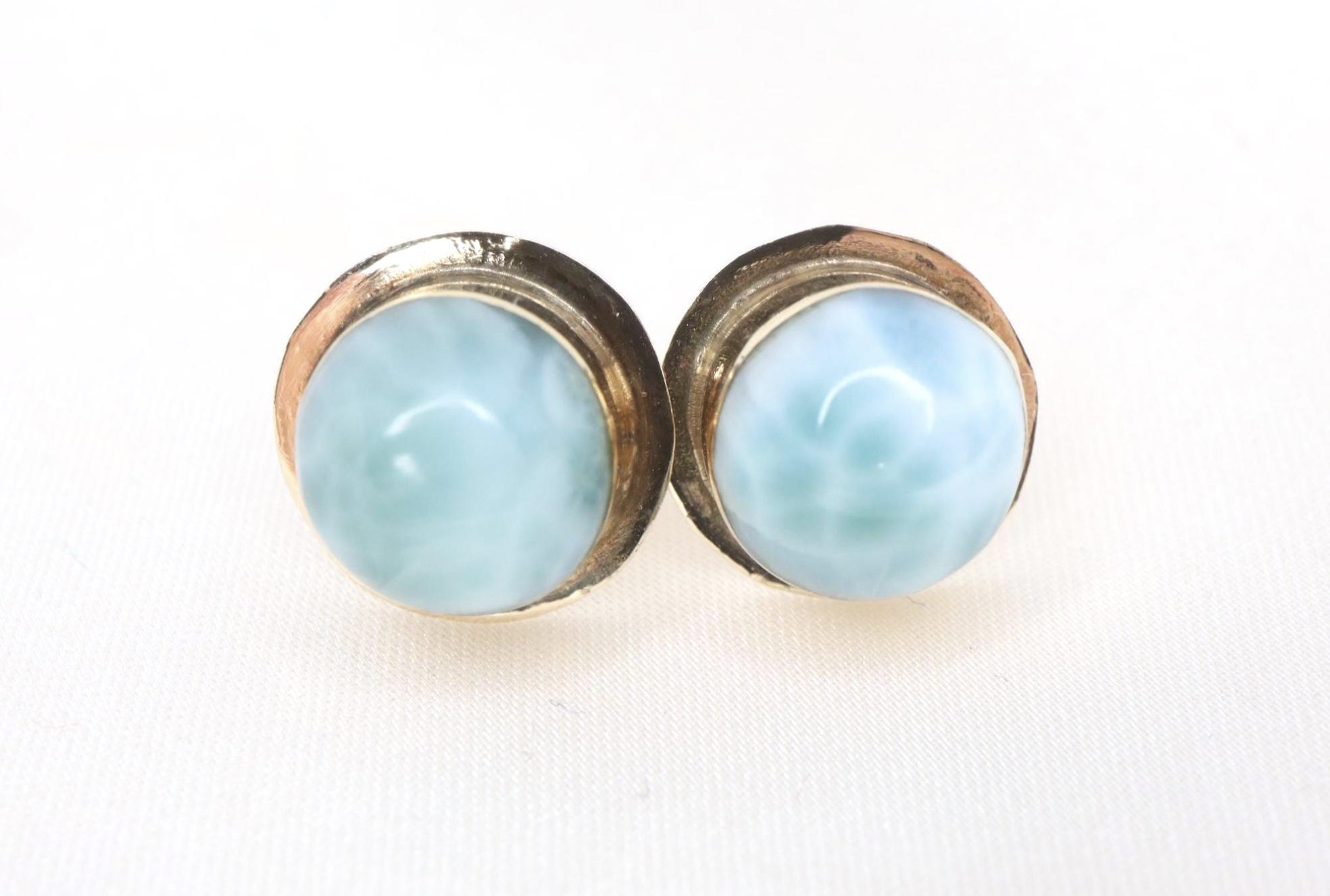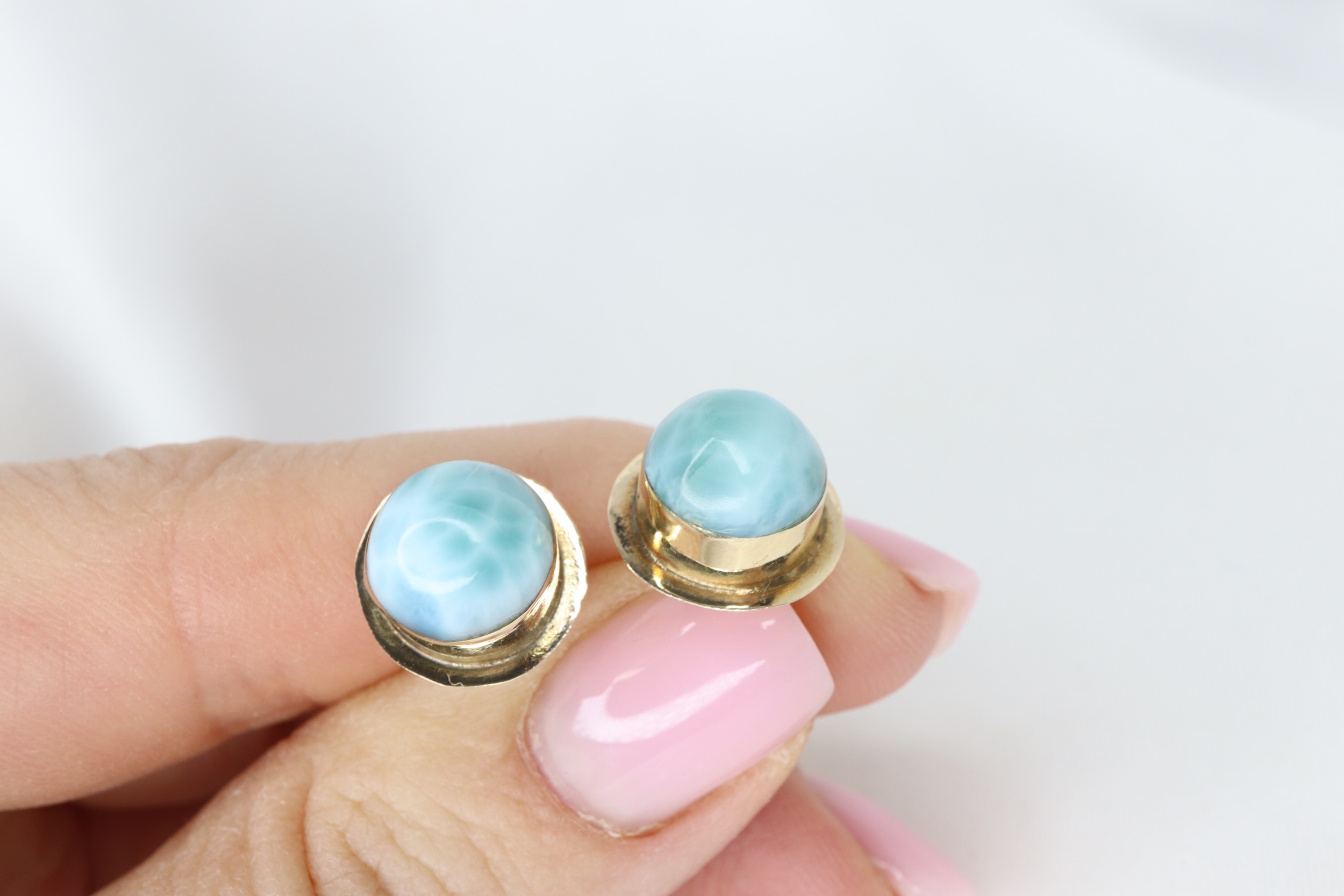 Piękna para unikalnych kolczyków typu sztyfty, ozdobionych okrągłymi kaboszonami larimaru, osadzonymi w oprawie z 9K żółtego złota.
