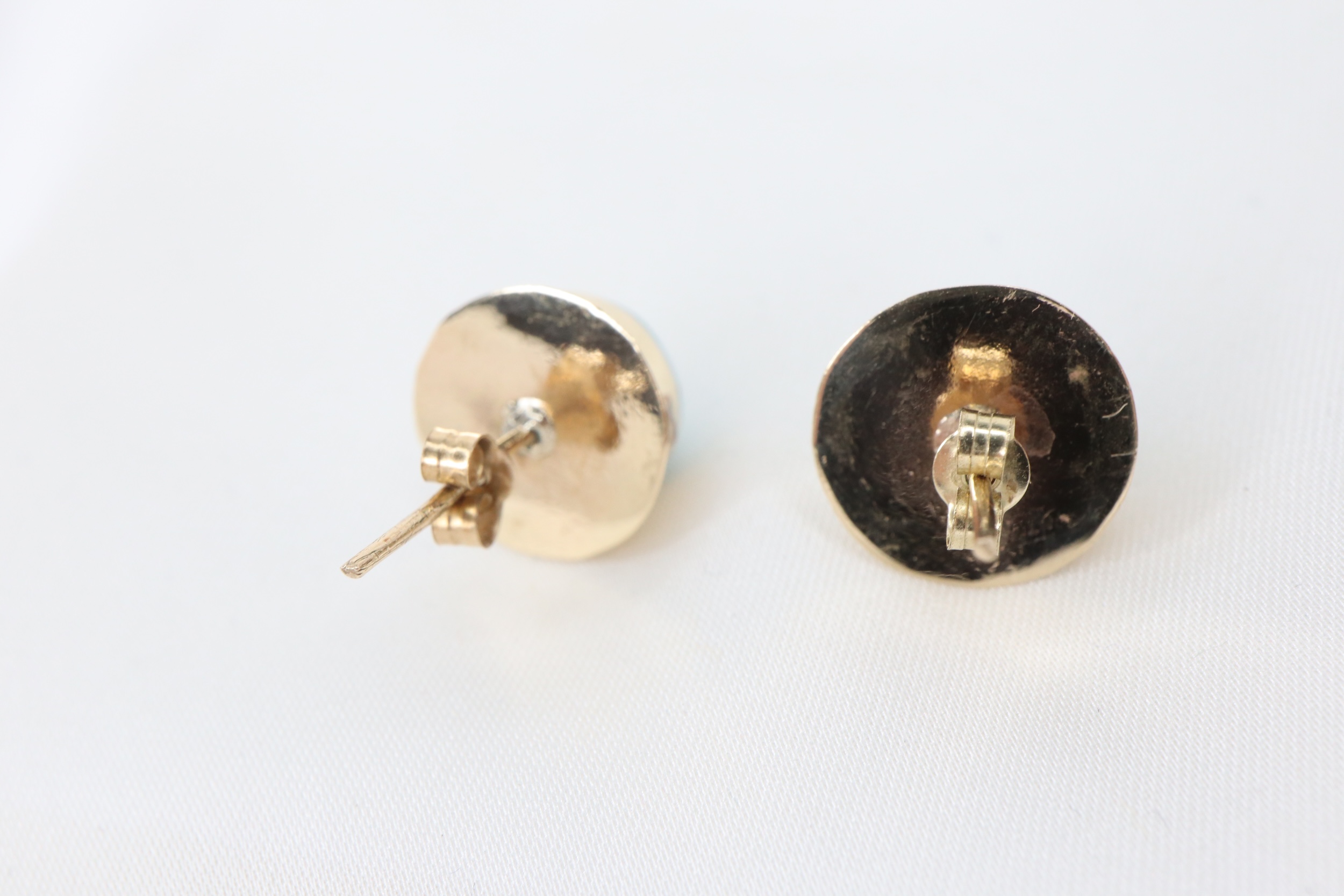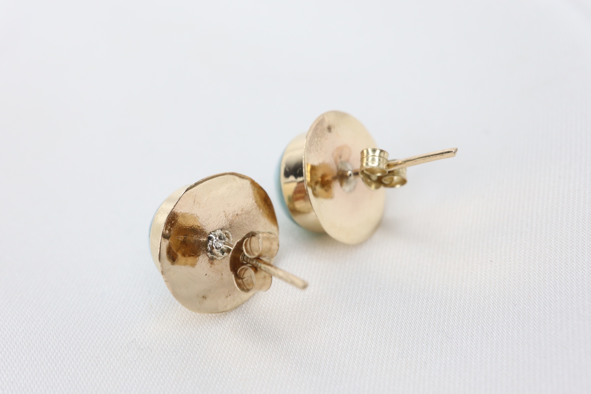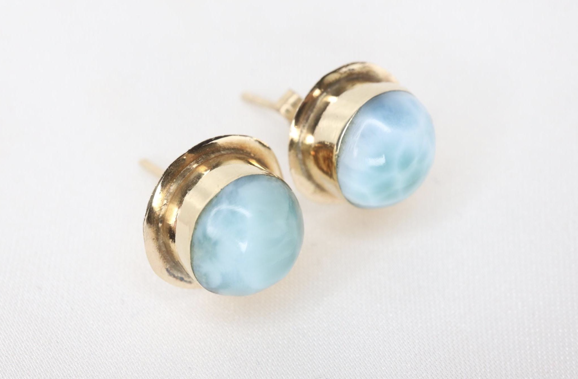 Piękna para unikalnych kolczyków typu sztyfty, ozdobionych okrągłymi kaboszonami larimaru, osadzonymi w oprawie z 9K żółtego złota.