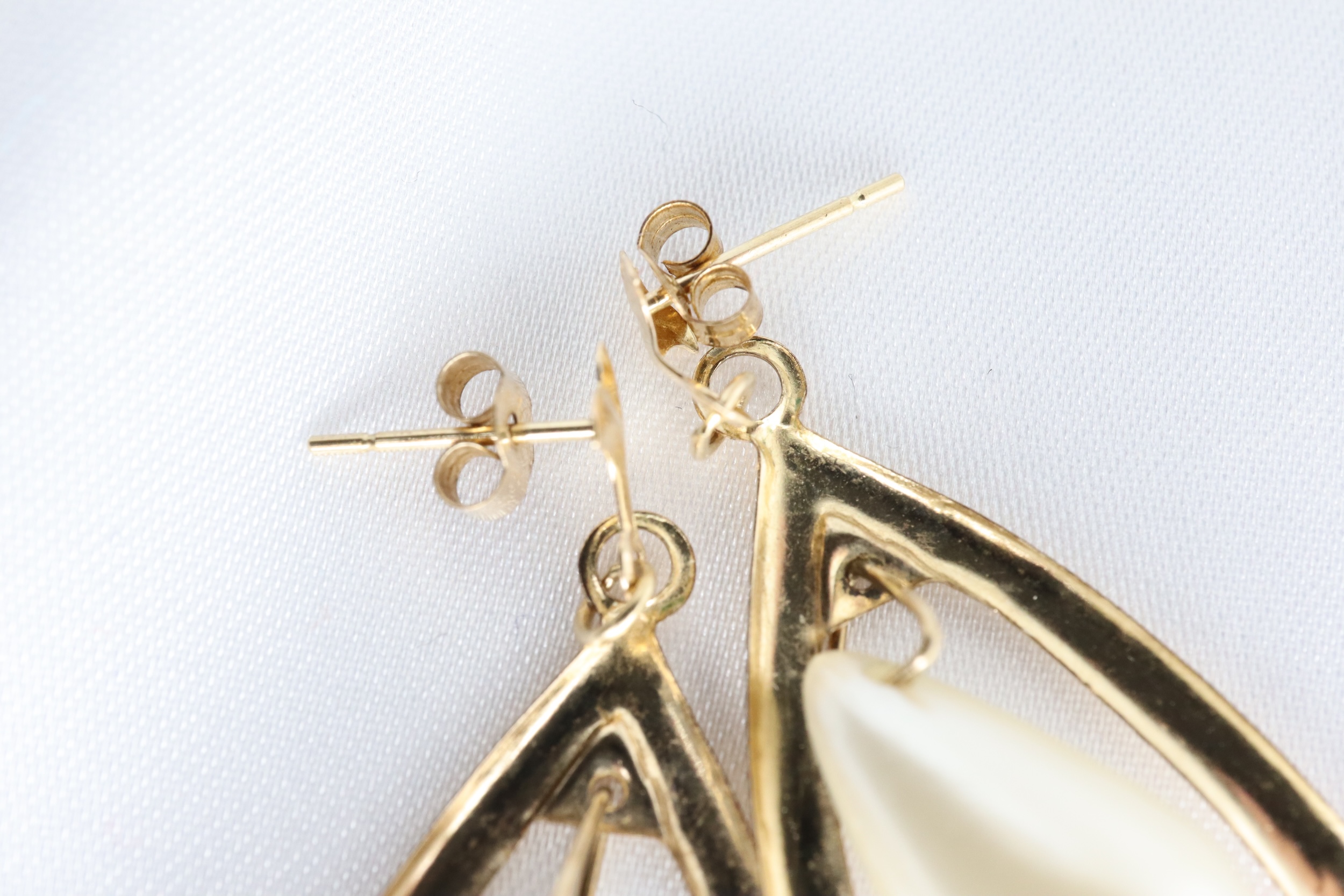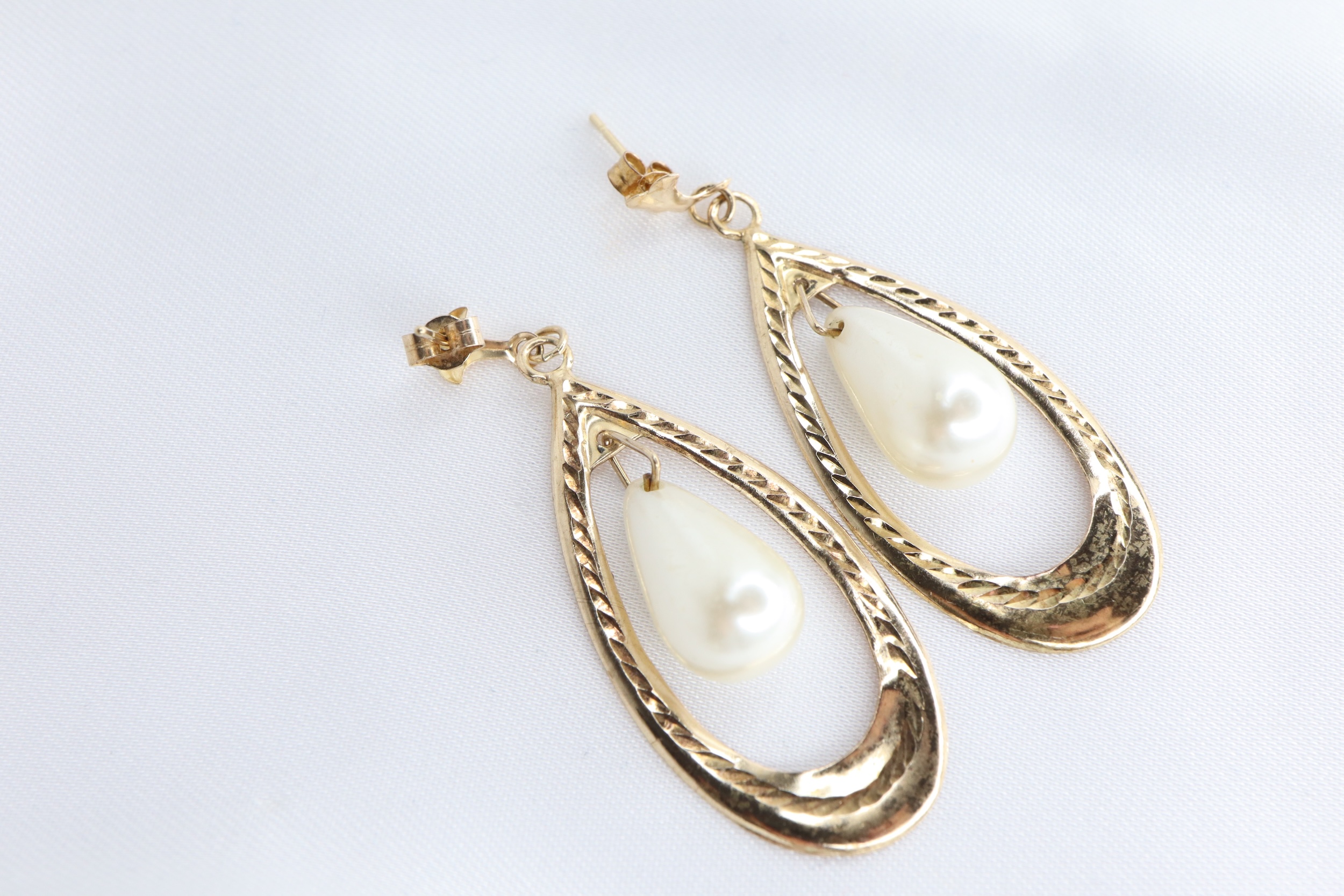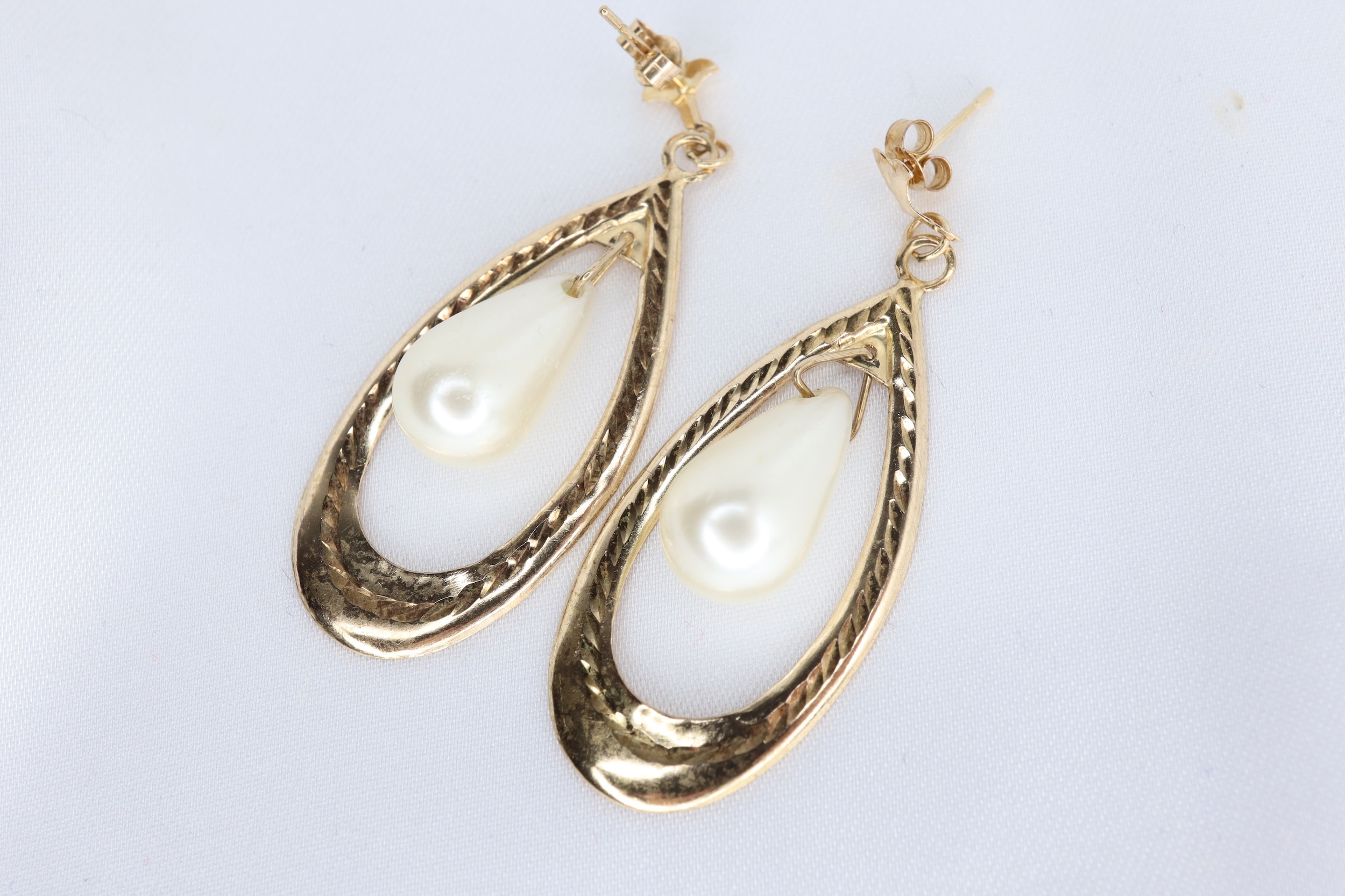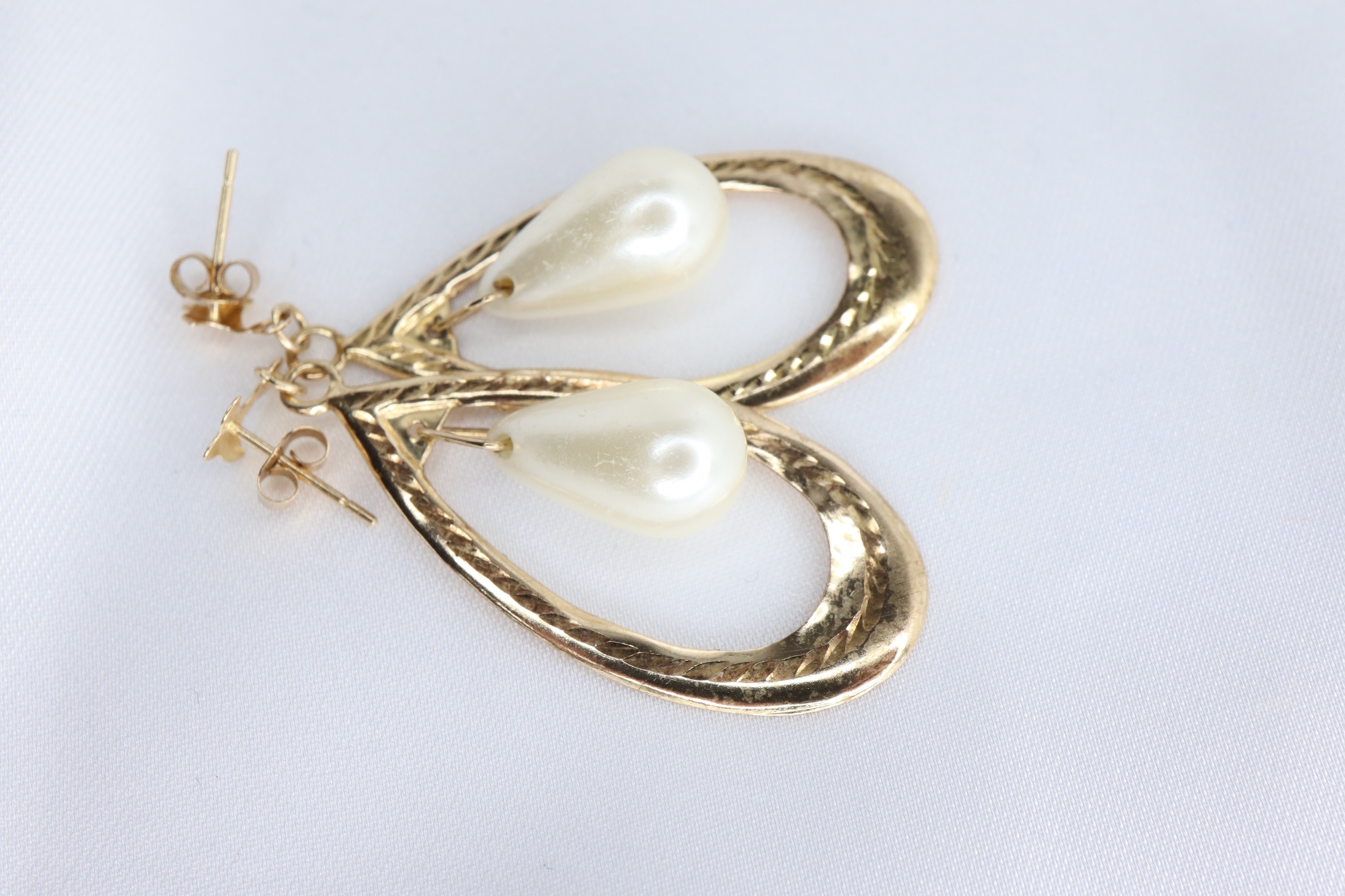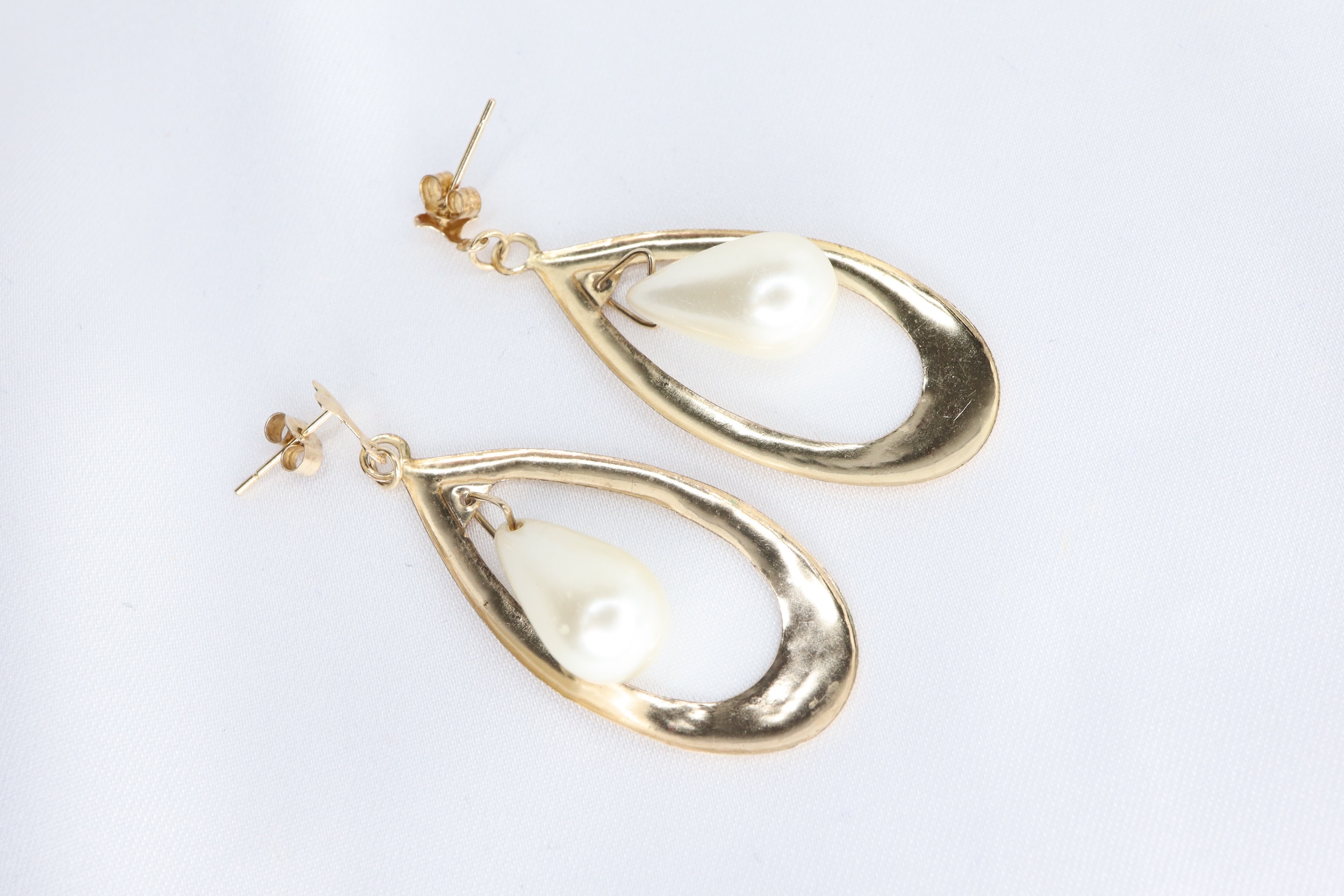 Urocza para lekkich, vintage’owych kolczyków wiszących wykonanych z żółtego złota próby 9 ct, ozdobionych białymi perłami sztucznymi w kształcie kropli (przewiercone), swobodnie zawieszonymi między płaskimi, otwartymi panelami.