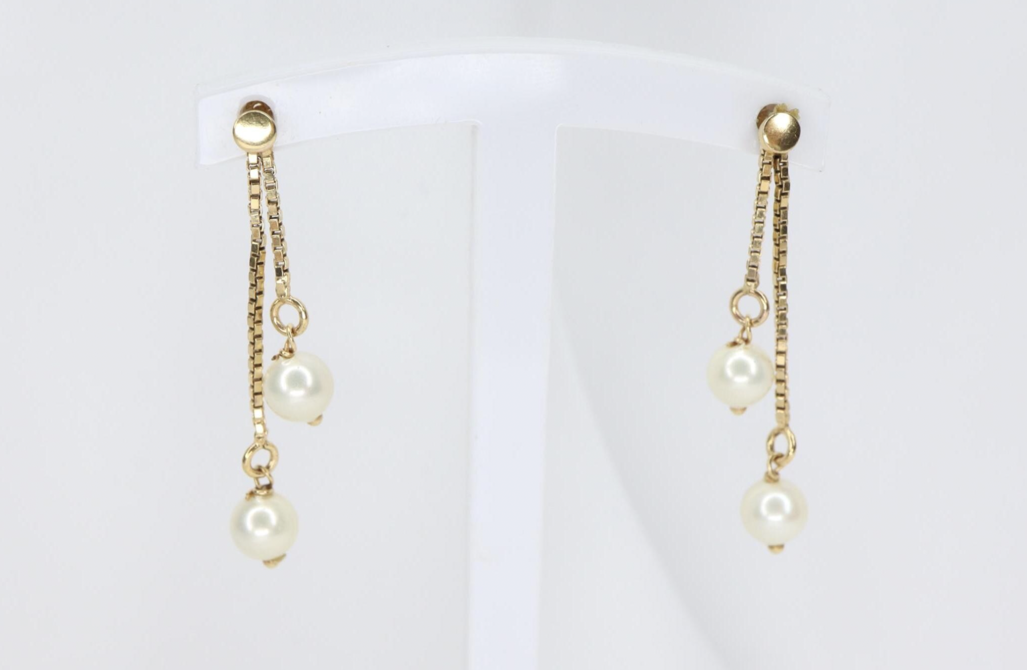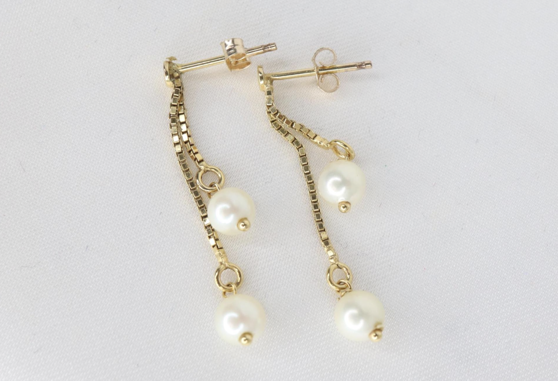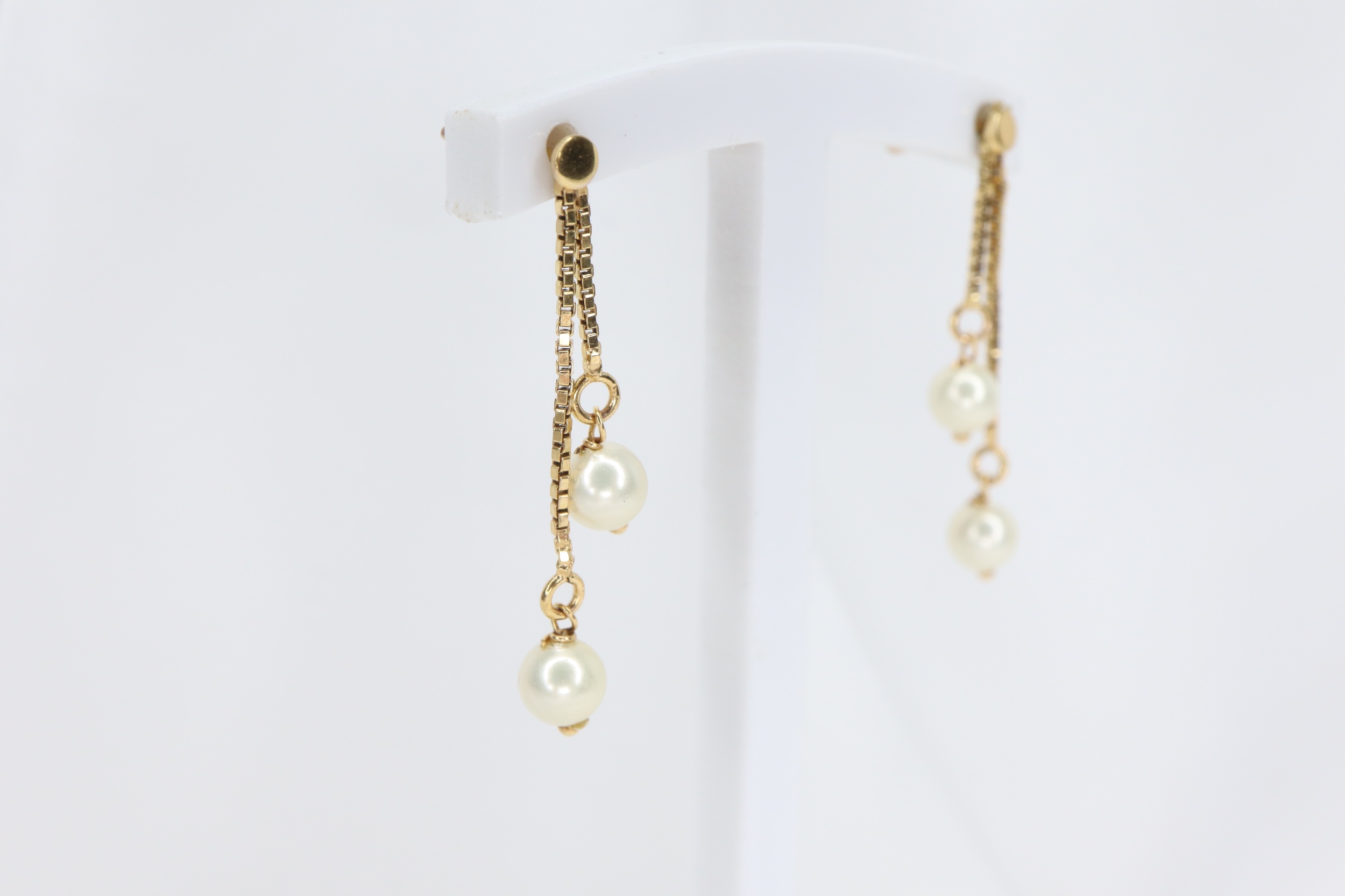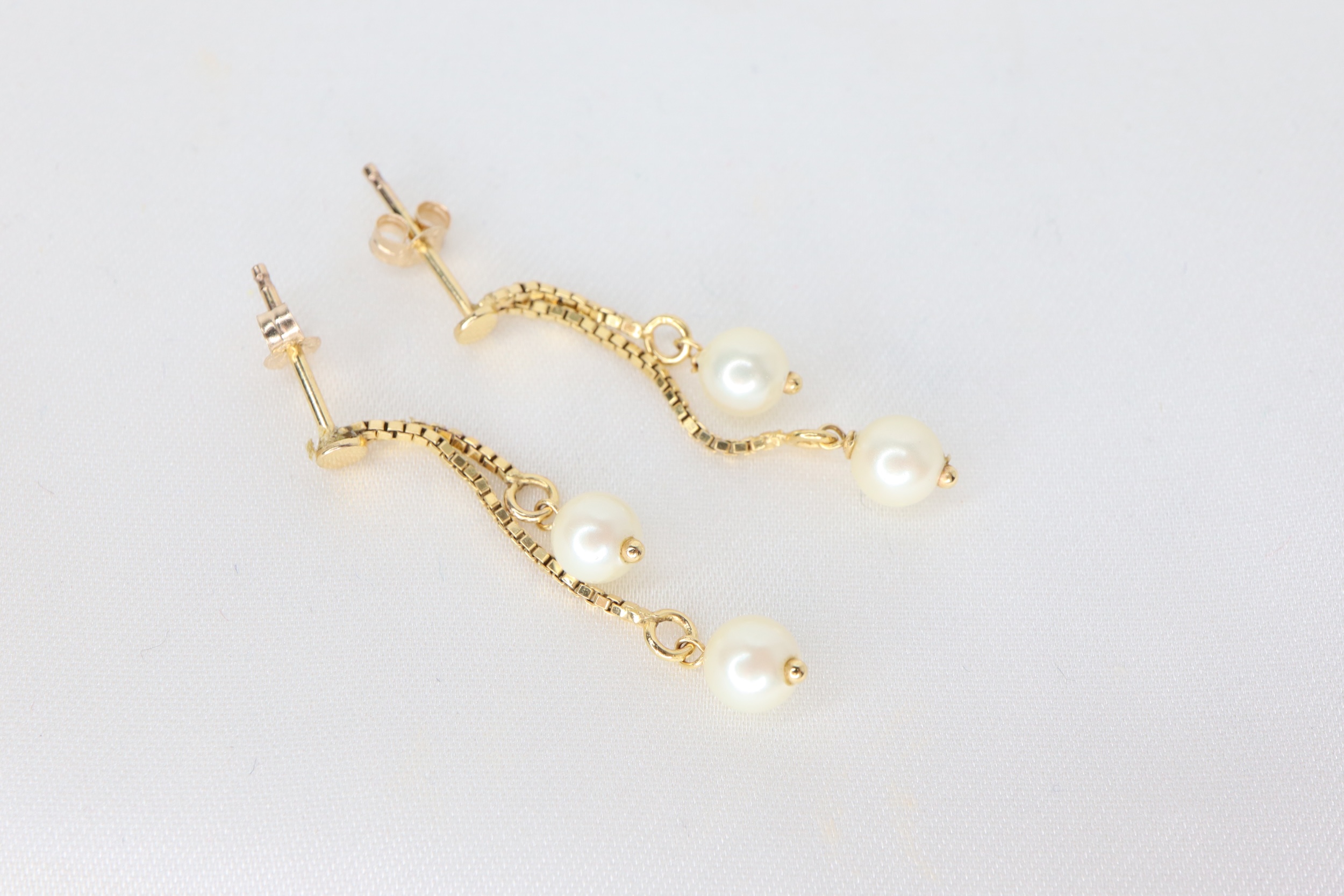 Wspaniała para kolczyków vintage wykonanych z 9-karatowego żółtego złota, ozdobionych kremowymi perłami hodowlanymi, zawieszonymi na delikatnych, podwójnych łańcuszkach typu box.
