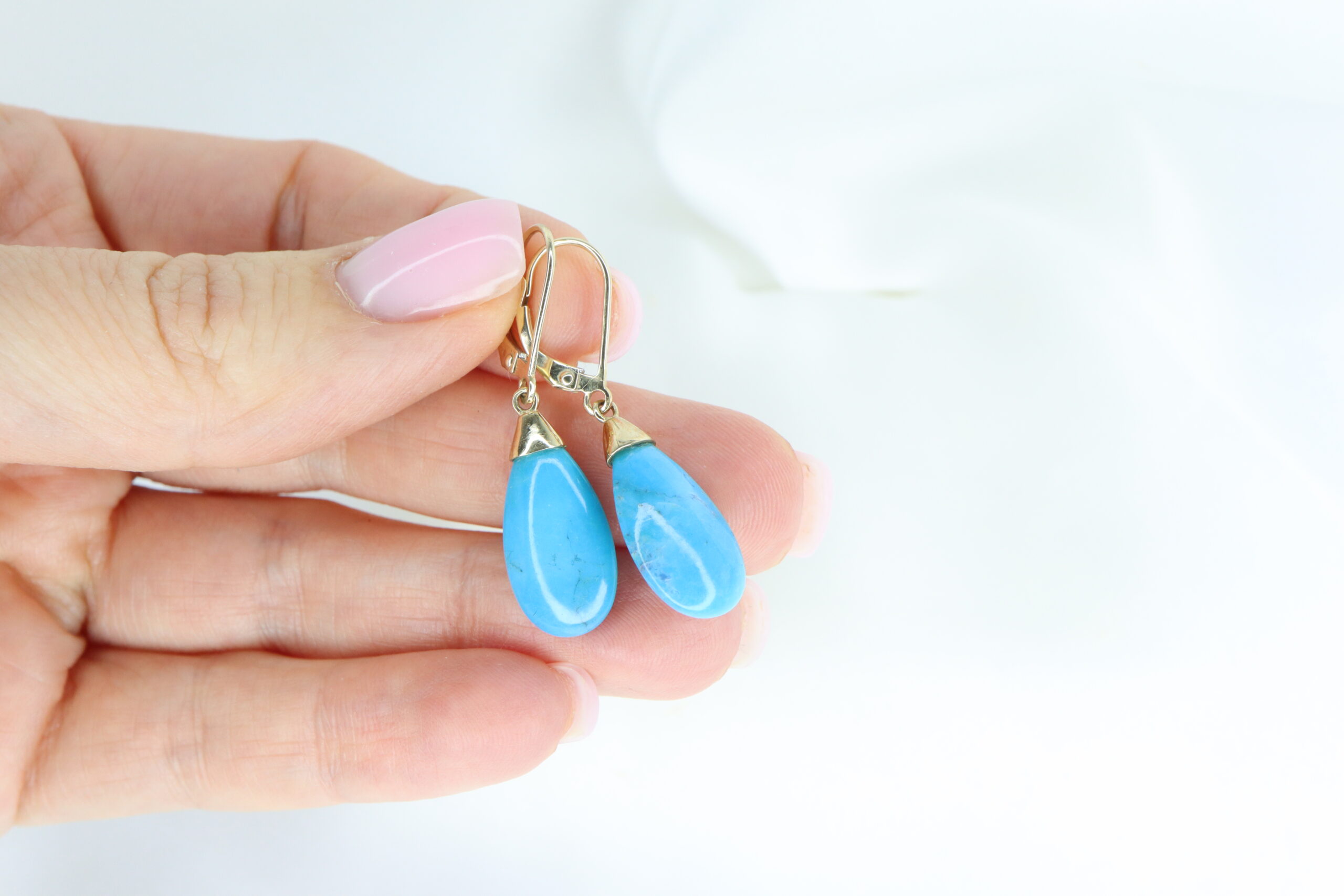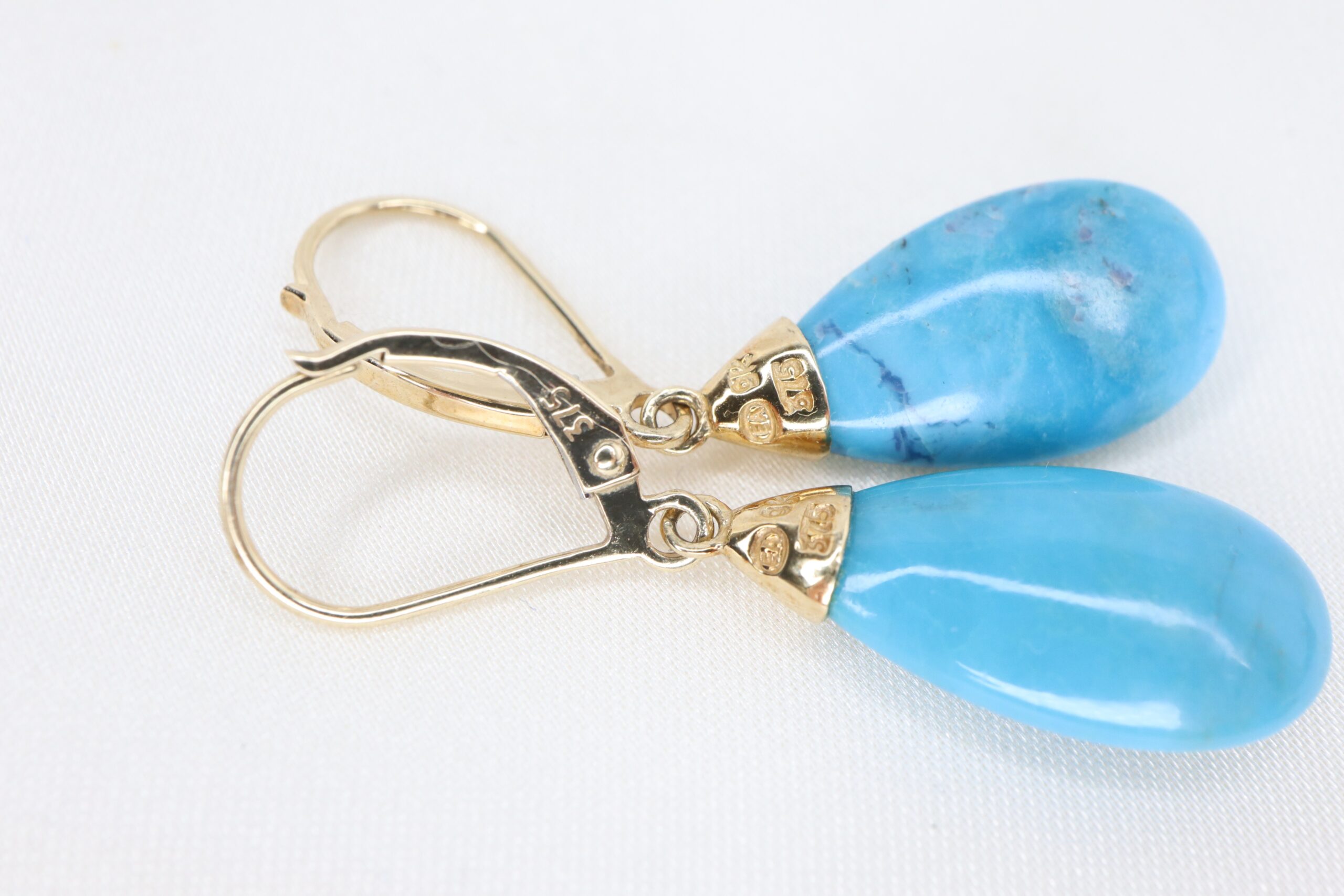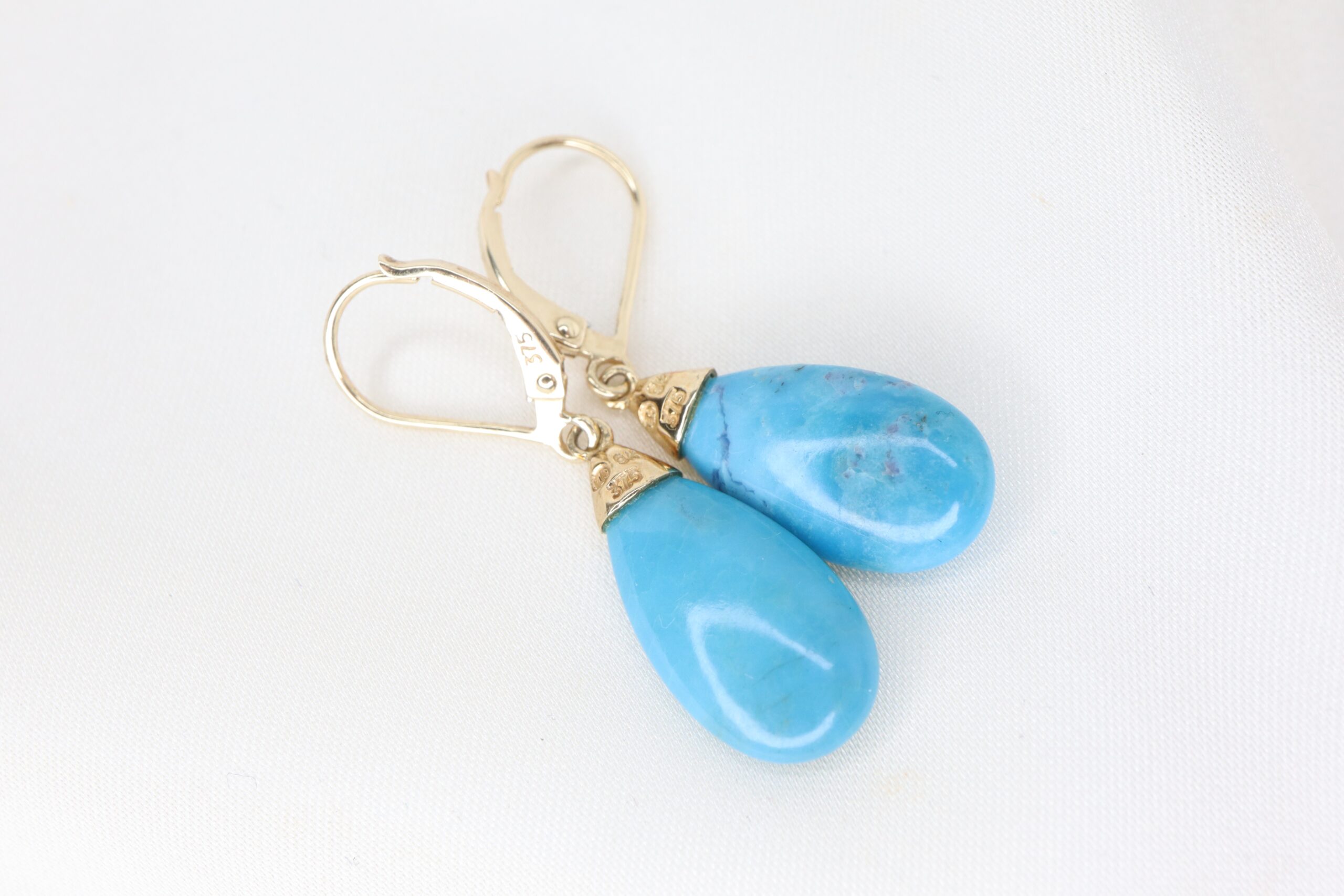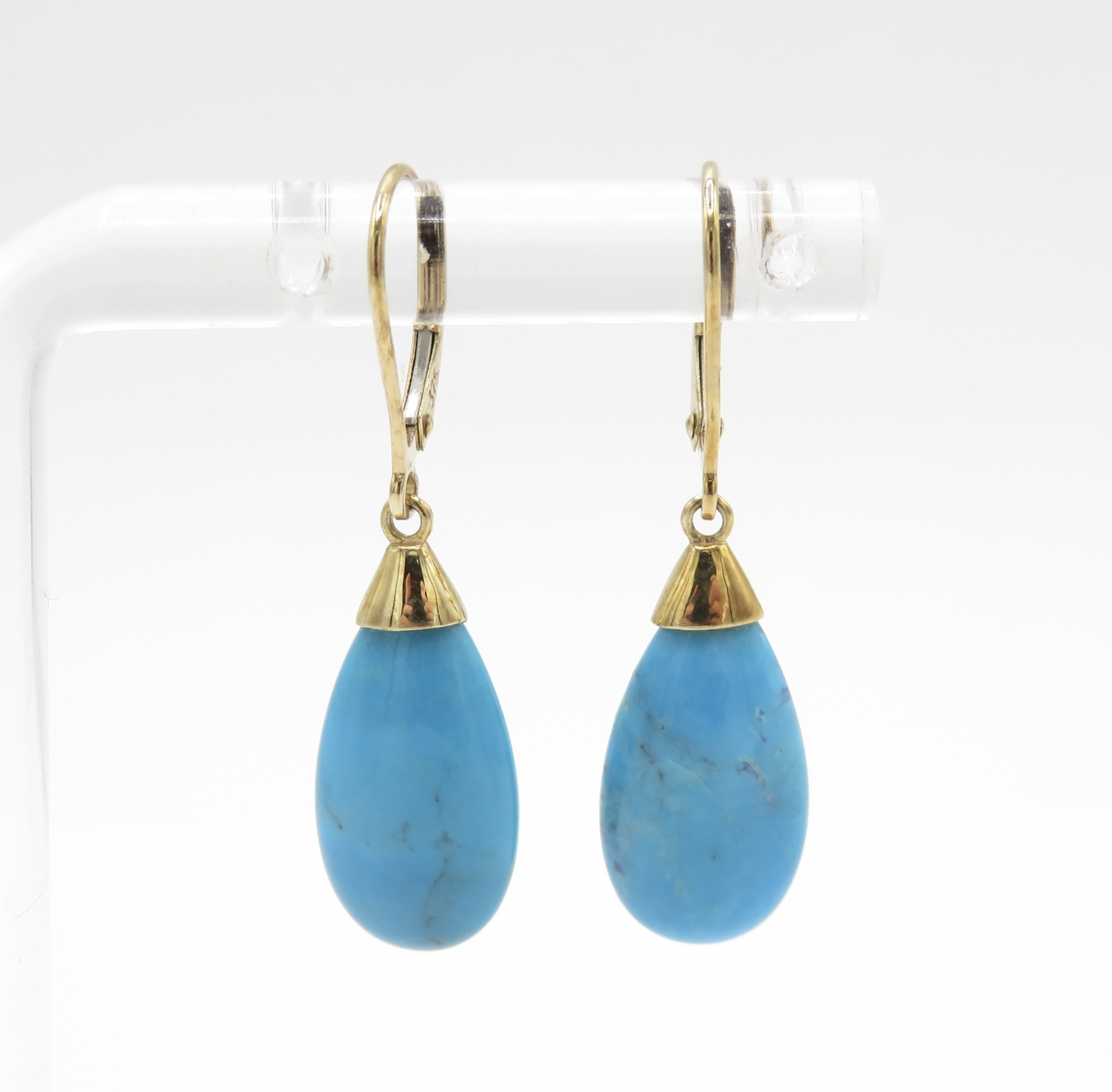 Piękna para kolczyków z turkusem w kształcie łezki, oprawionych u góry w 9-karatowe żółte złoto i wykończonych bezpiecznym zapięciem typu angielskiego (leverback).
