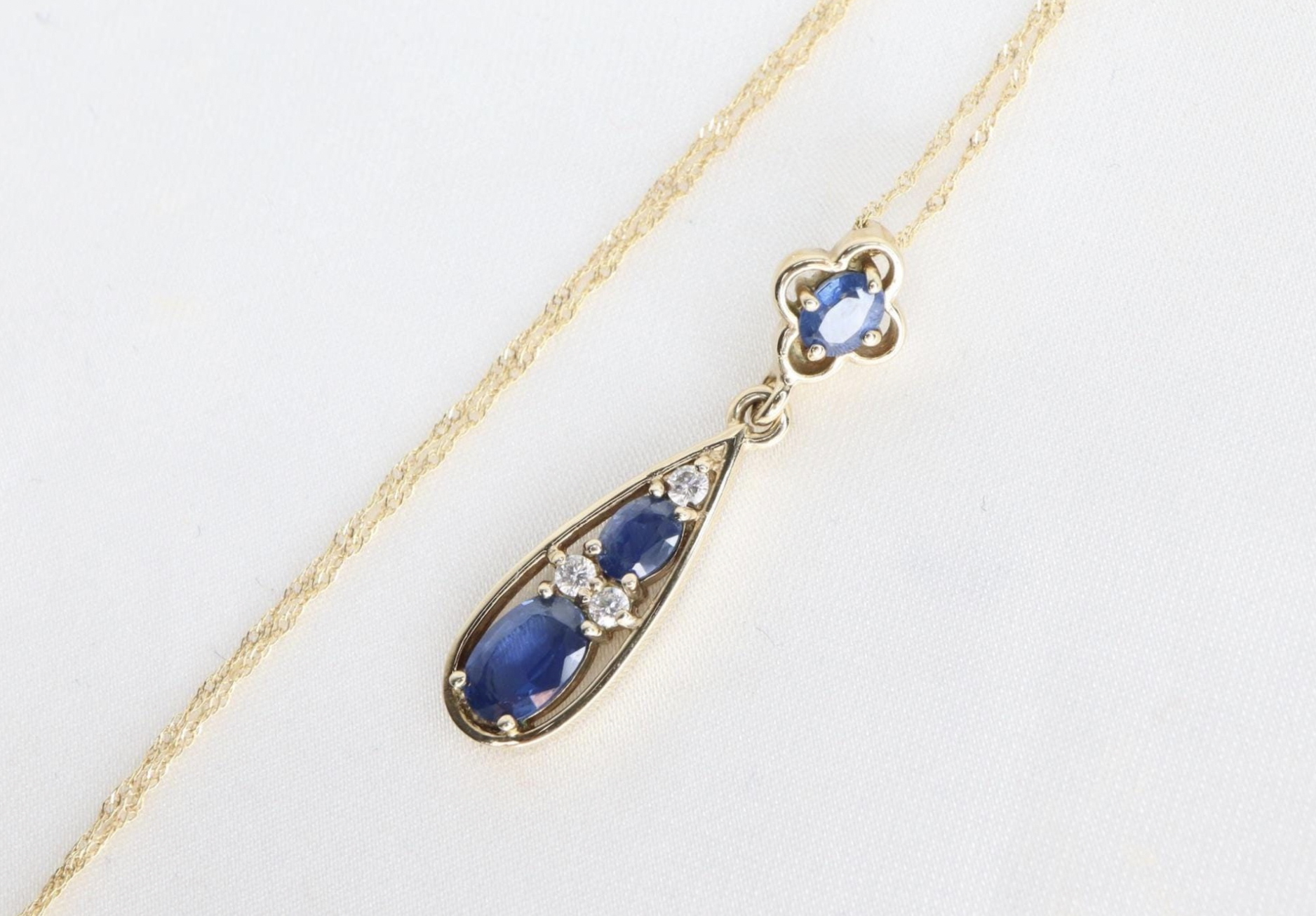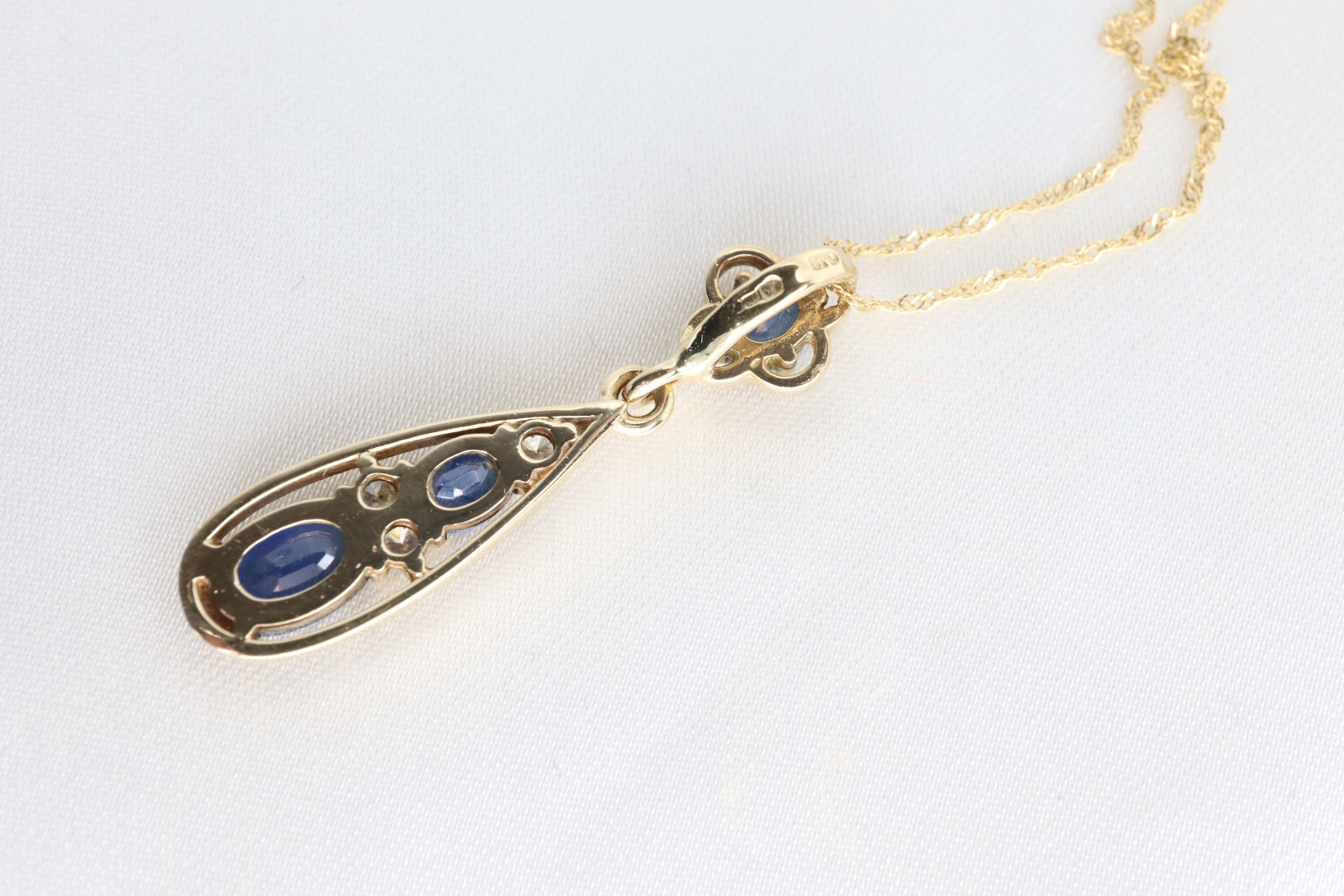 Wspaniały naszyjnik z wisiorkiem wykonanym z 9-karatowego złota, z kompozycją szafirów w odcieniu średniego błękitu oraz diamentów, zawieszony na delikatnym łańcuszku o długości 45 cm. Górna część wisiorka ma formę kwiatowego elementu z oprawionym szafirem (zawieszka), który przechodzi w efektowną łezkowatą kompozycję.