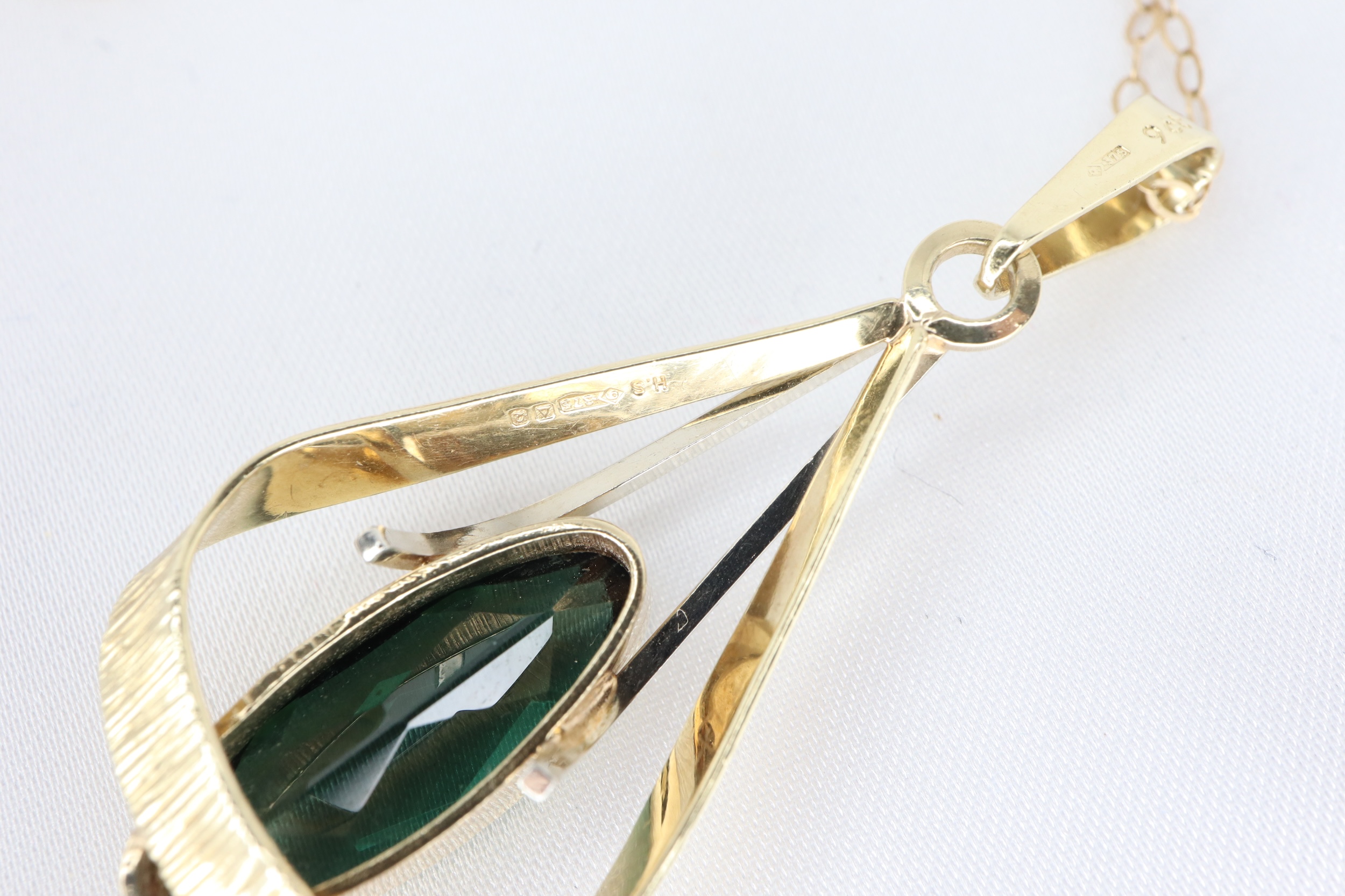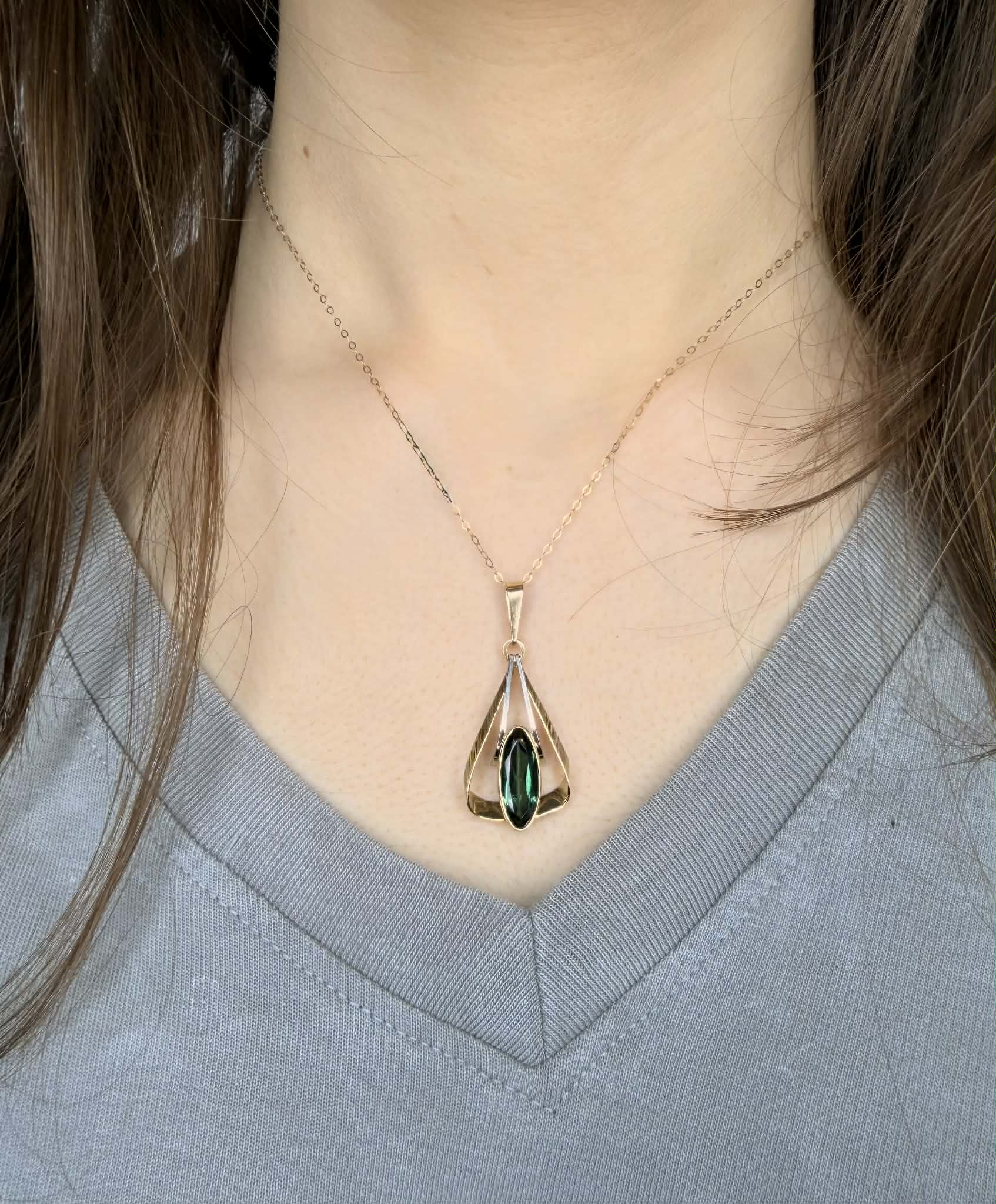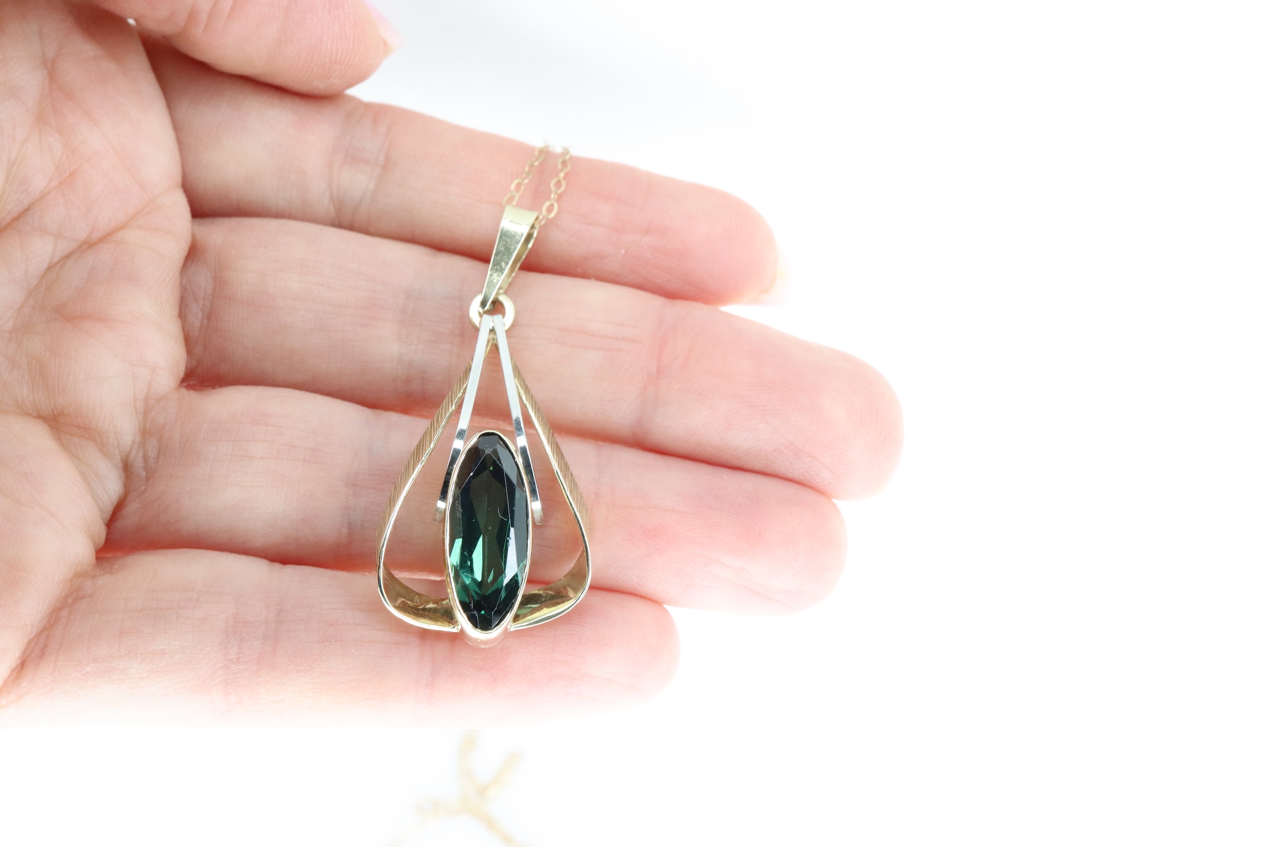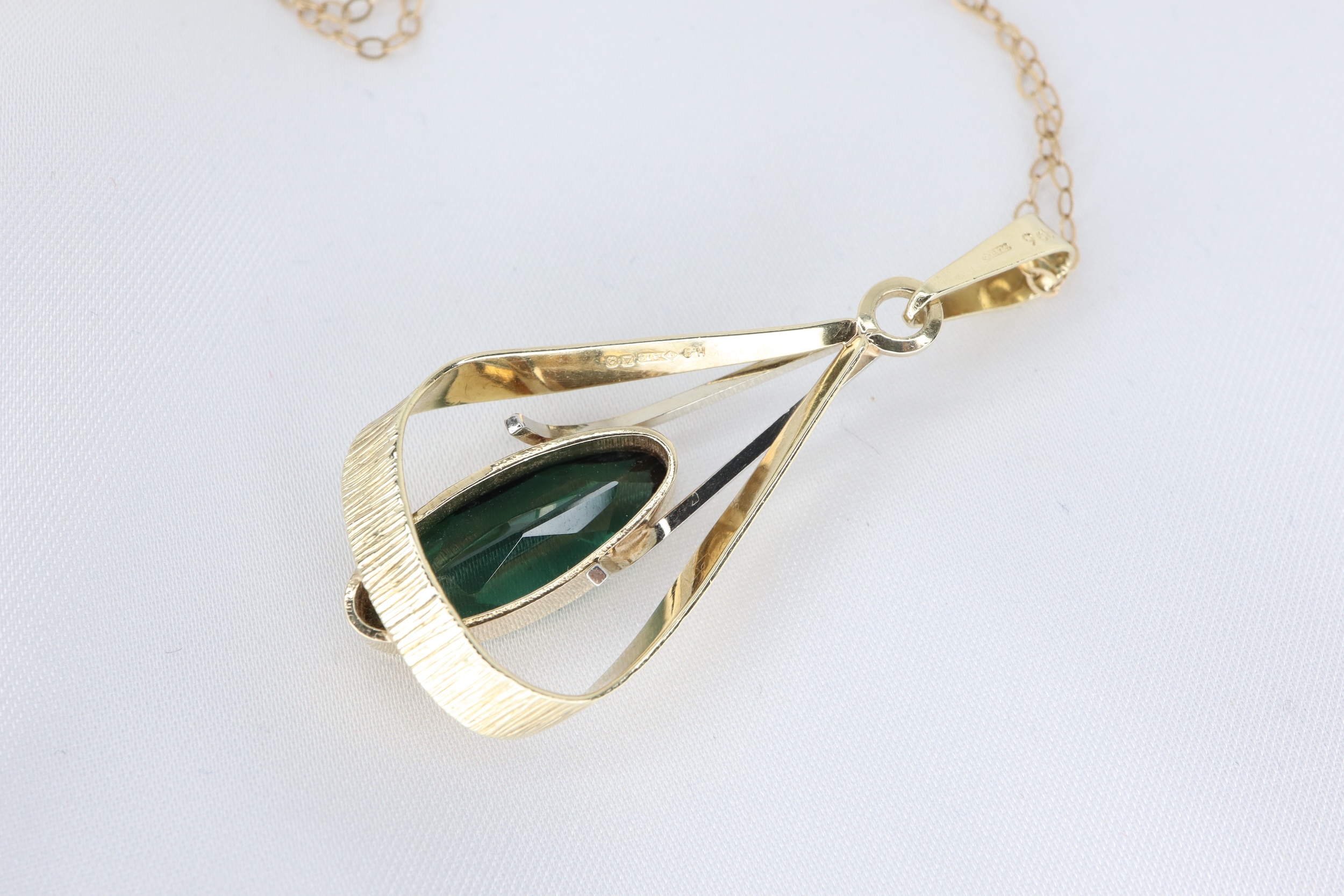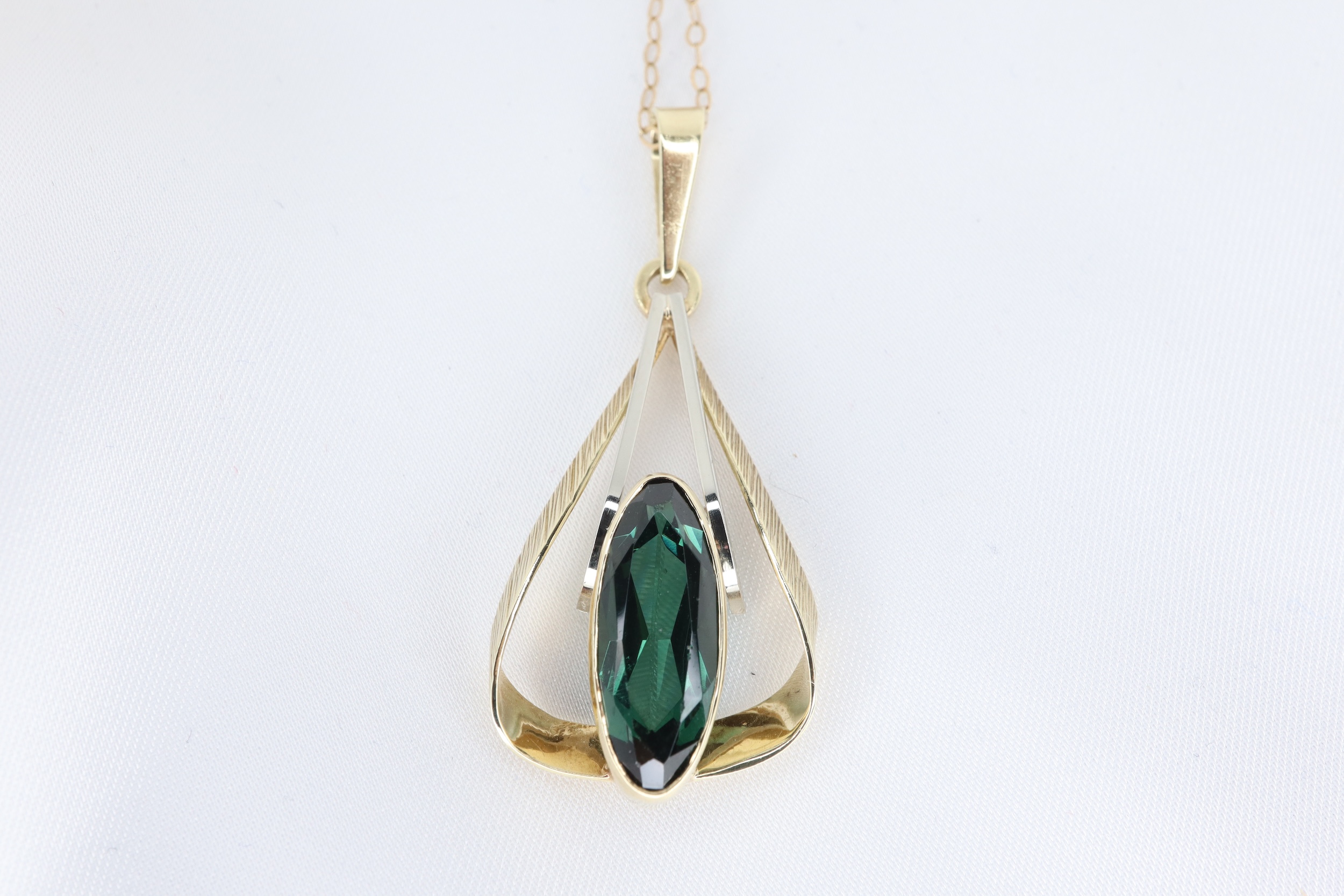 Wspaniała duża zawieszka wykonana z 9-karatowego żółtego złota, ozdobiona owalnym spinelem o intensywnie zielonej barwie (17 × 7 mm).