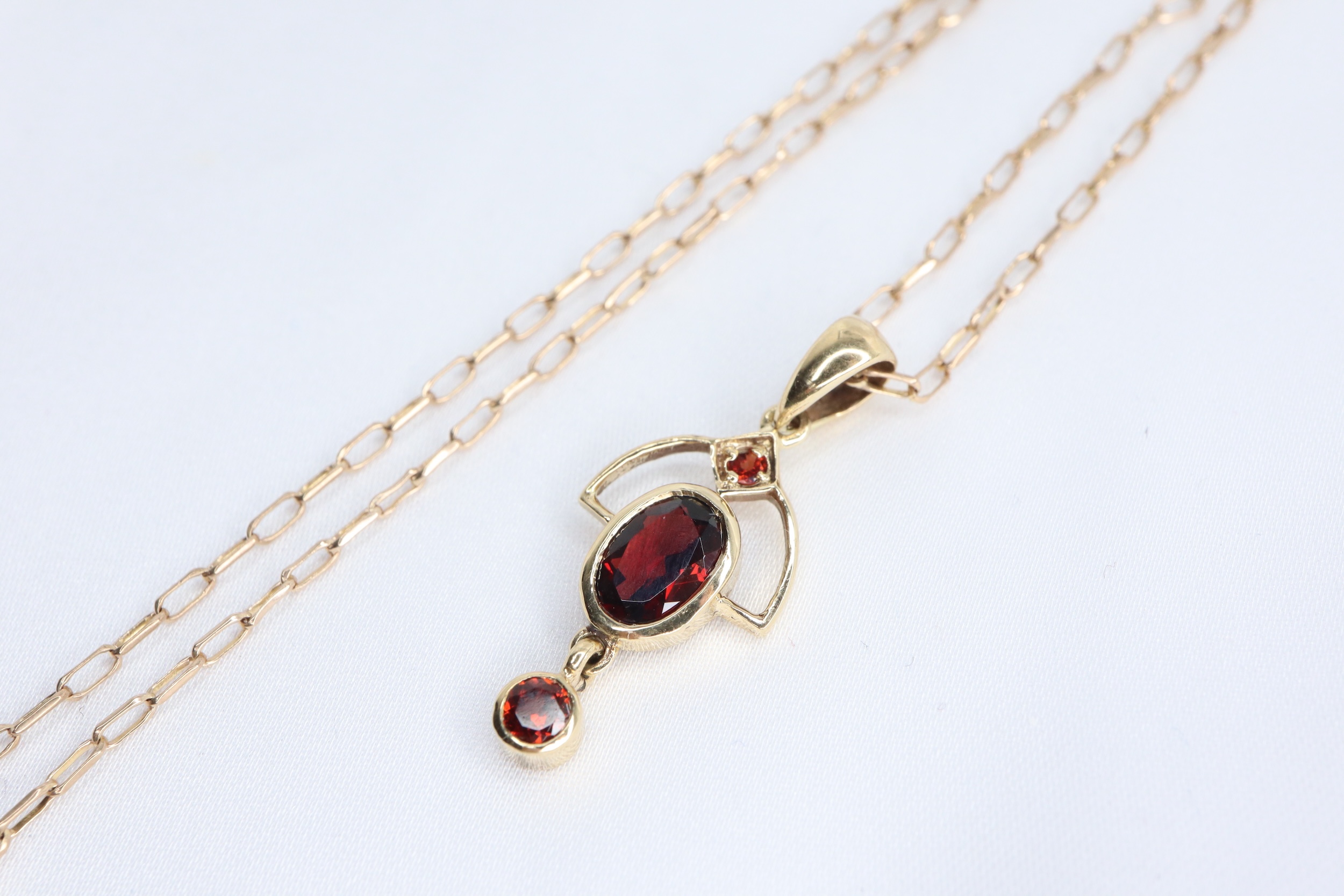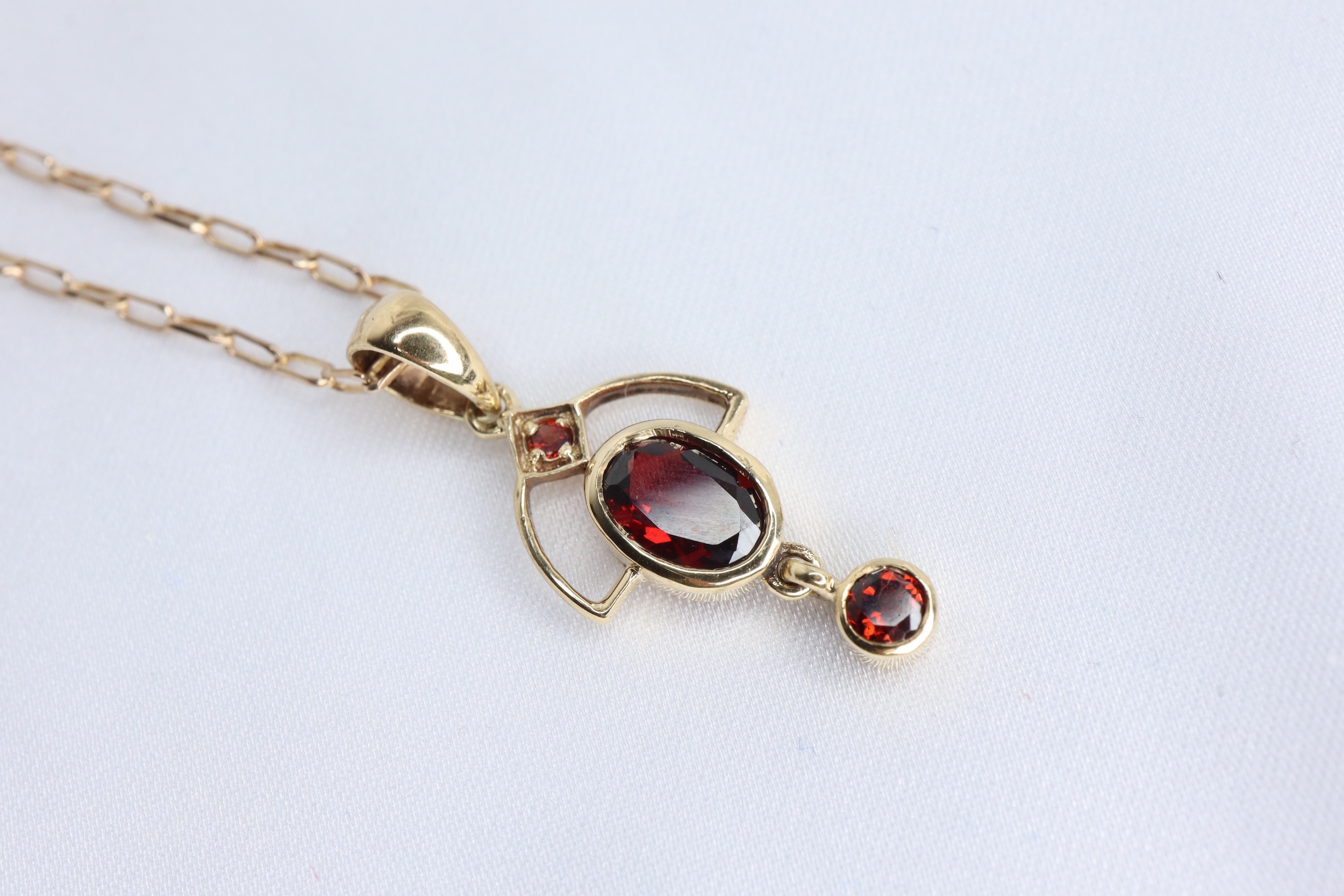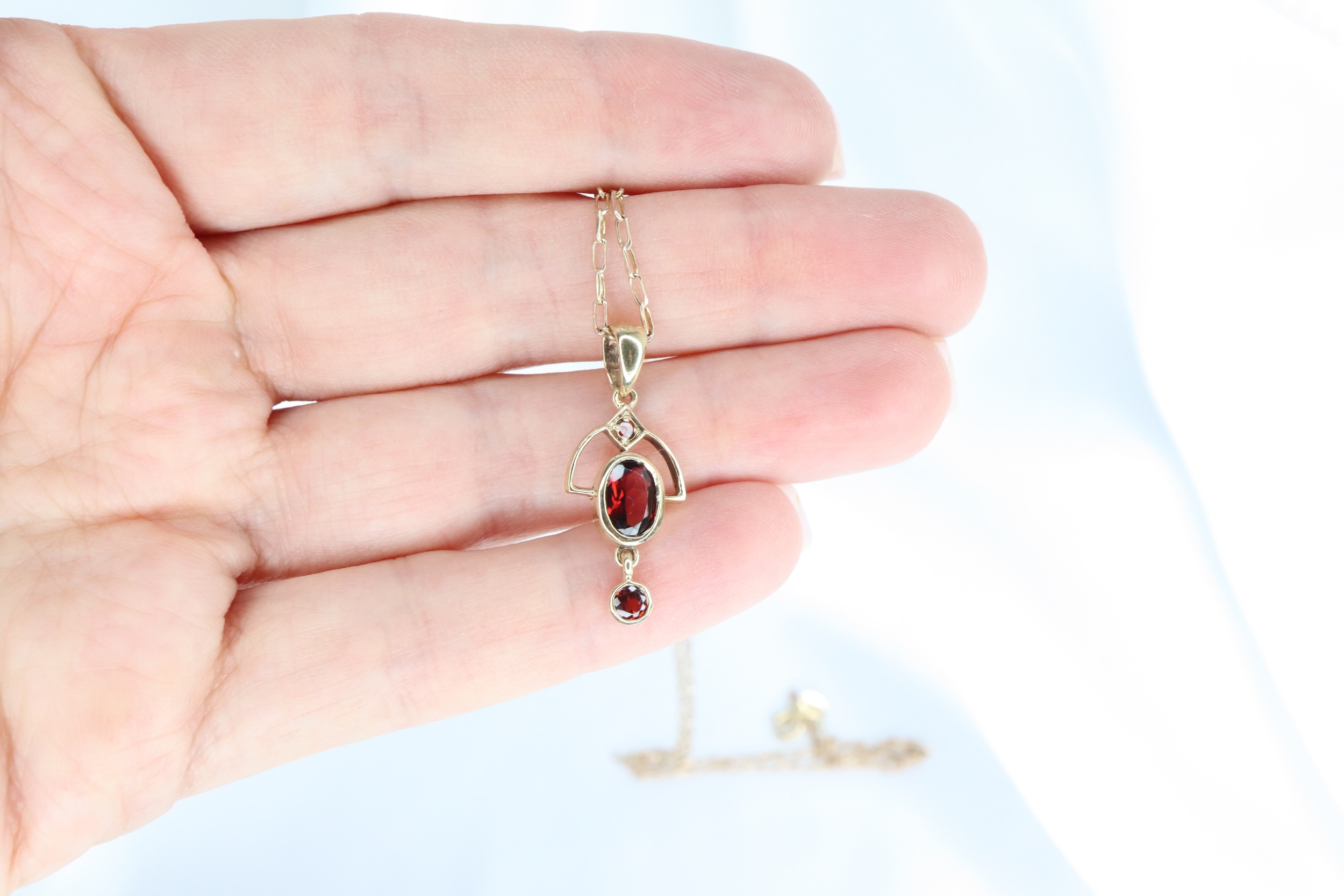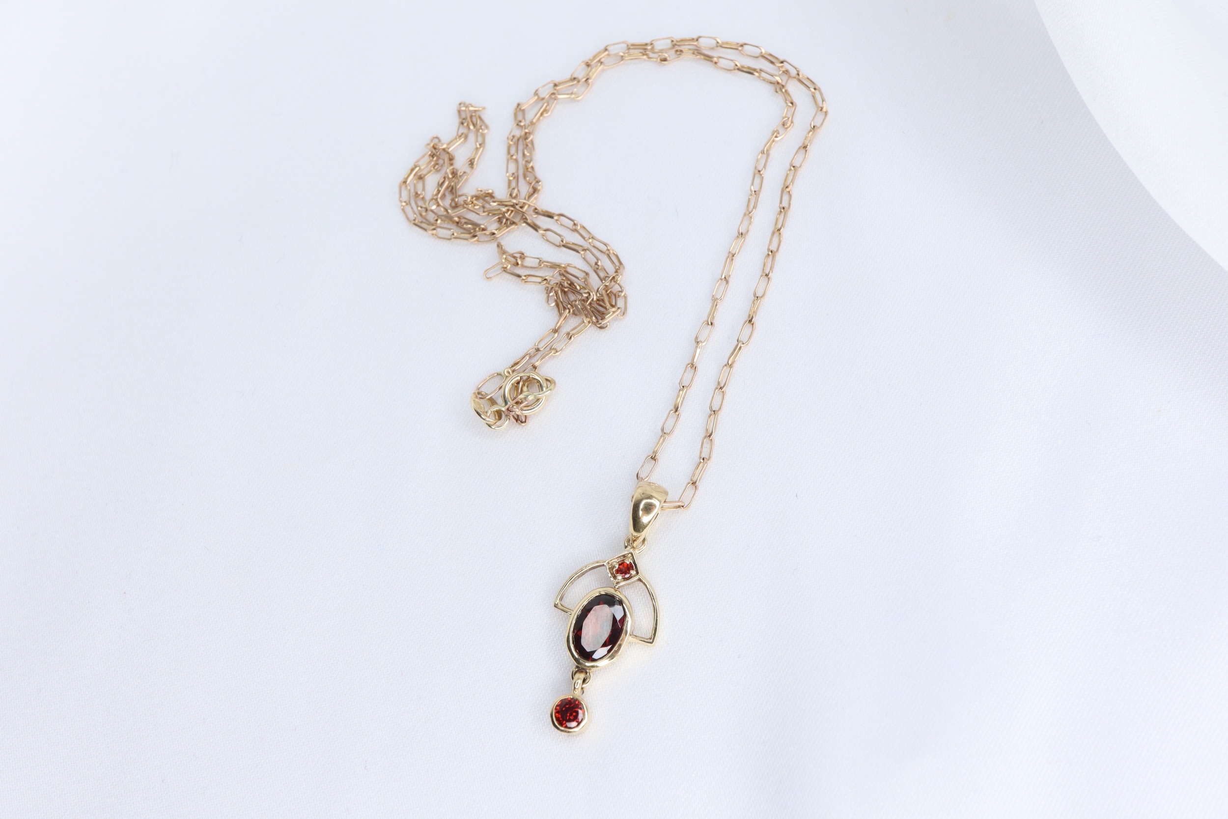 Zawieszka ozdobiona jest pięknym owalnym granatem o głębokim, krwistoczerwonym kolorze, oprawionym w elegancką geometryczną formę.Kompozycję uzupełnia mały okrągły granat u góry oraz większy okrągły granat delikatnie zawieszony w dolnej części, który dodaje biżuterii lekkości i subtelnego ruchu.
