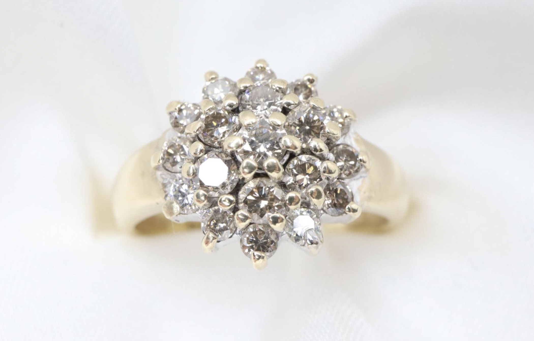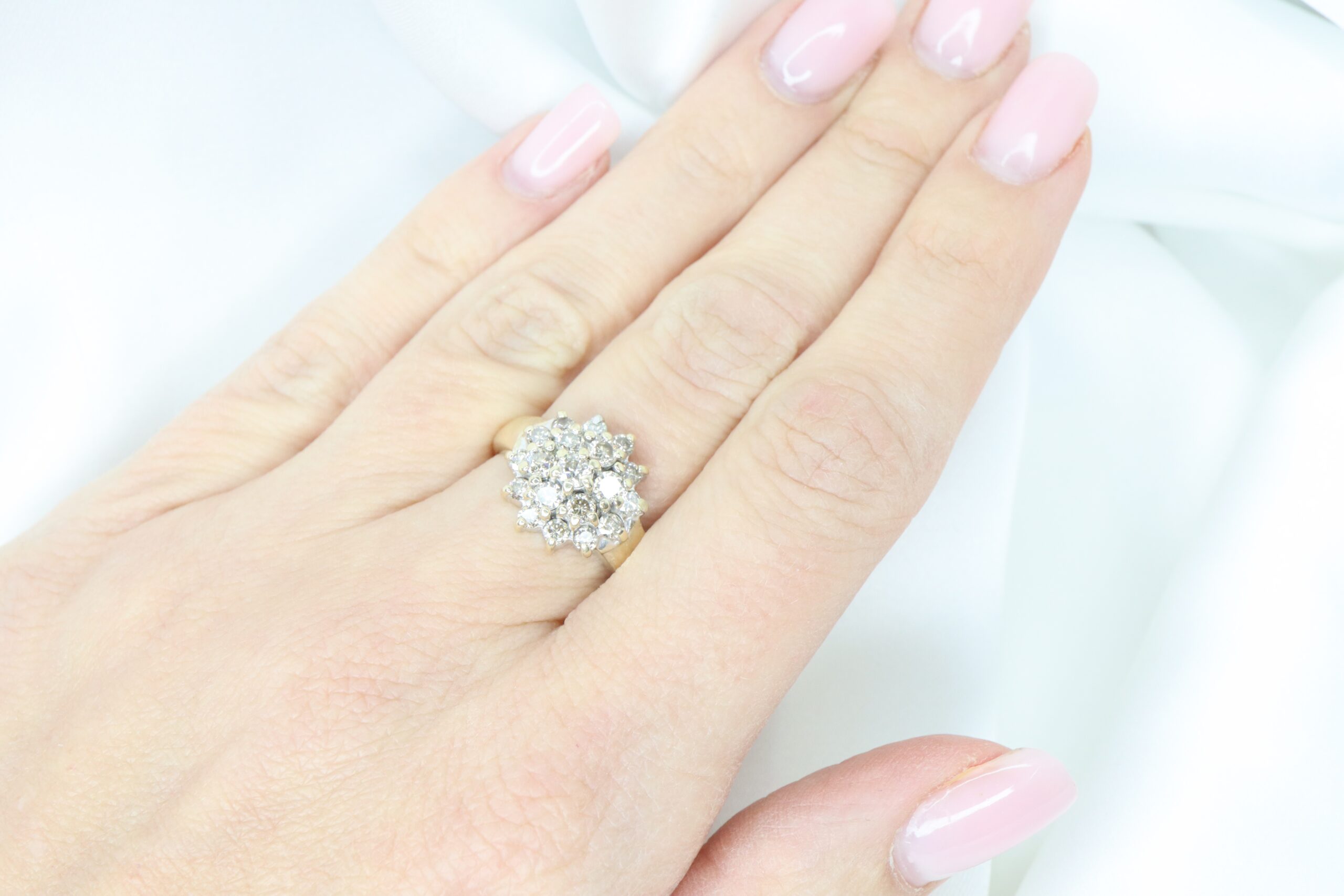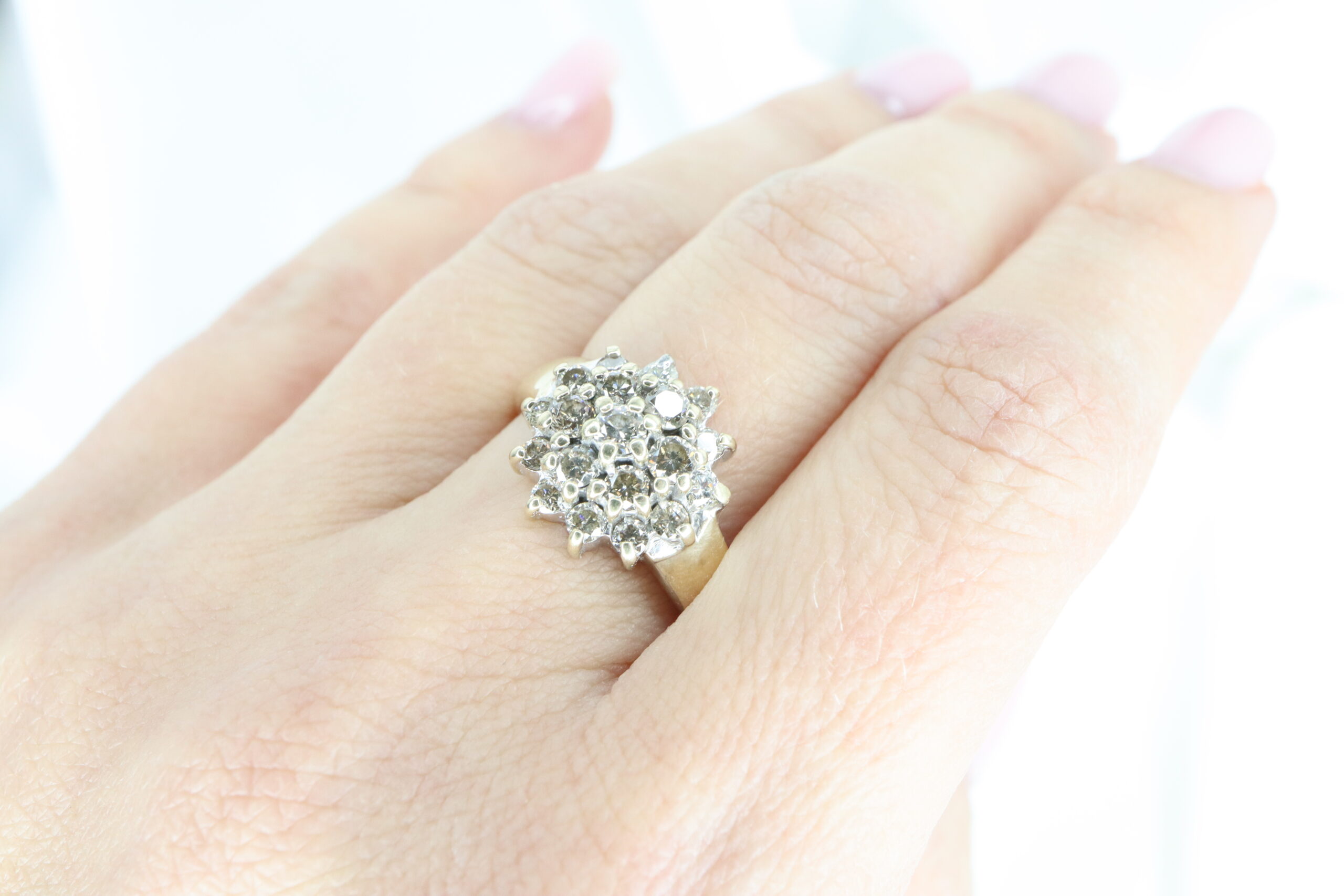 Piękny pierścionek typu cluster wykonany z 9-karatowego złota, wysadzany 19 okrągłymi diamentami o szlifie brylantowym, o łącznej masie ok. 0,75 ct. Kamienie stopniowo zwiększają swoją wielkość w kierunku środka, tworząc harmonijną i elegancką kompozycję.