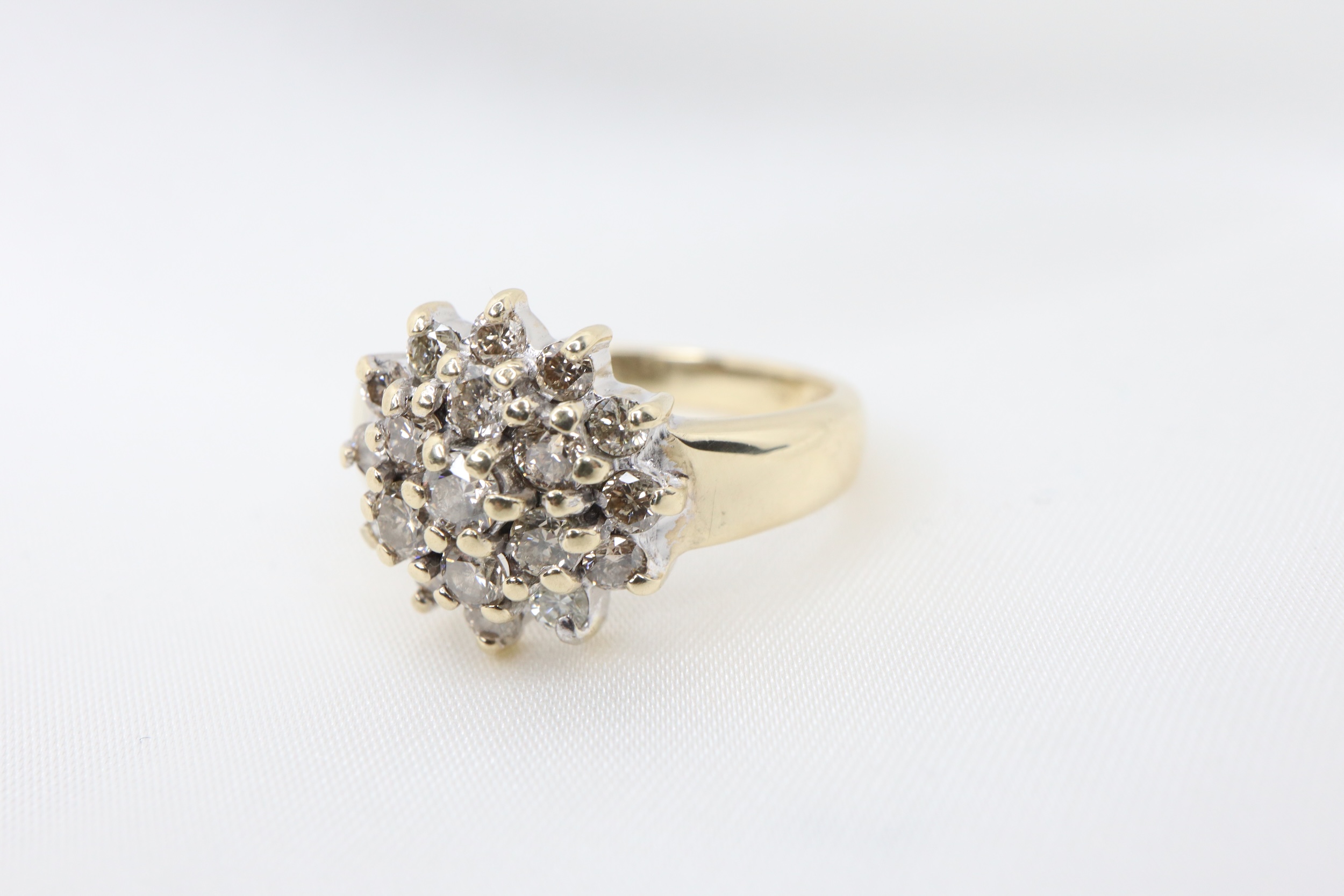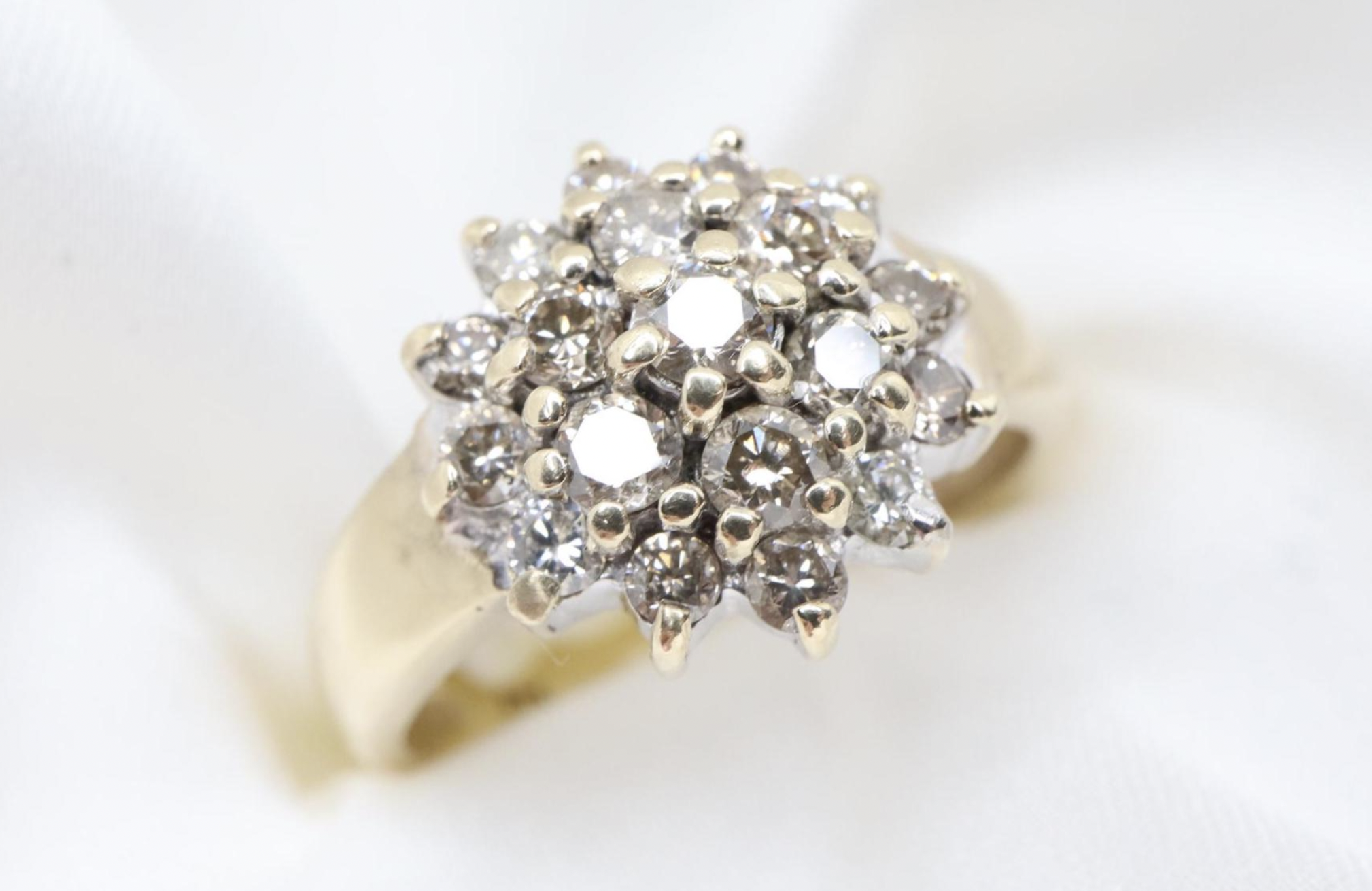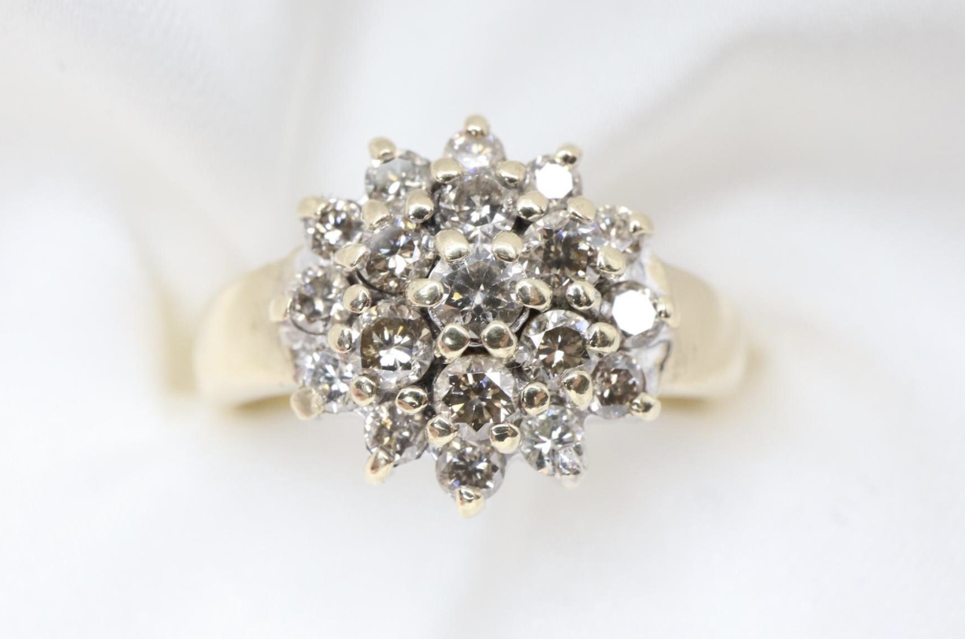 Piękny pierścionek typu cluster wykonany z 9-karatowego złota, wysadzany 19 okrągłymi diamentami o szlifie brylantowym, o łącznej masie ok. 0,75 ct. Kamienie stopniowo zwiększają swoją wielkość w kierunku środka, tworząc harmonijną i elegancką kompozycję.