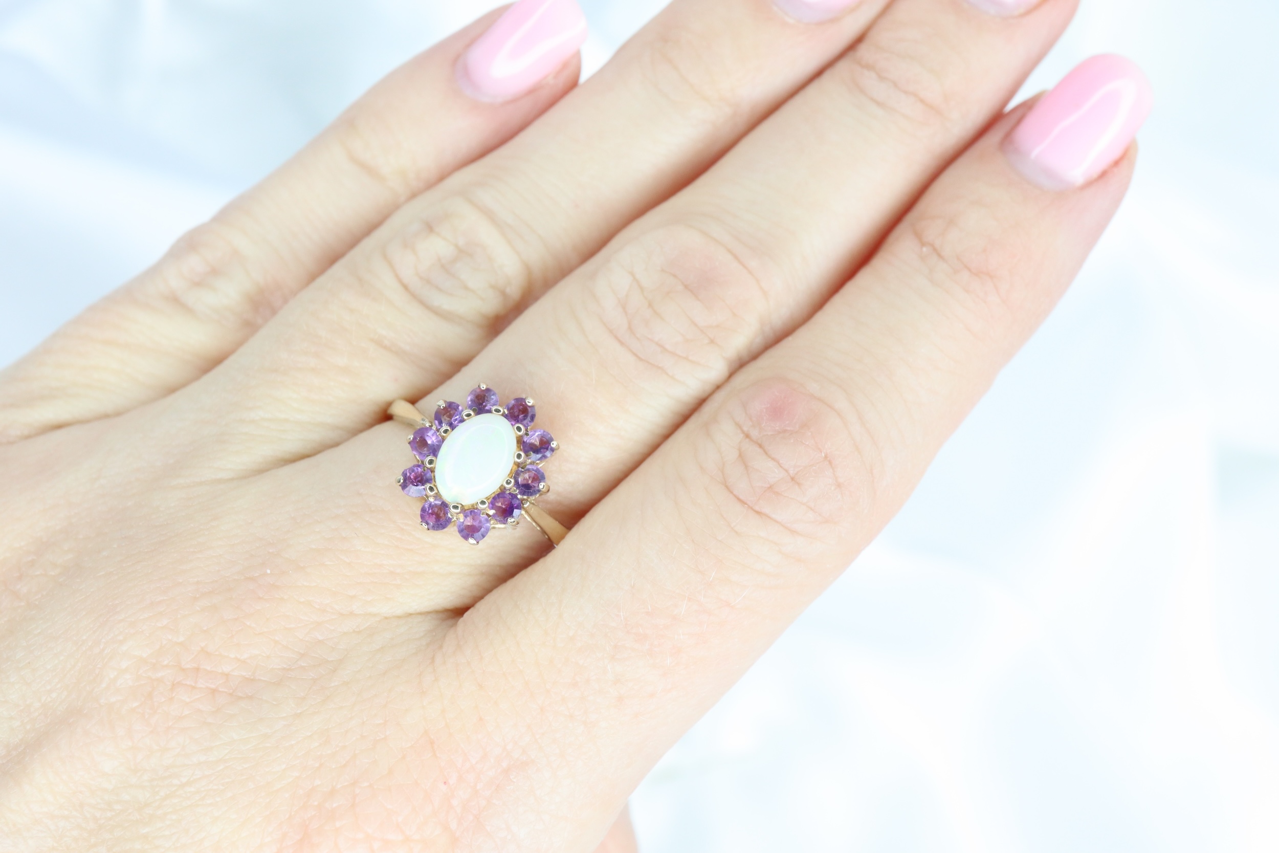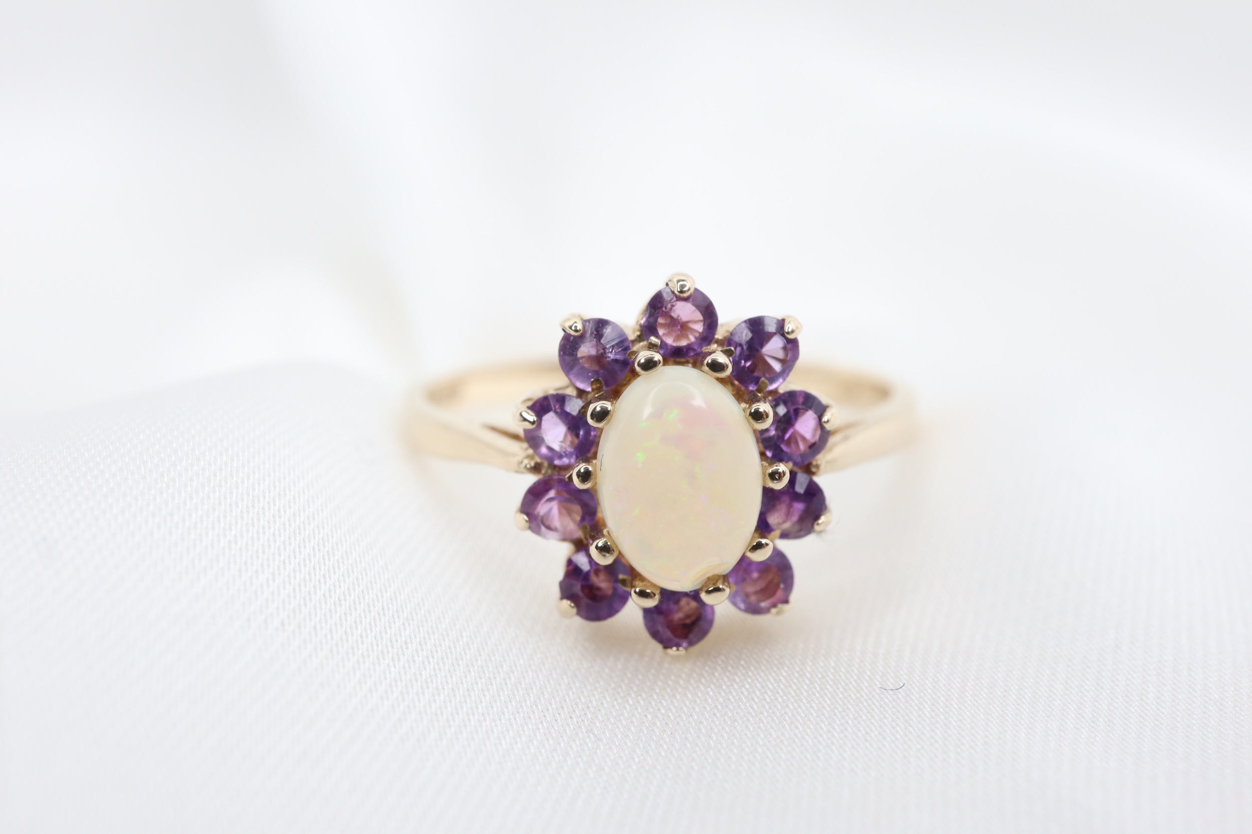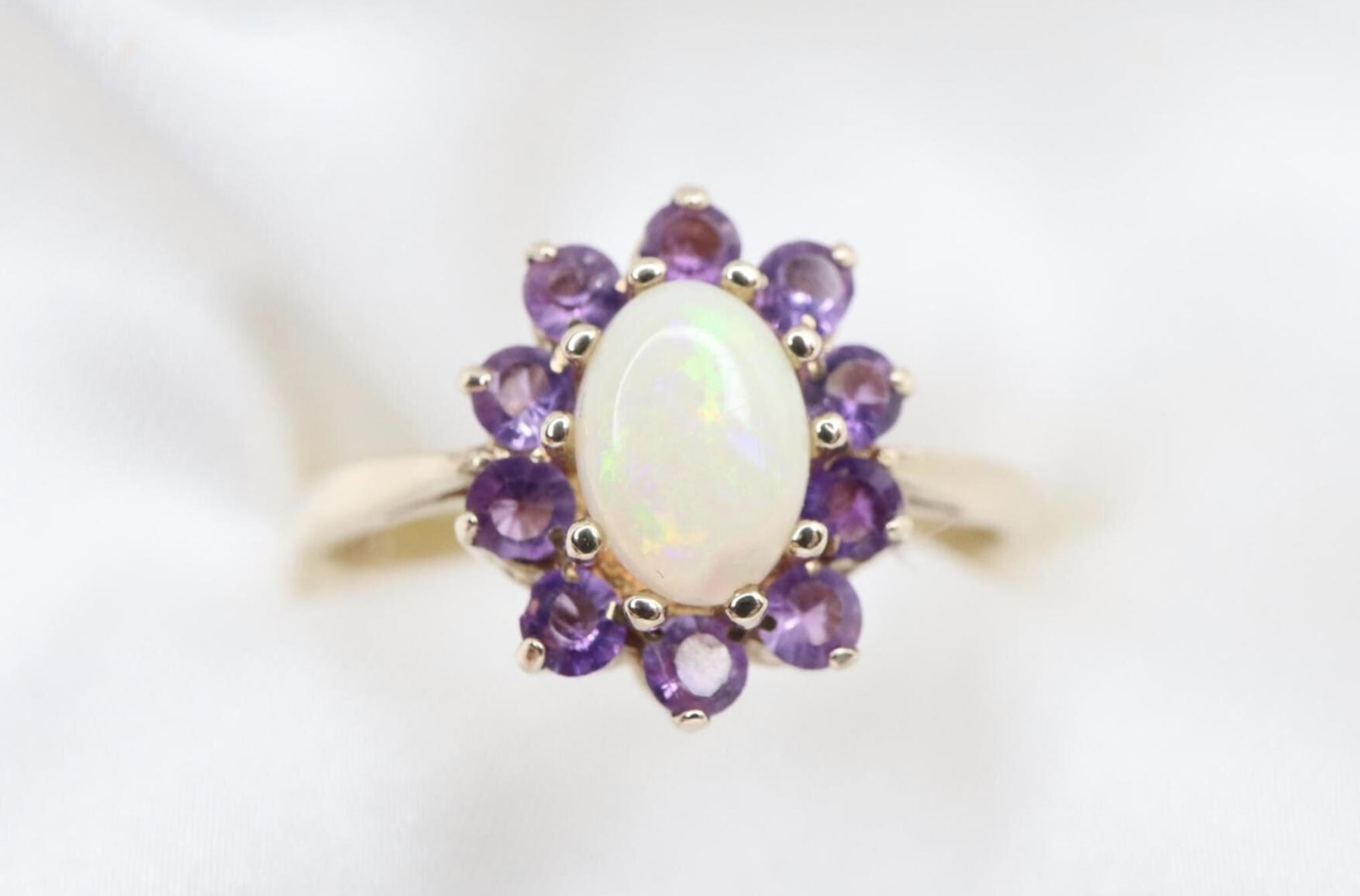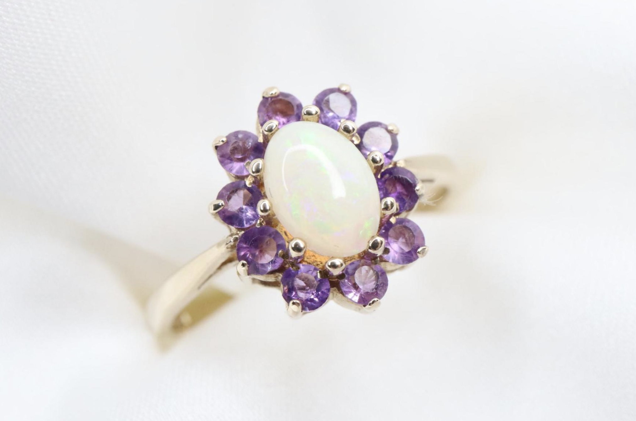 Uroczy pierścionek z owalnym, naturalnym opalem (ok. 8 x 5 mm), otoczonym przez 10 intensywnie fioletowymi ametystami (ok. 2 mm każdy), osadzonych pomiędzy gładkimi ramionami obrączki.
