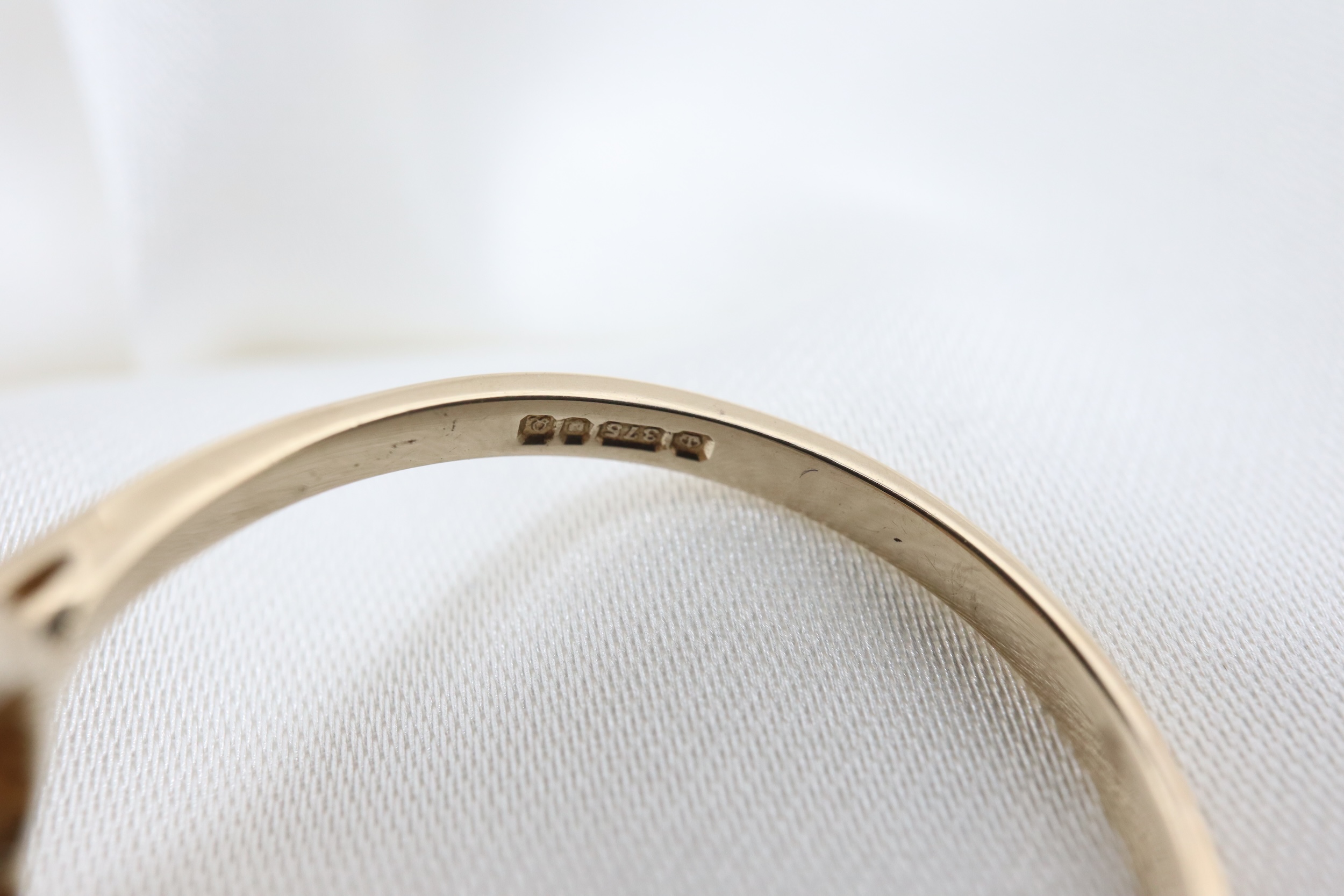 Pierścionek posiada pełne cechy probiercze dla złota próby 9 ct, wybite w Londynie w 1990 roku, oraz znak wytwórcy „PR”.