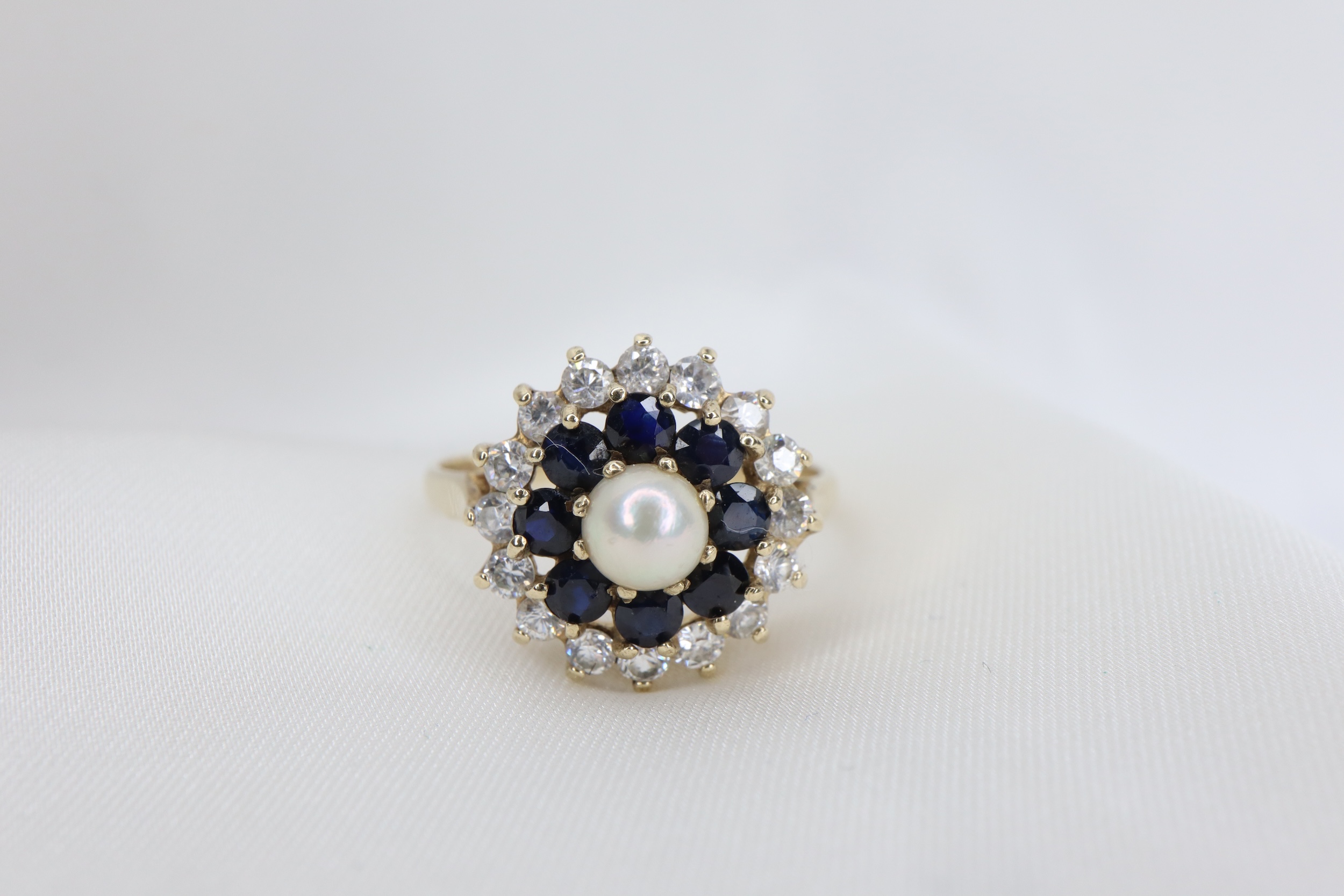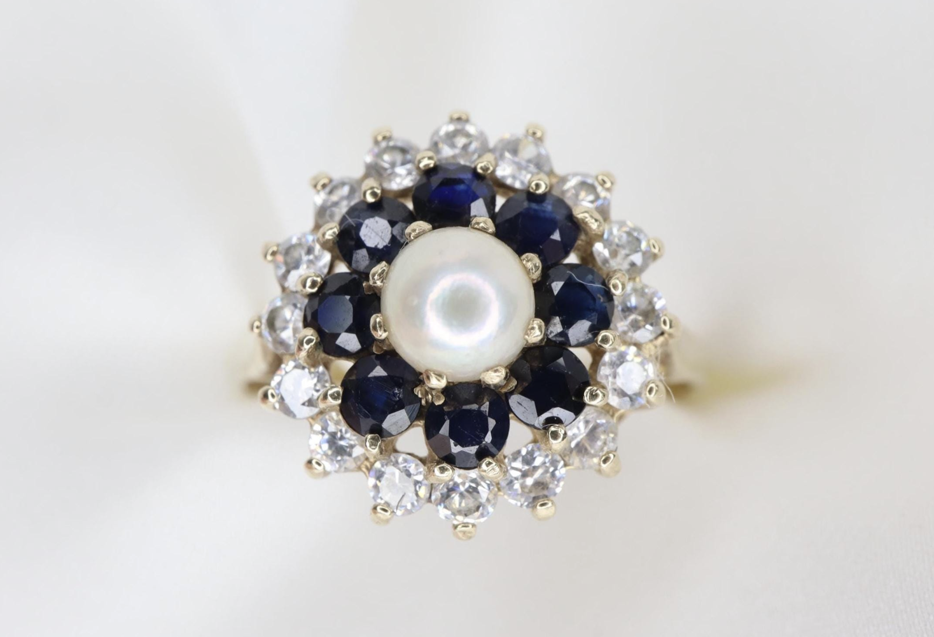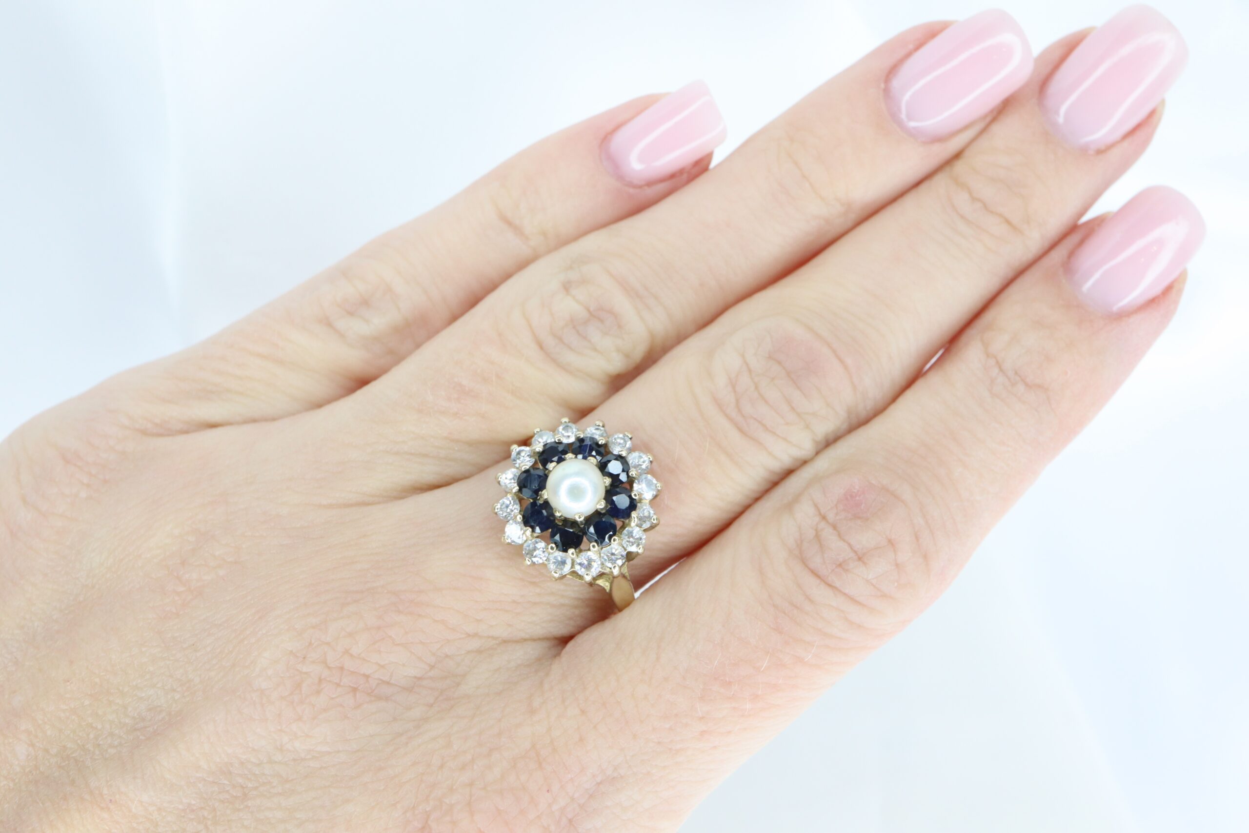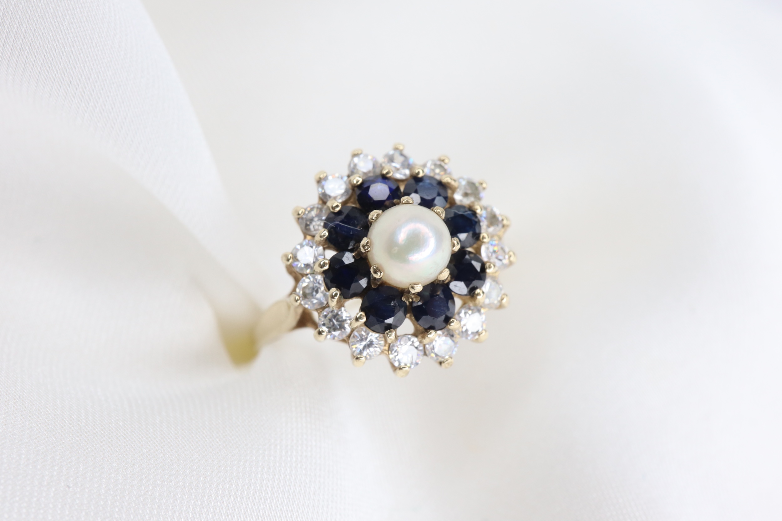 Elegancki pierścionek vintage w formie klastra, z piękną białą perłą w centralnej części (ok. 5 mm), o ładnym, naturalnym połysku. Perła otoczona jest ośmioma szafirami w głębokim, ciemnoniebieskim odcieniu (ok. 2,5 mm każdy), a całość uzupełnia zewnętrzny rząd lśniących, bezbarwnych cyrkonii (ok. 2 mm każda), tworząc efektowny i bardzo kobiecy pierścionek koktajlowy.