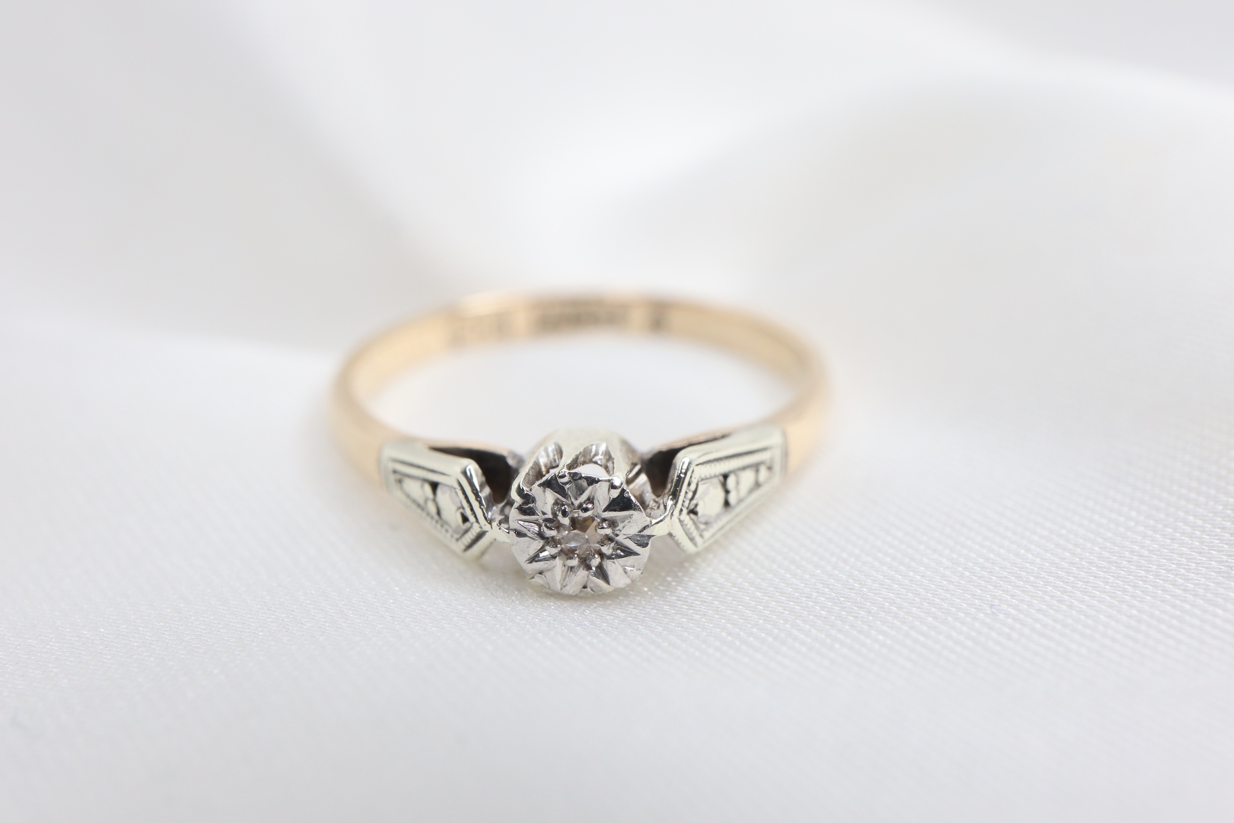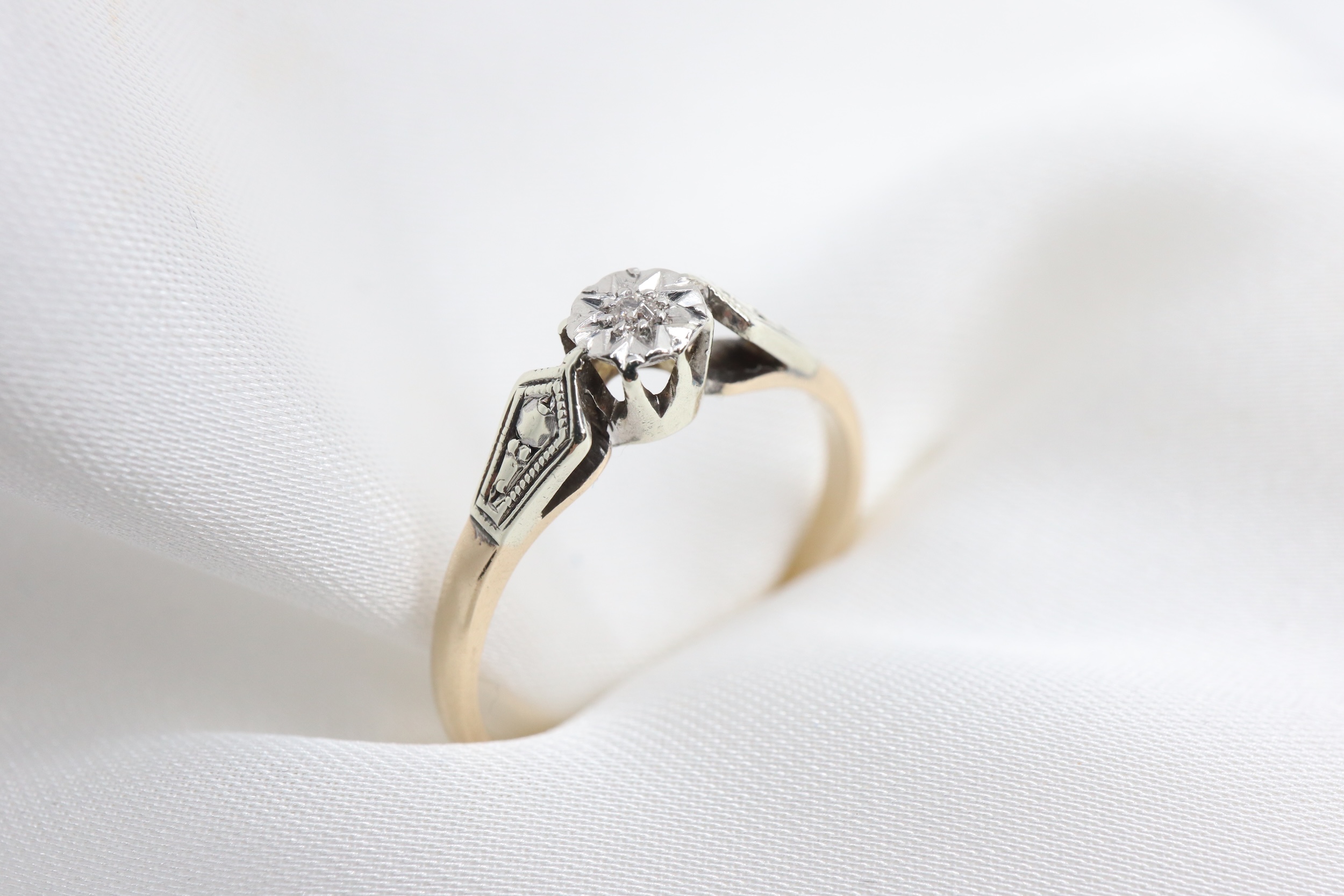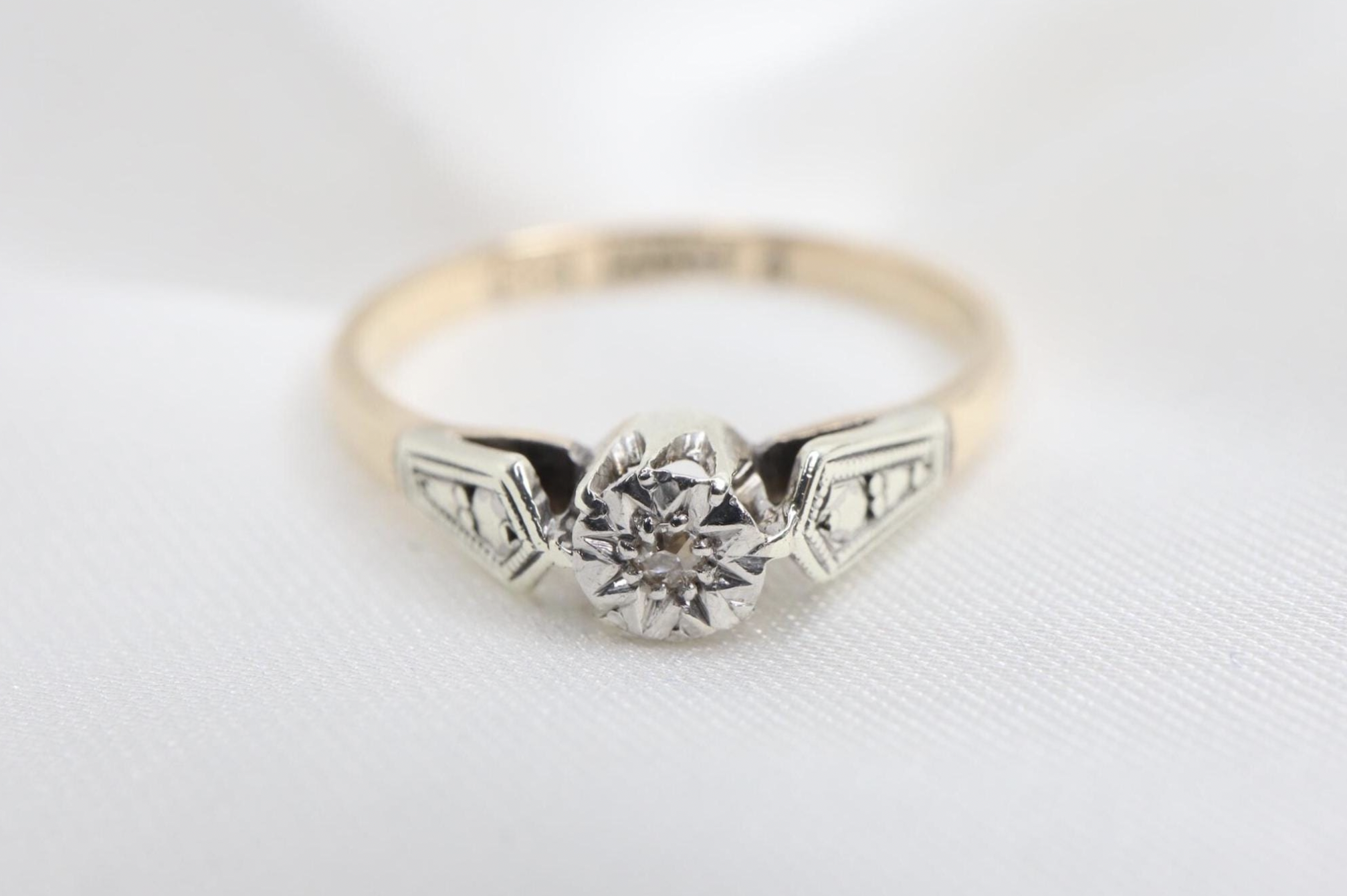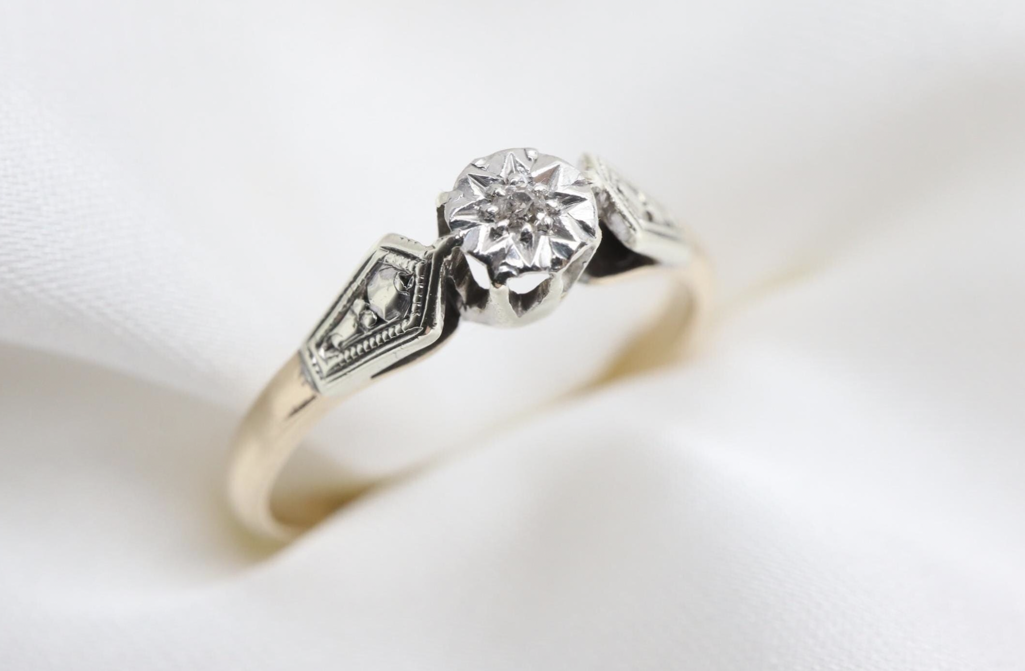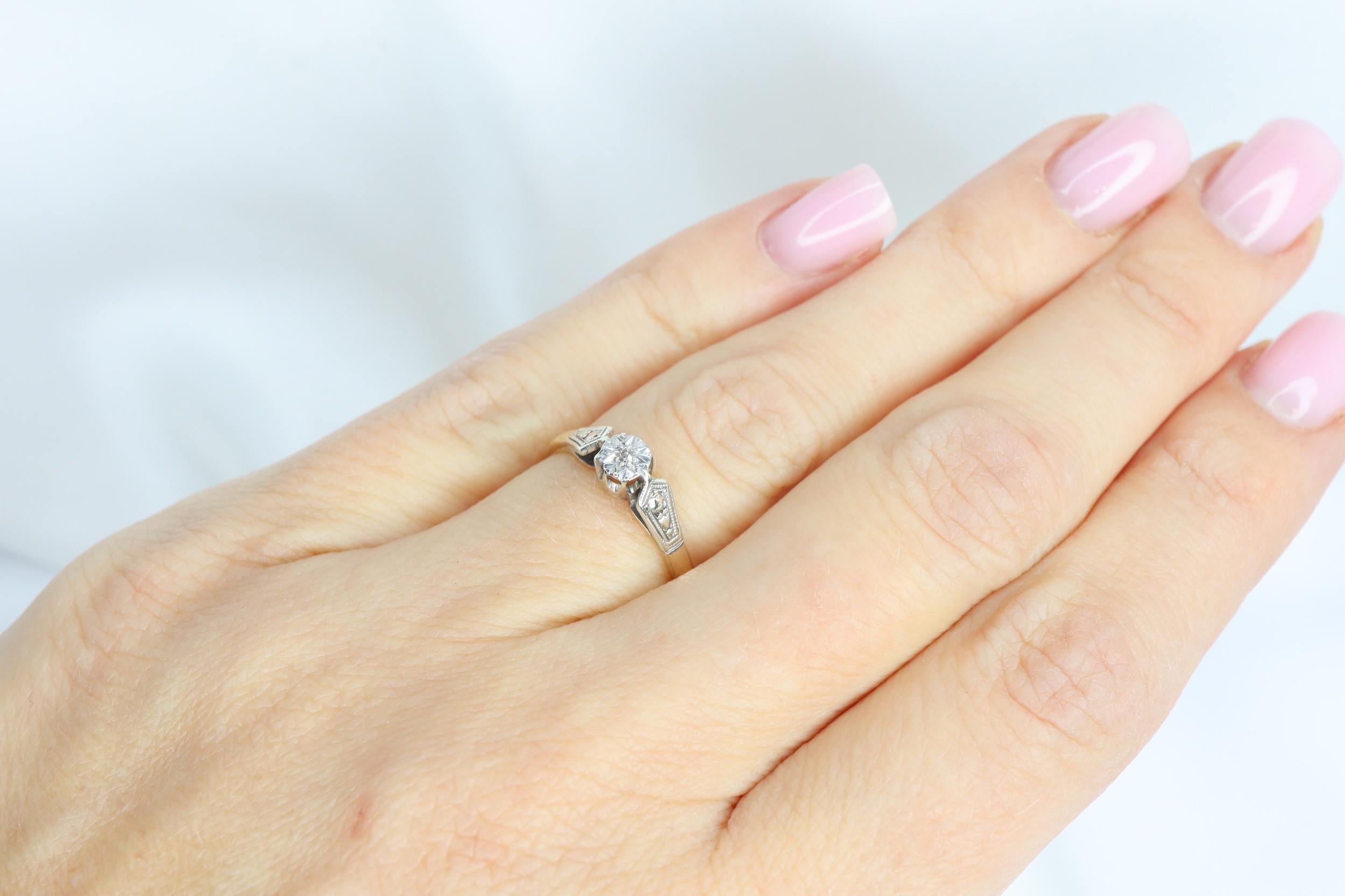 Delikatny i drobny, zabytkowy pierścionek zaręczynowy z diamentem z epoki Art Deco, datowany na ok. lata 40. XX wieku.