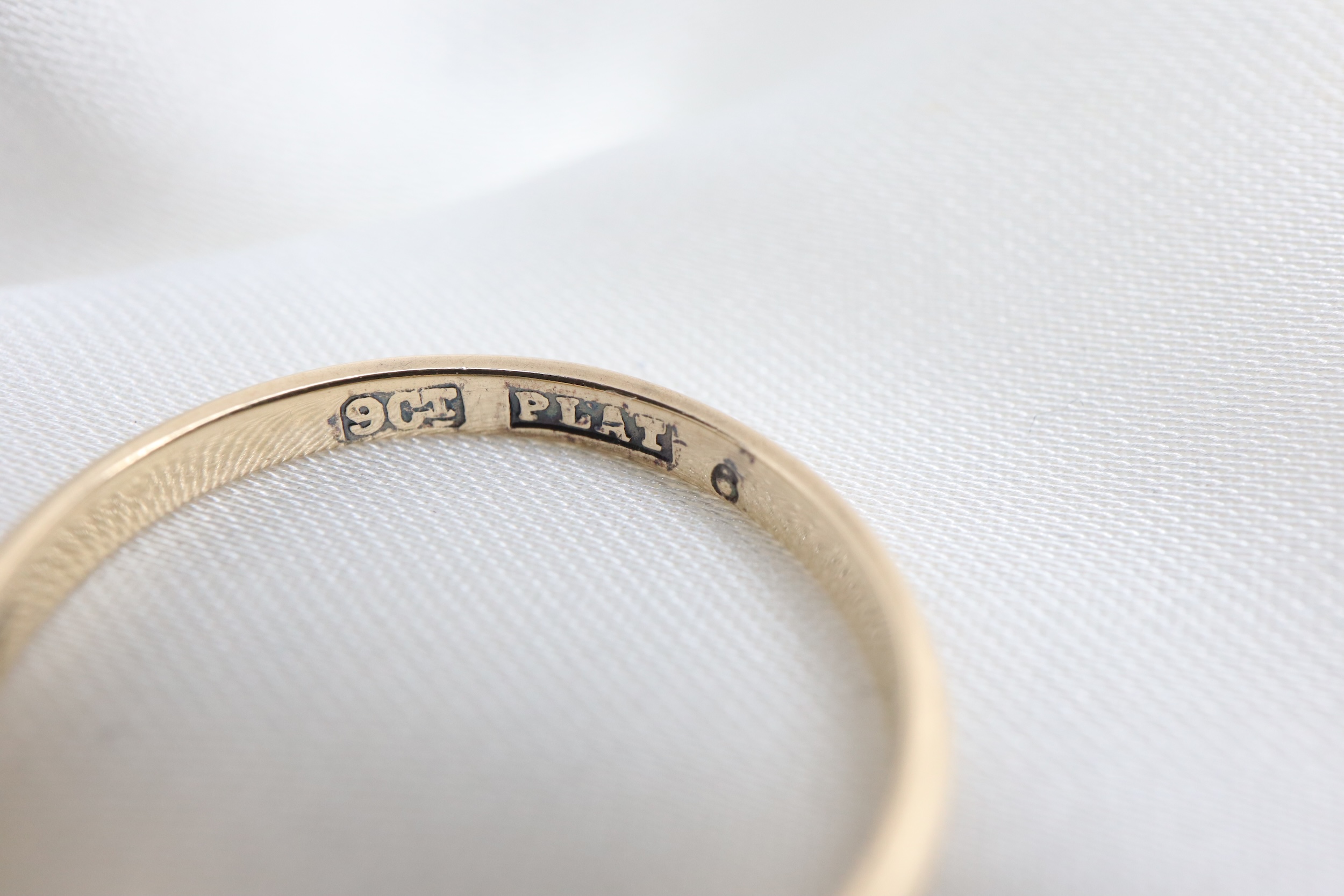 Sygnowany próbą „9CT PLAT”, co oznacza złoto 9-karatowe z platynową oprawą.