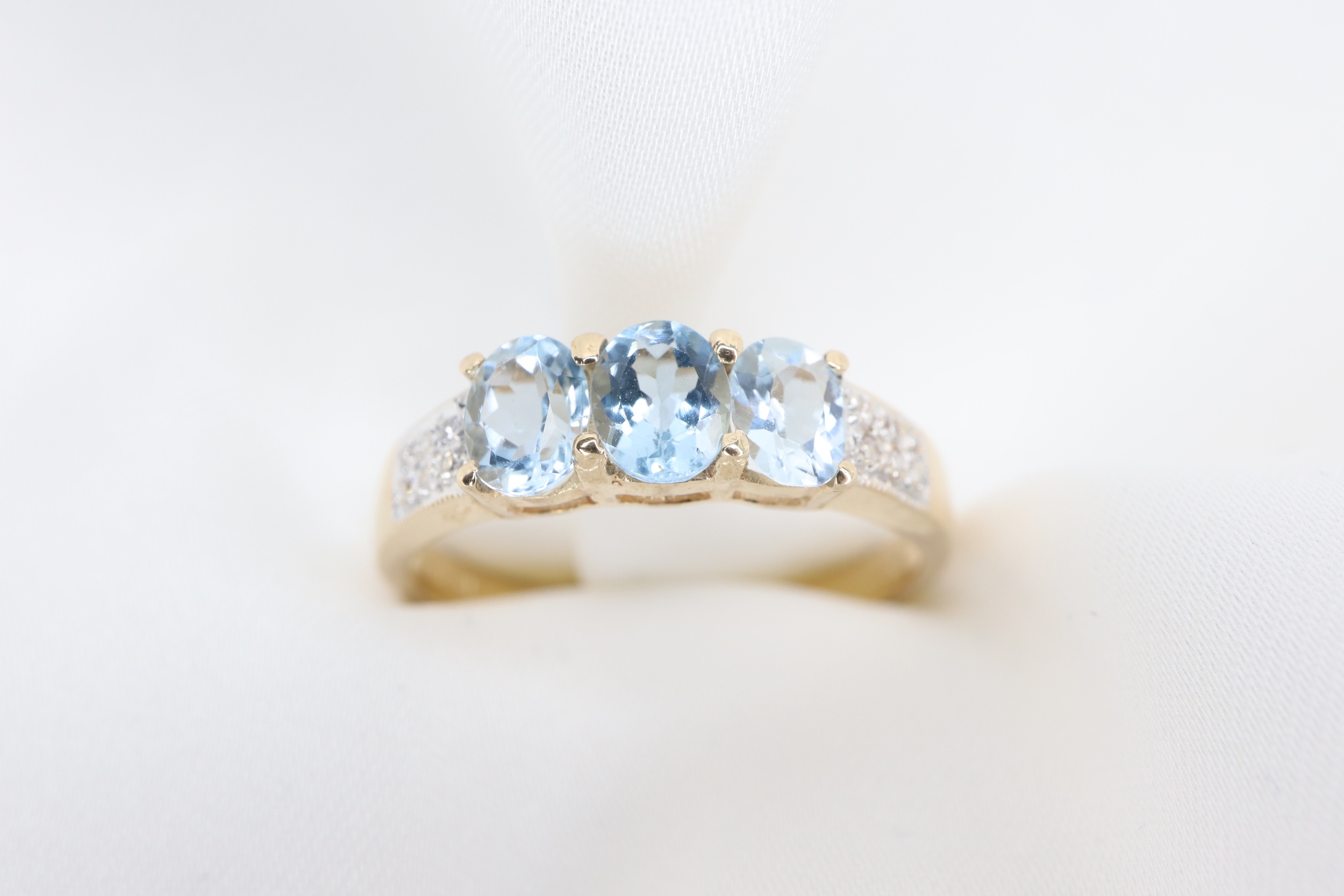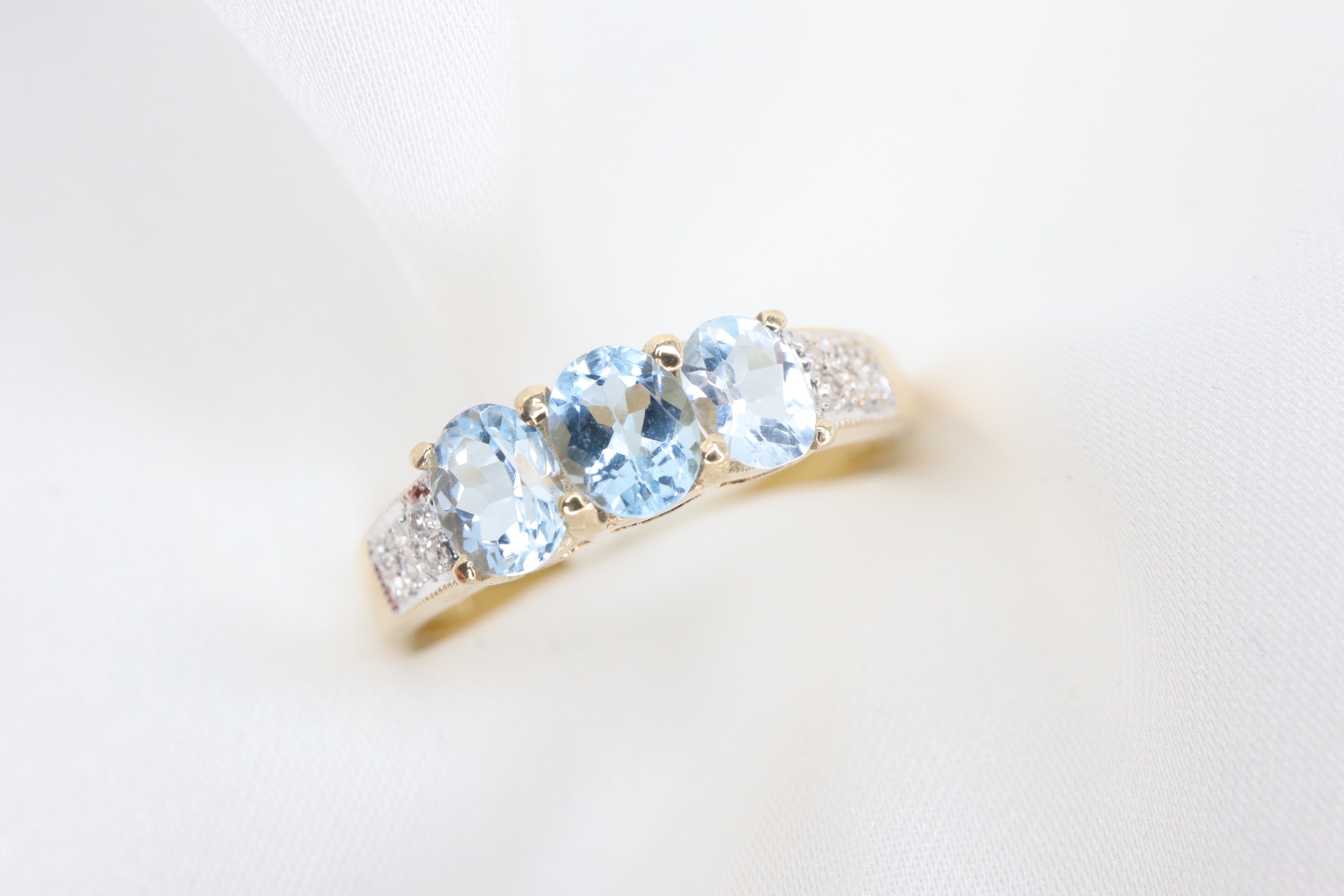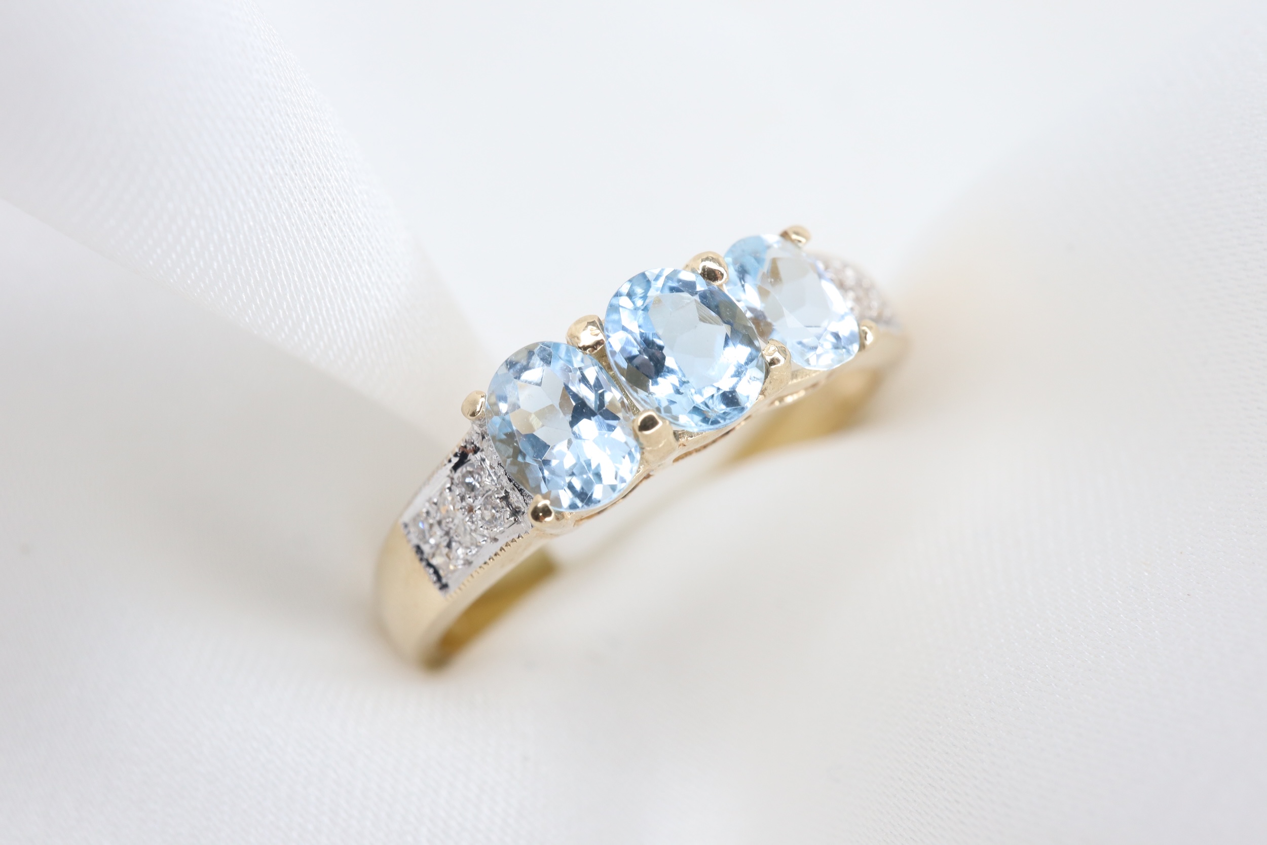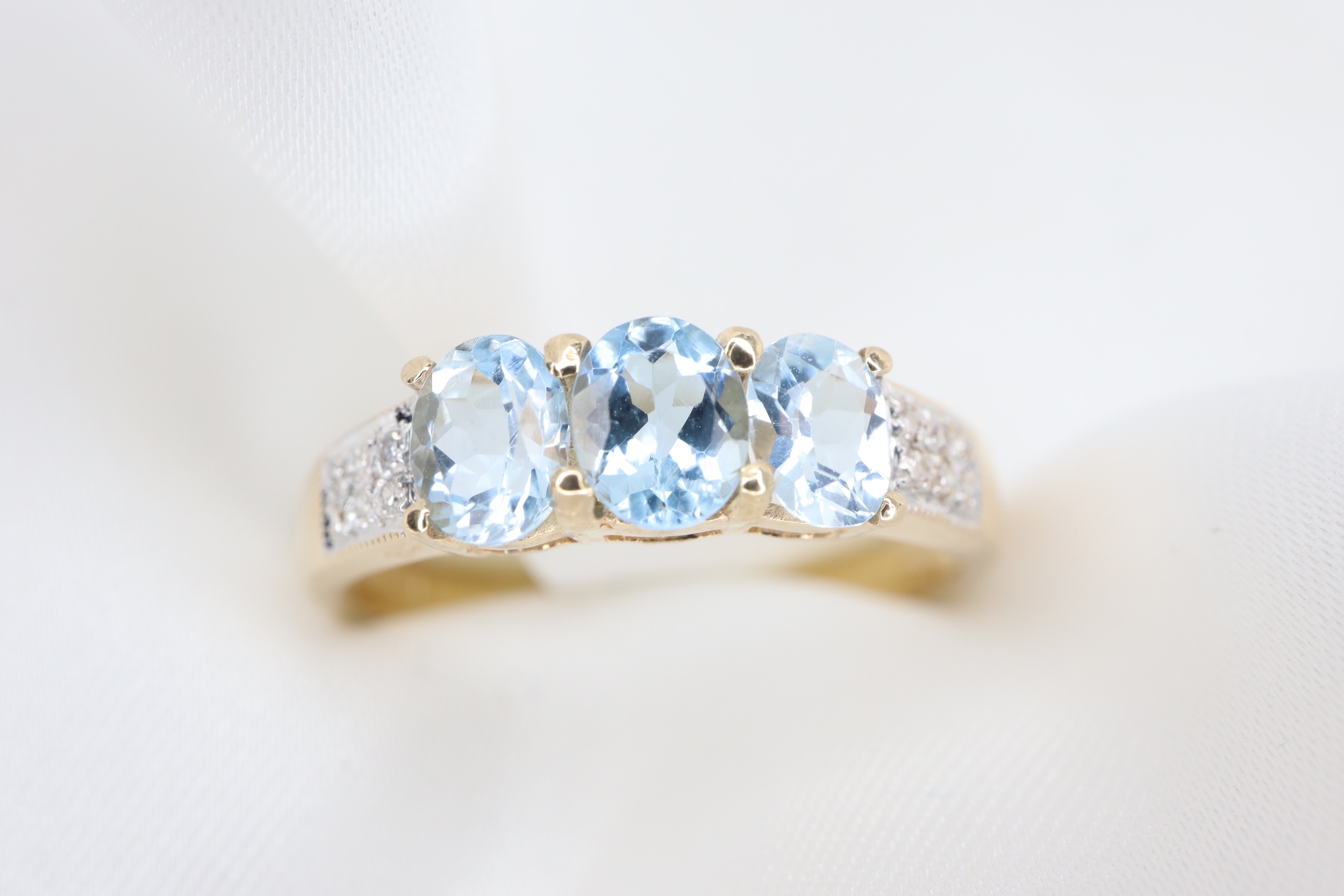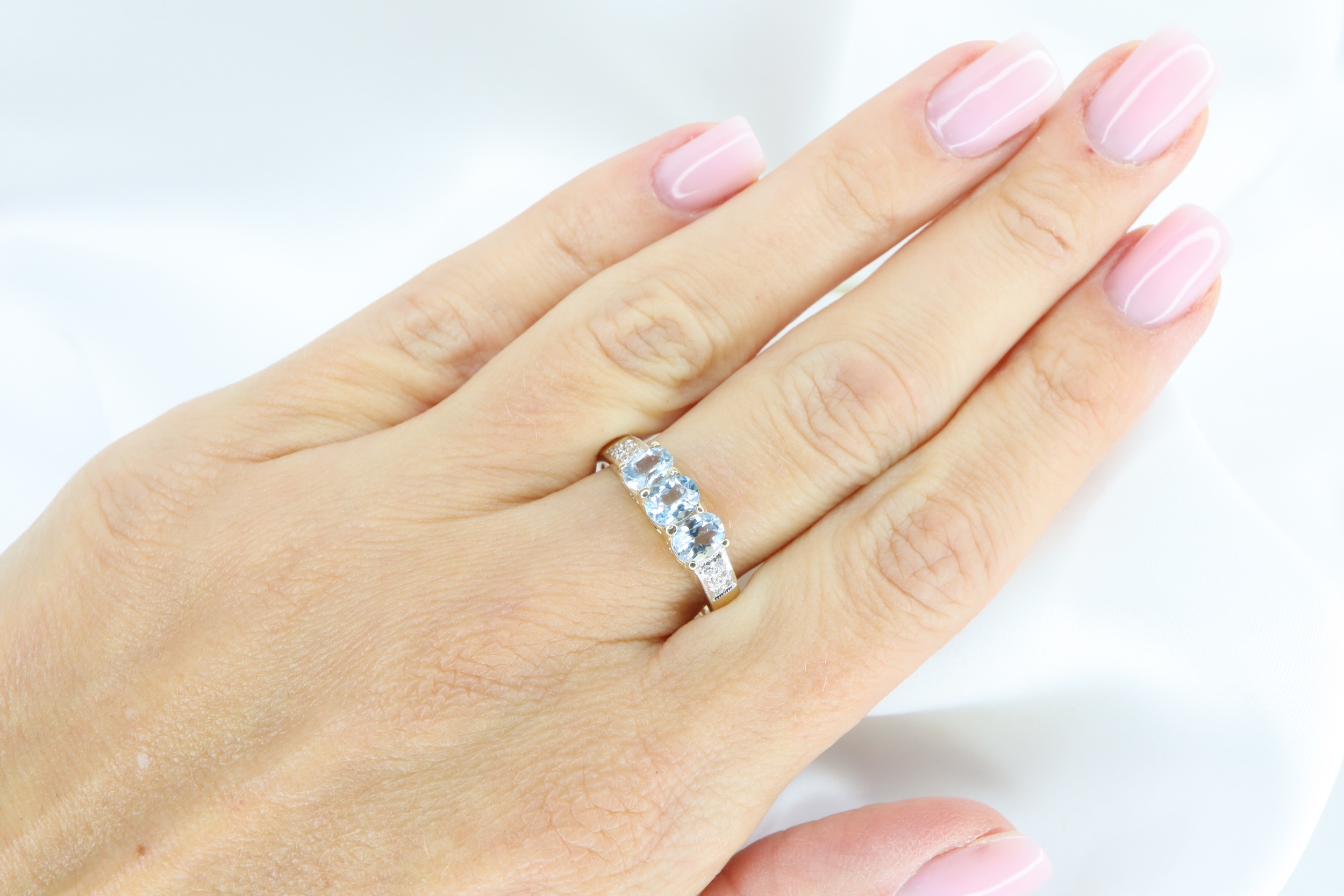Ten wyrafinowany pierścionek zachwyca kompozycją trzech owalnych akwamarynów o wymiarach 4 × 5 mm, subtelnie podkreślonych diamentami osadzonymi na ramionach obrączki.