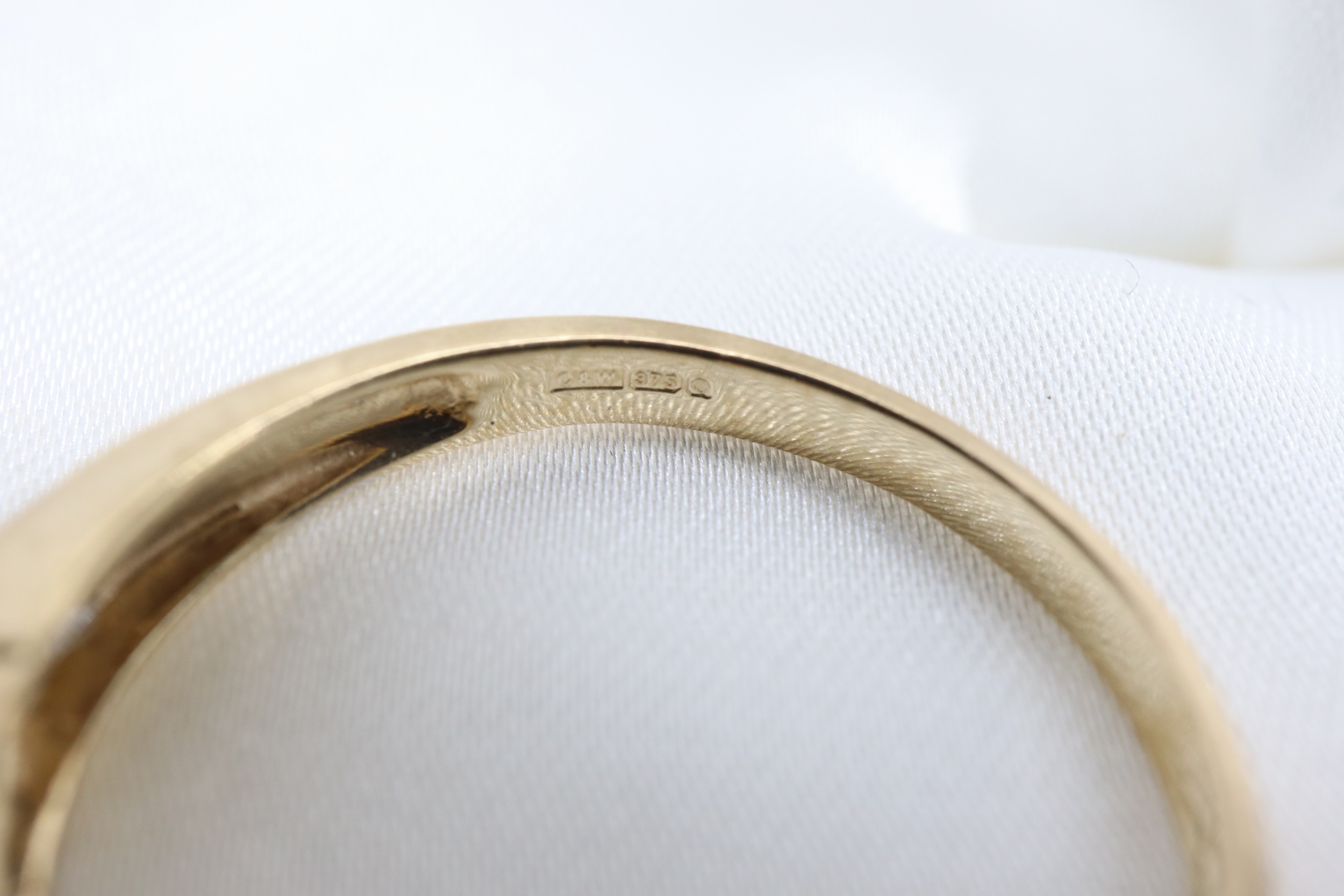 Pierścionek wykonano ze złota próby 9 ct, co potwierdzają cechy probiercze oraz znak sponsora „C&W”.