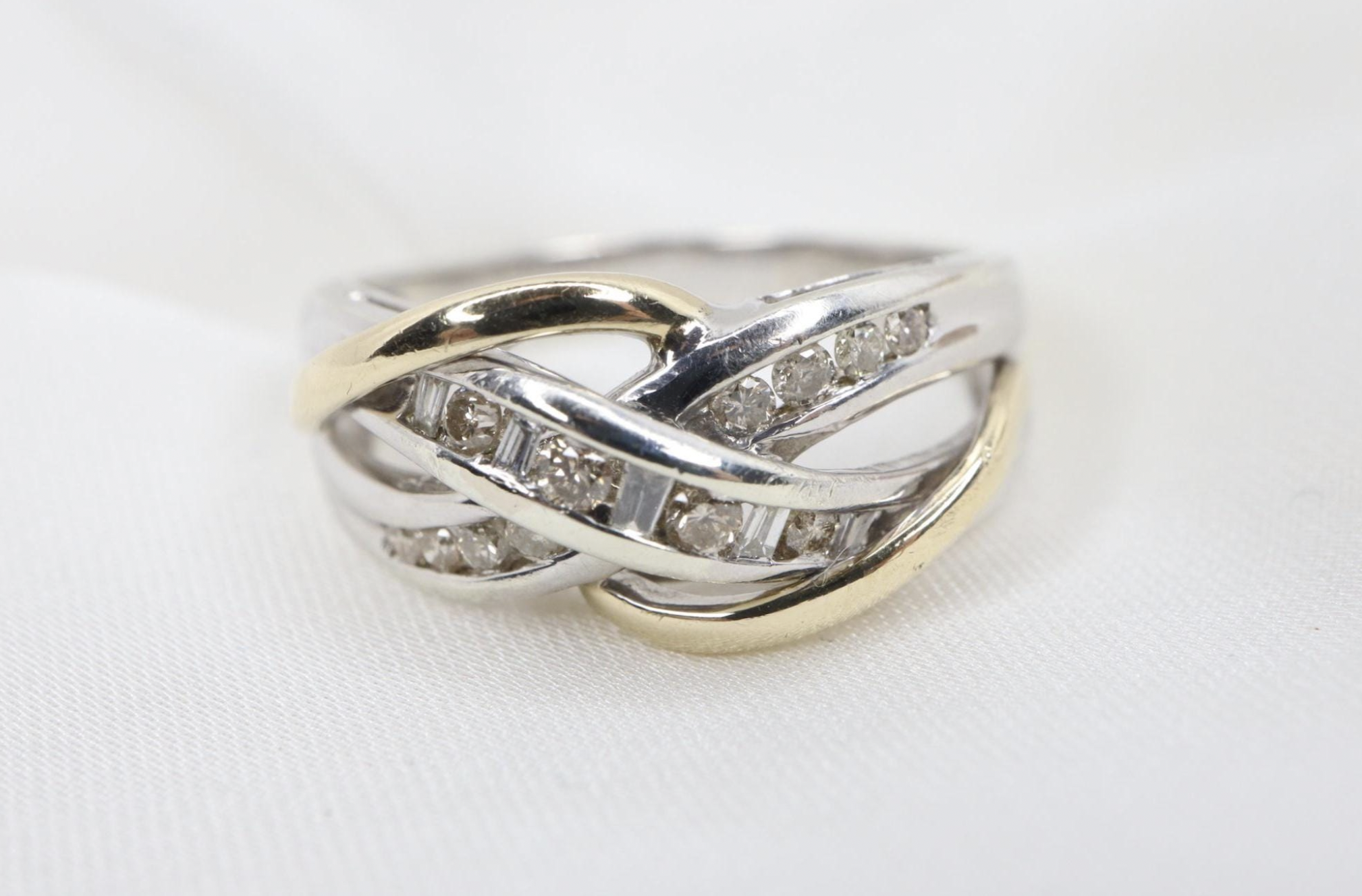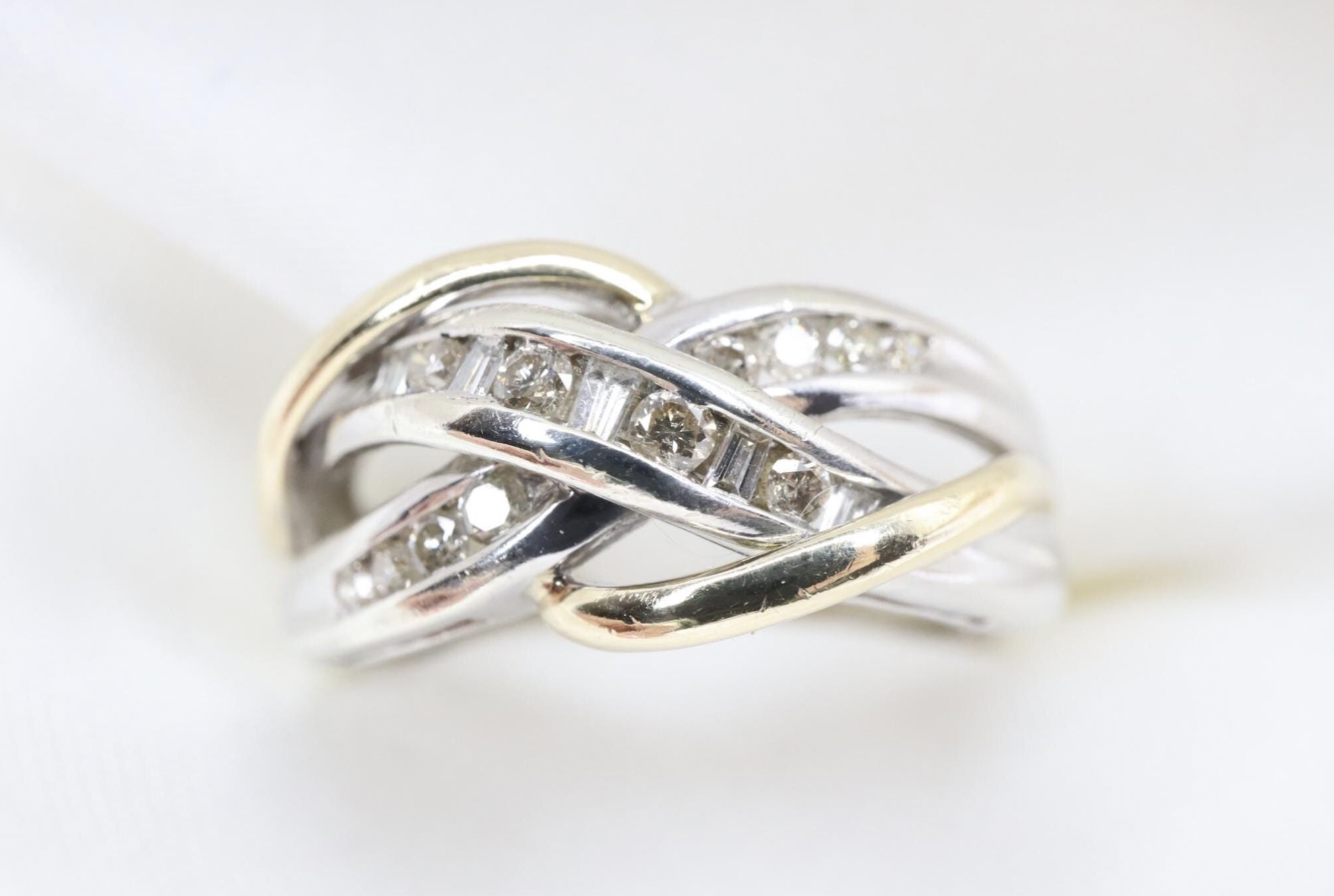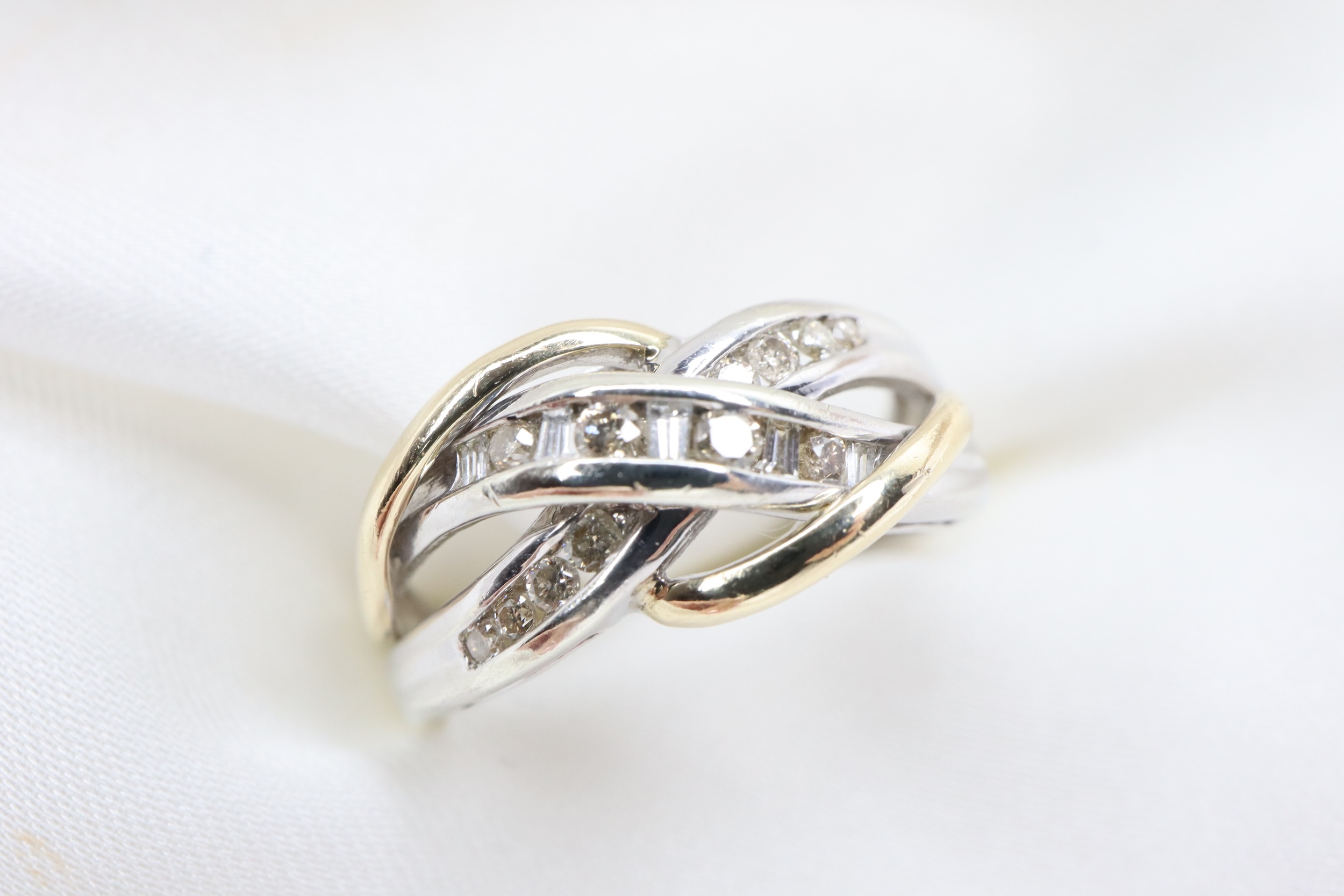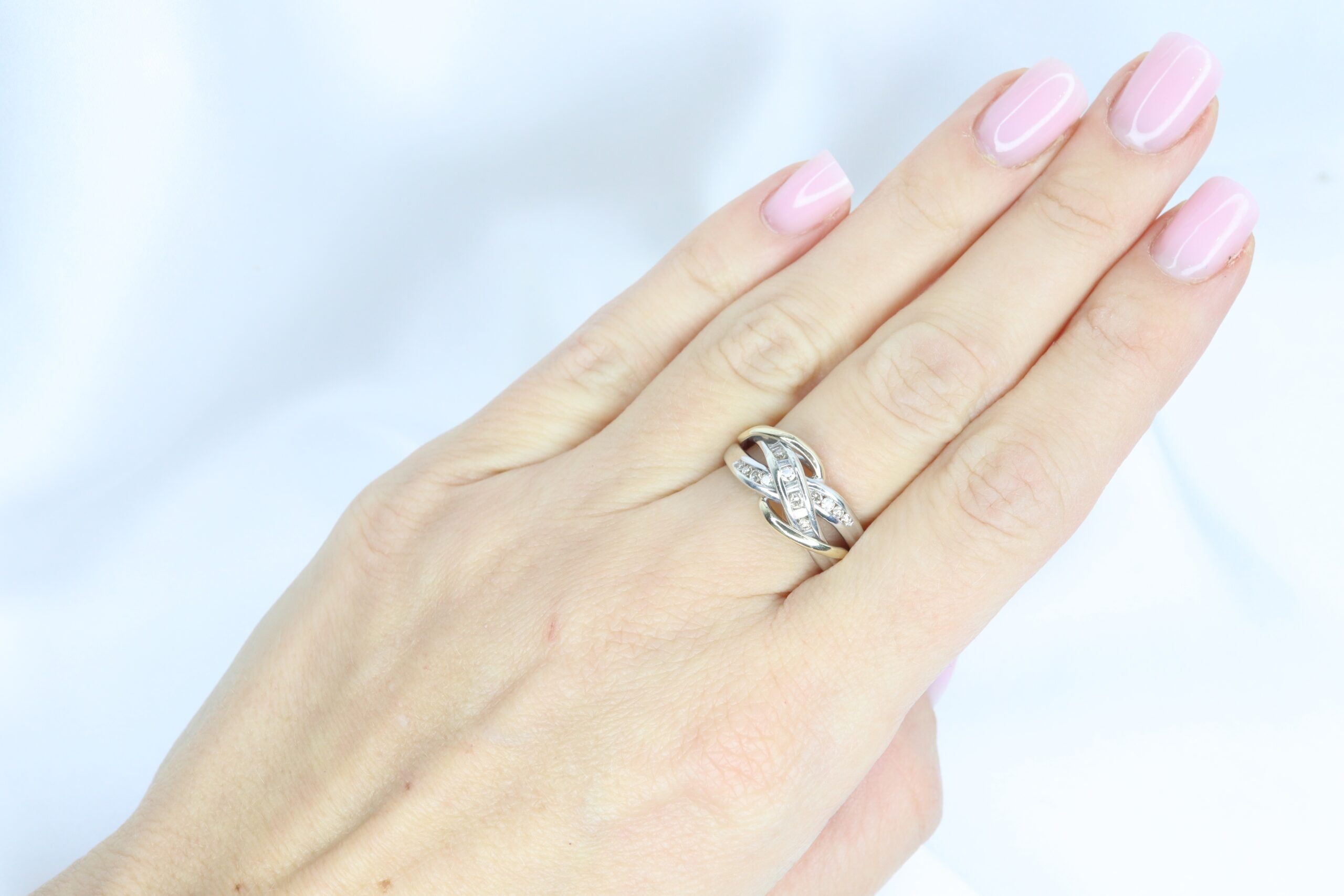 Wykonany z dwukolorowego złota próby 9 ct, ten piękny pierścionek ozdobiony jest 17 lśniącymi diamentami o szlifie mieszanym, ułożonymi w elegancki motyw skręconego węzła miłości — ponadczasowego symbolu miłości i jedności.