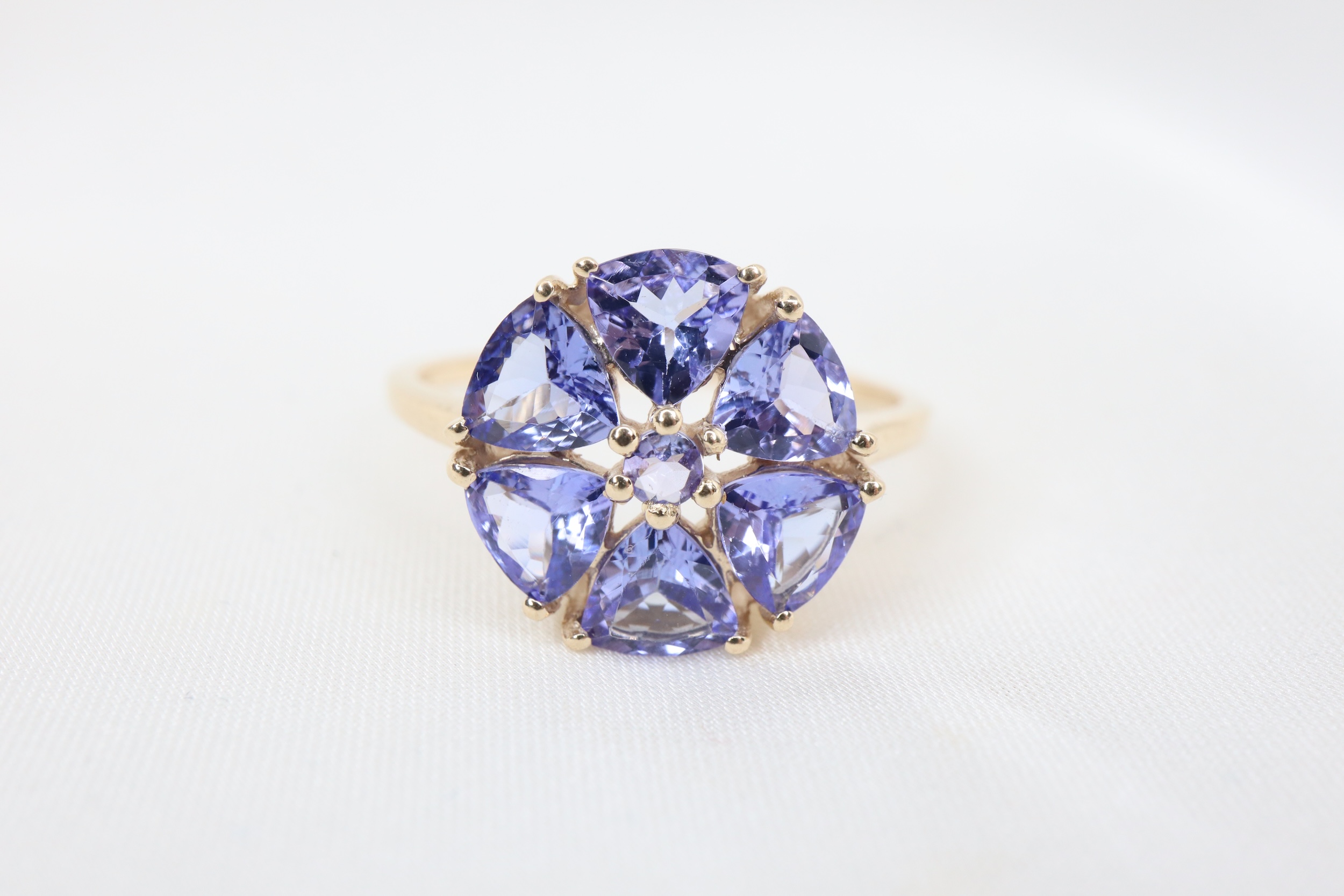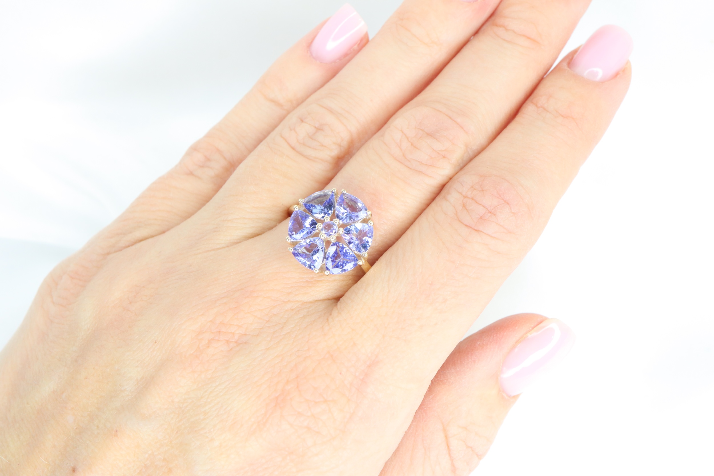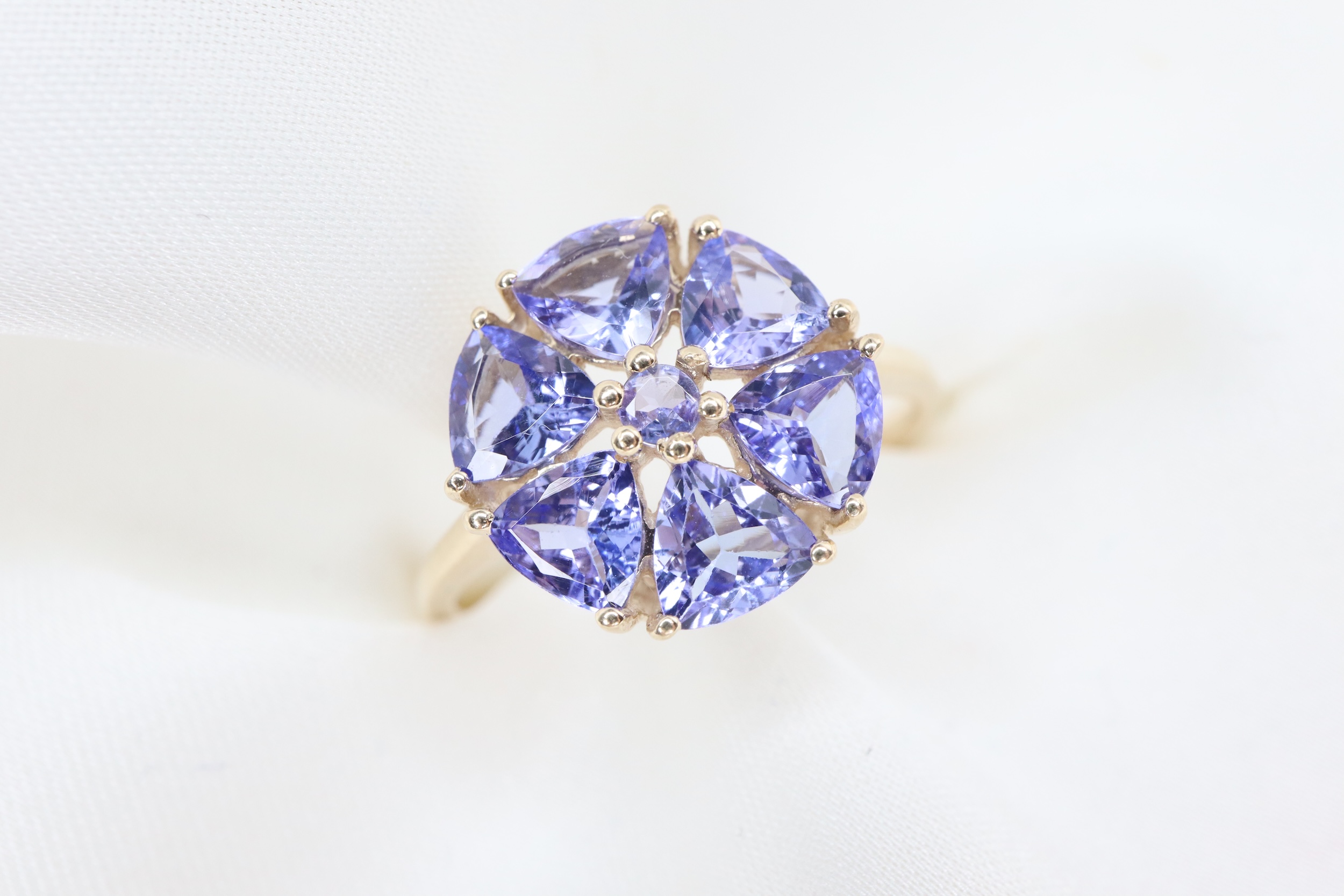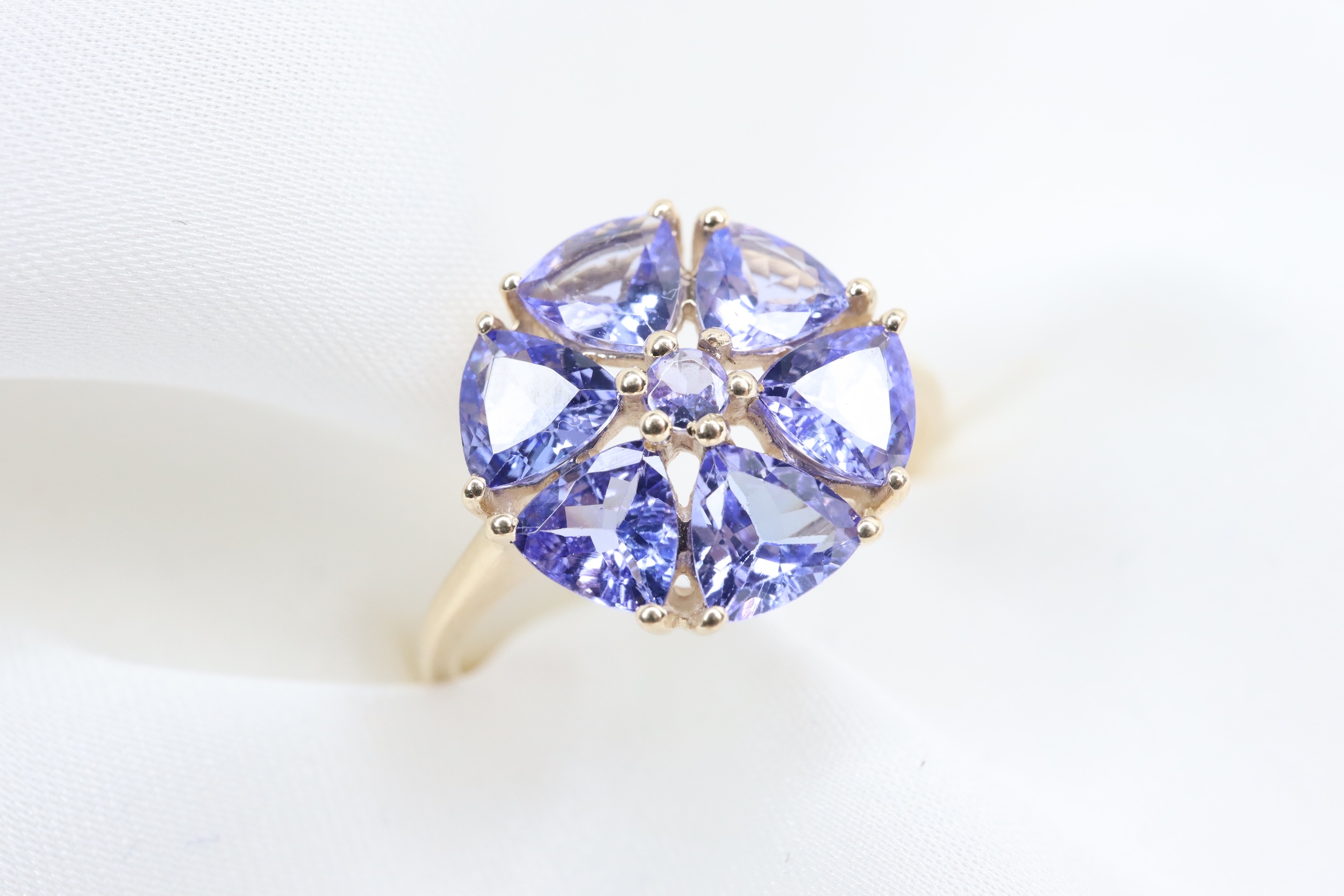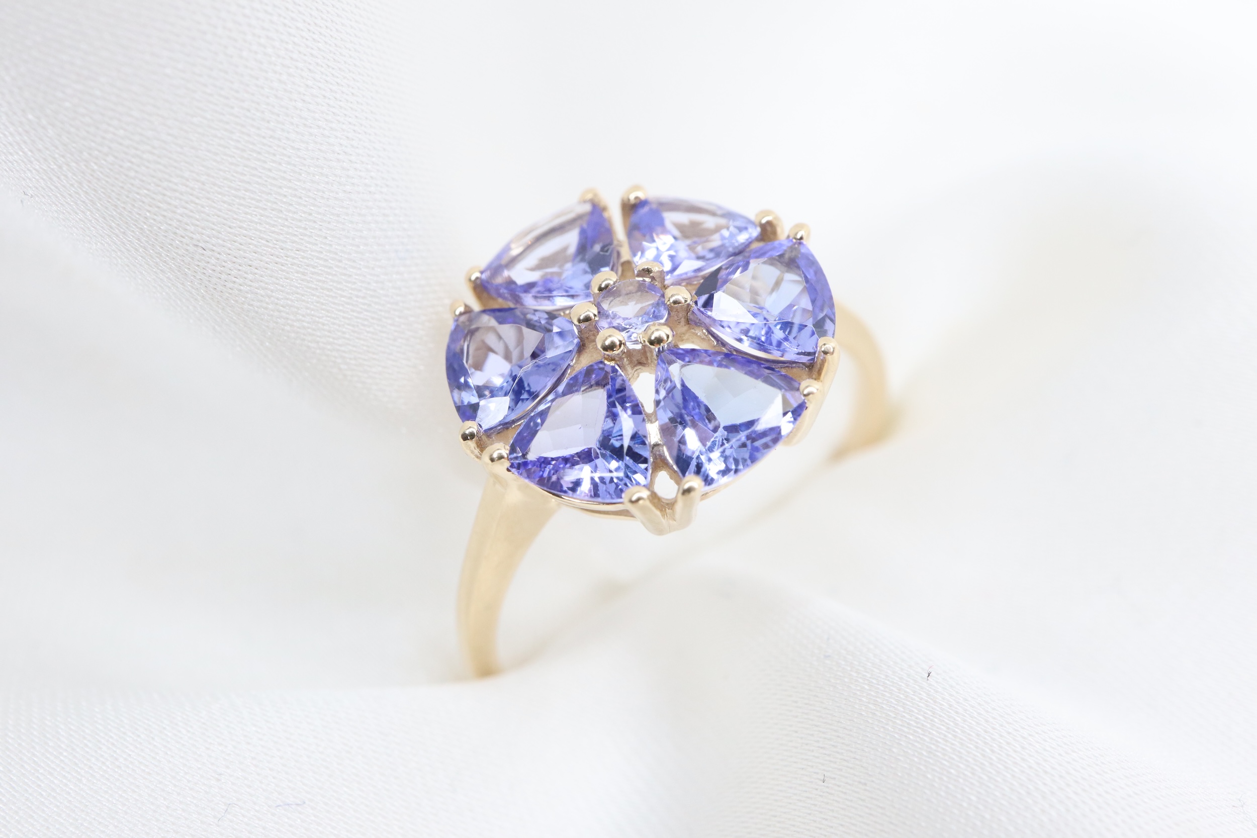 Piękny pierścionek o kwiatowej formie wykonany z 9-karatowego żółtego złota, ozdobiony centralnie okrągłym tanzanitem (2,5 mm), otoczonym sześcioma tanzanitami w szlifie trójkątnym (trillion), każdy o wymiarze ok. 5 mm i masie ok. 0,42 ct, ułożonymi w efektowną kompozycję typu cluster.
