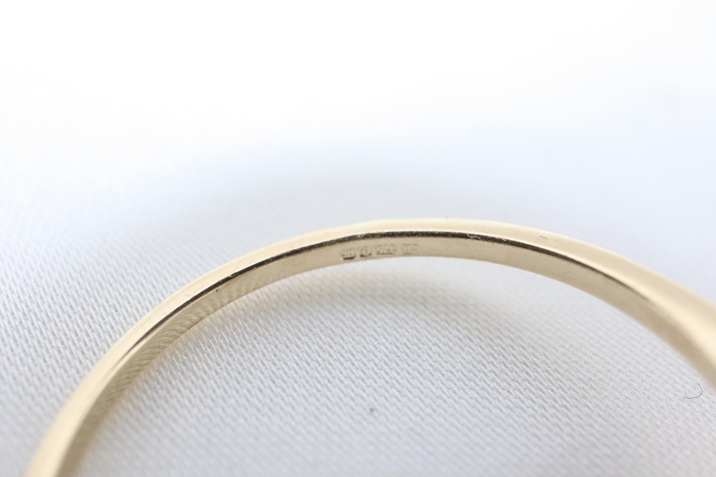 Wewnętrzna część obrączki posiada pełne brytyjskie cechy probiercze potwierdzające próbę 9ct złota (Birmingham) oraz znak imienny „CR”.