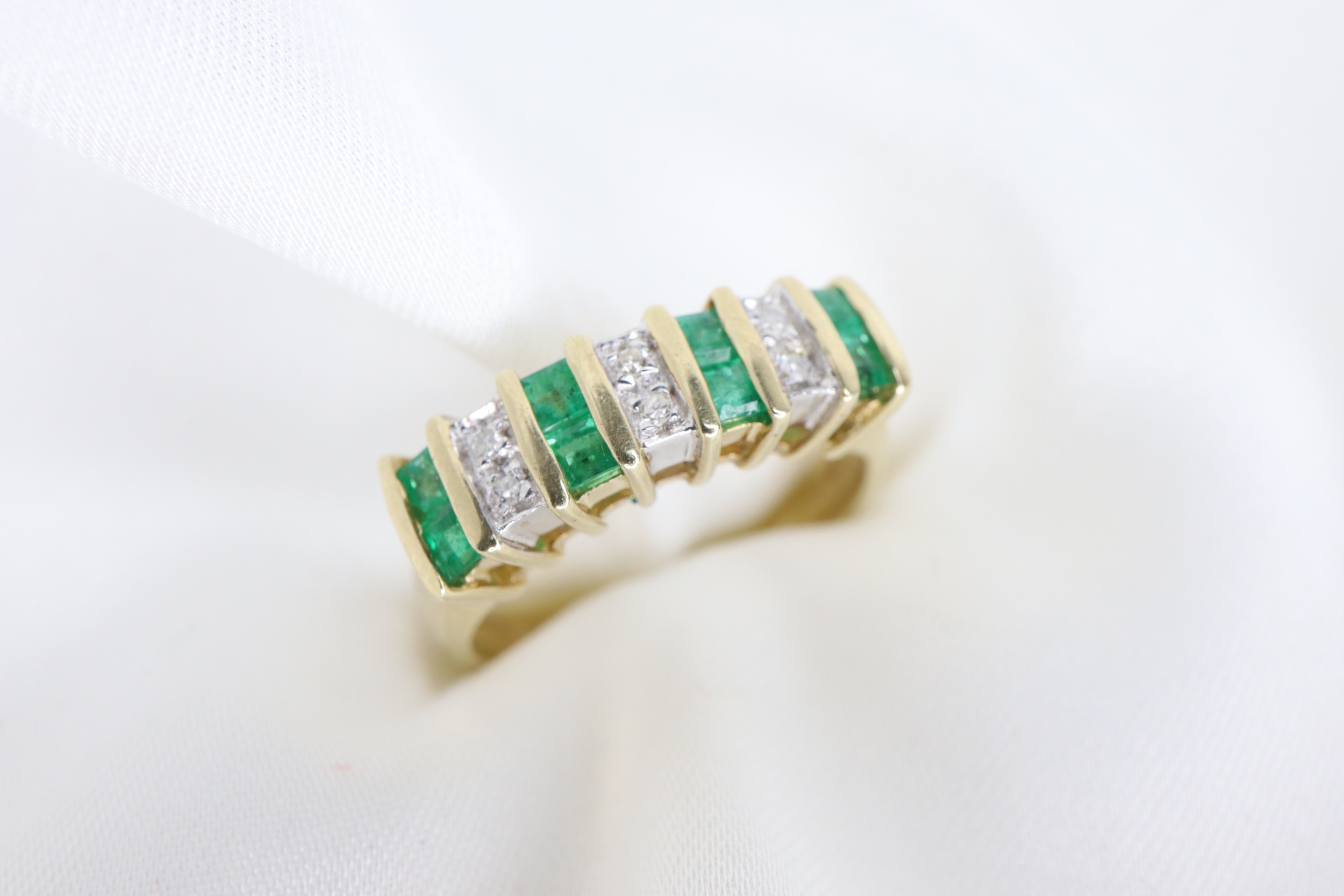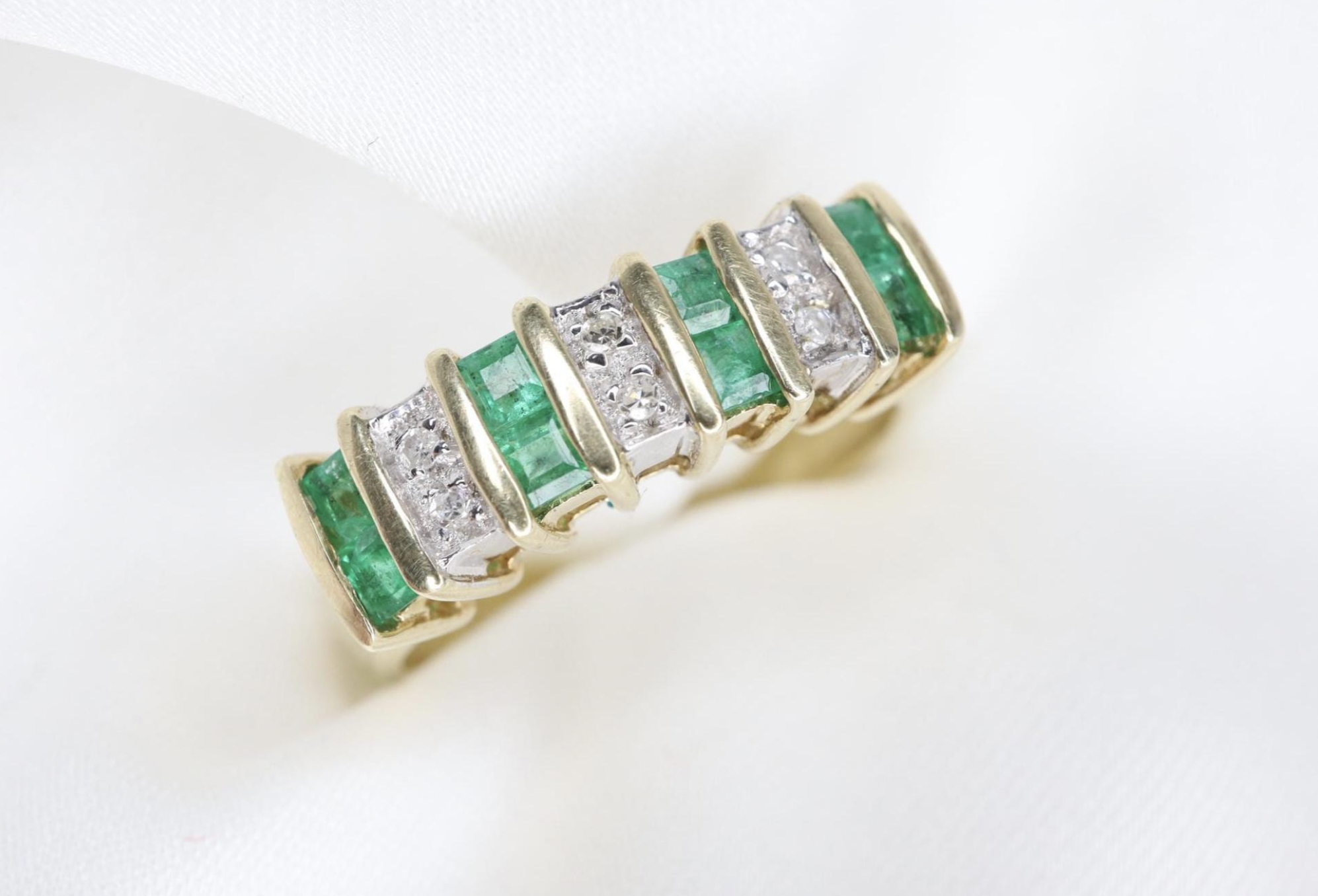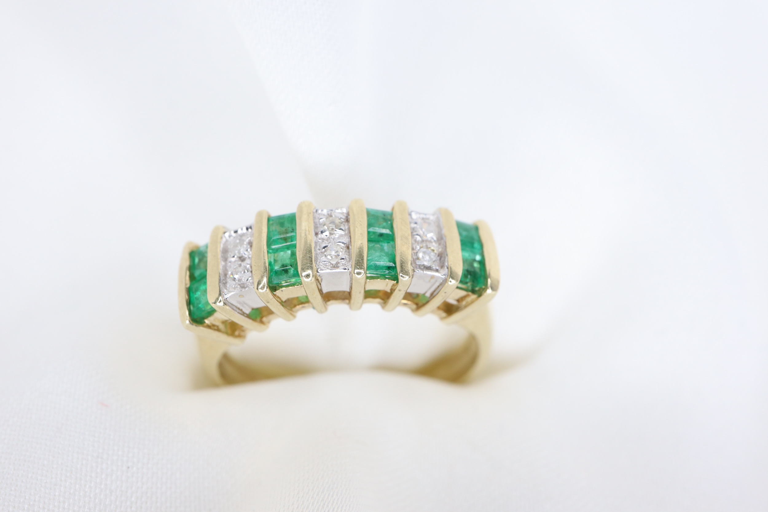 Ten elegancki pierścionek typu half eternity zdobiony jest ośmioma zielonymi szmaragdami o szlifie księżniczki, każdy o średnicy 1,9 mm, subtelnie przeplatanymi sześcioma lśniącymi diamentami o średnicy około 1 mm każdy.