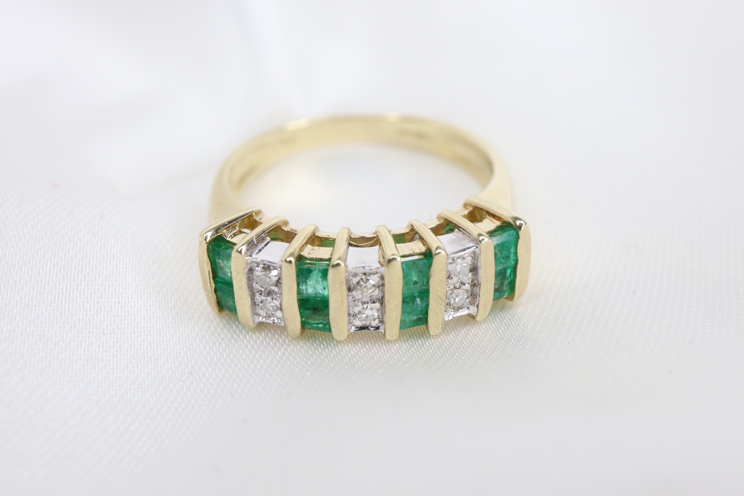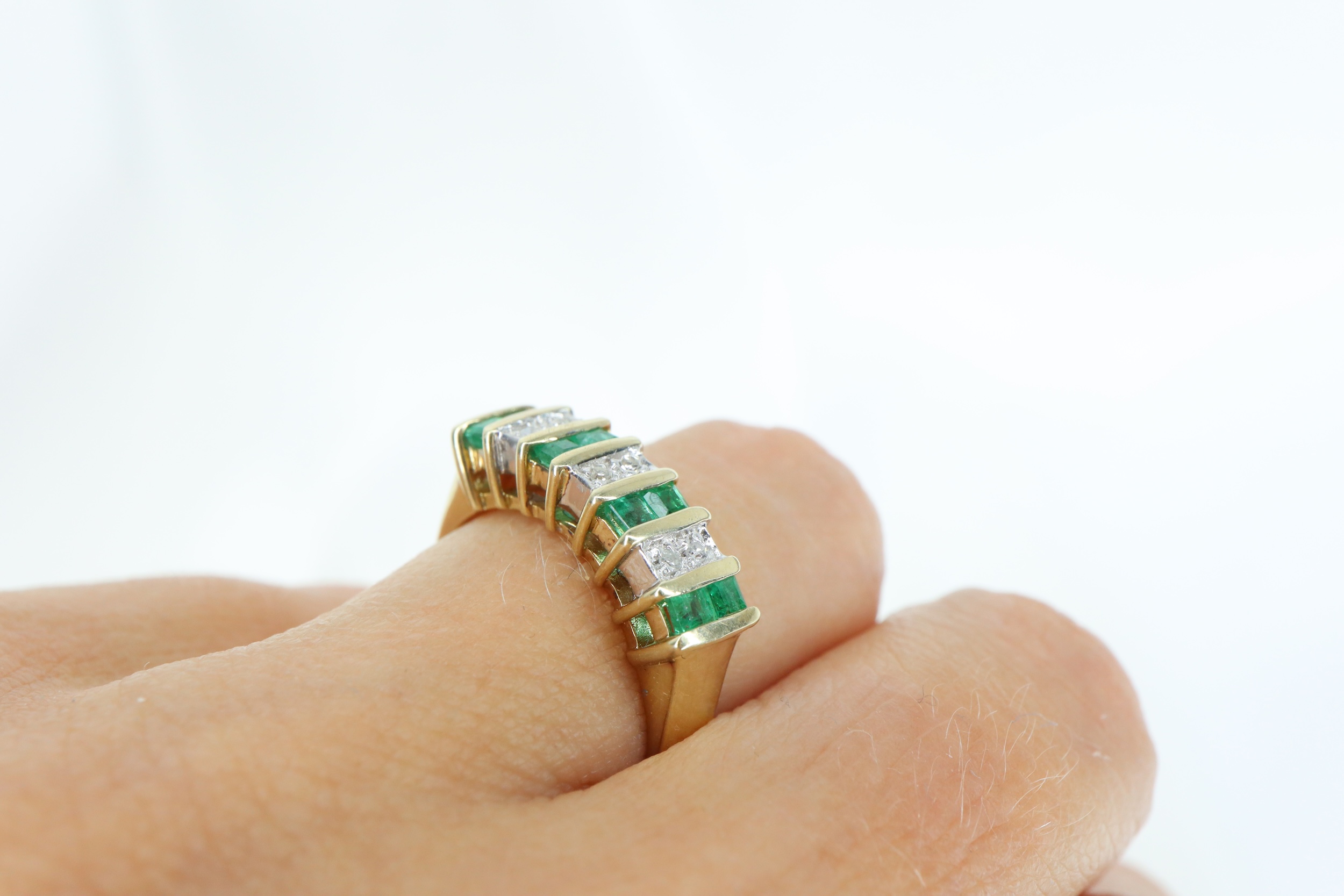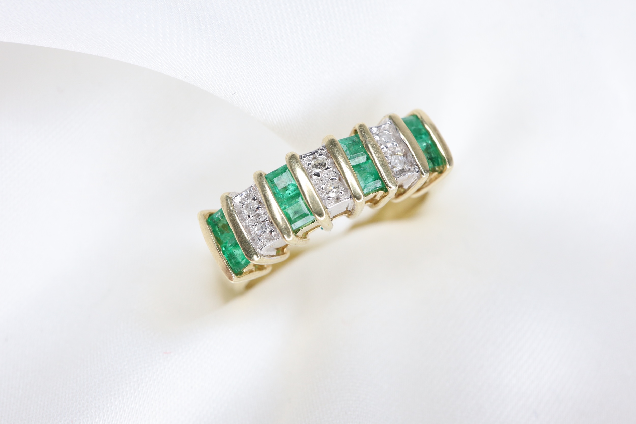 Ten elegancki pierścionek typu half eternity zdobiony jest ośmioma zielonymi szmaragdami o szlifie księżniczki, każdy o średnicy 1,9 mm, subtelnie przeplatanymi sześcioma lśniącymi diamentami o średnicy około 1 mm każdy.