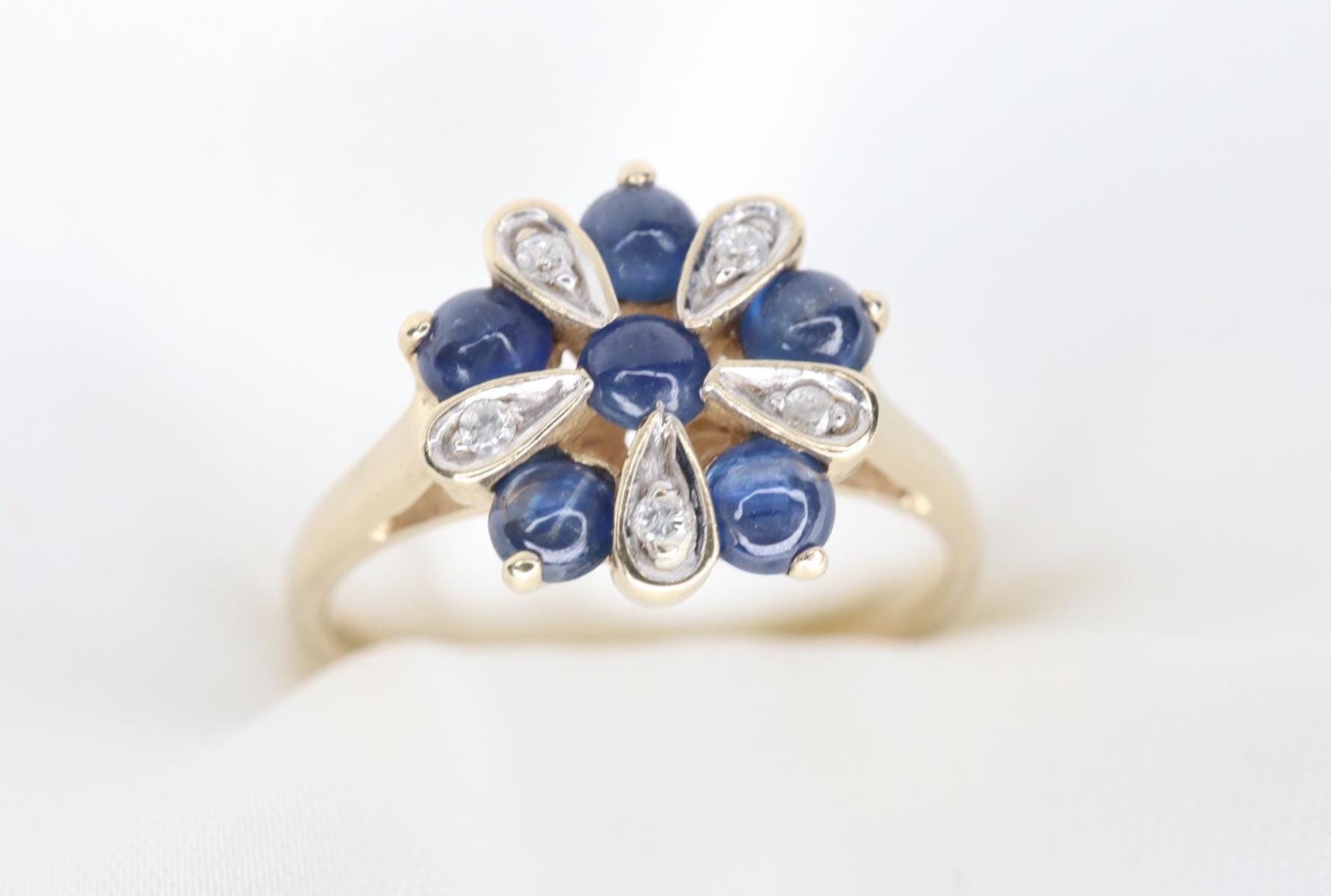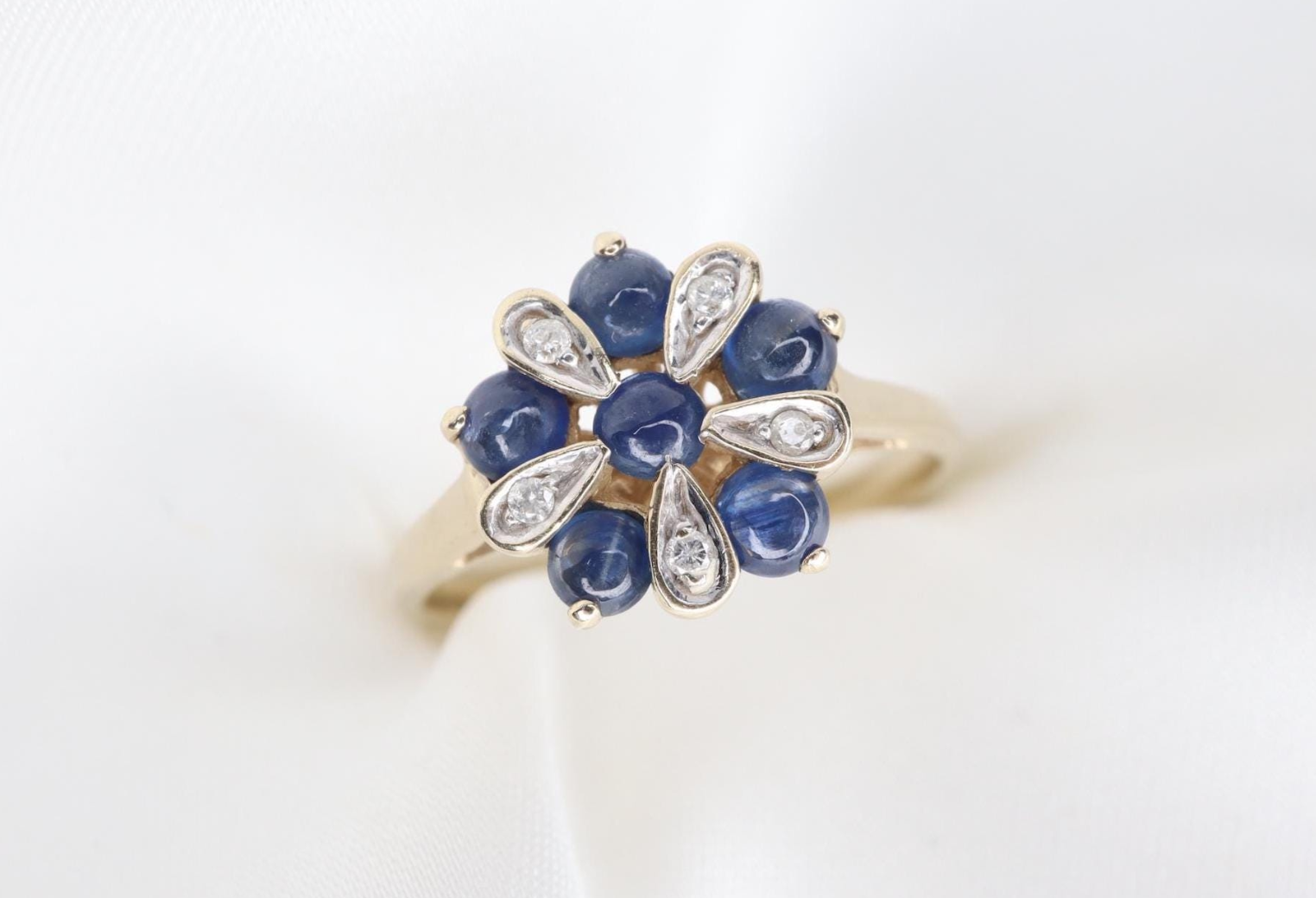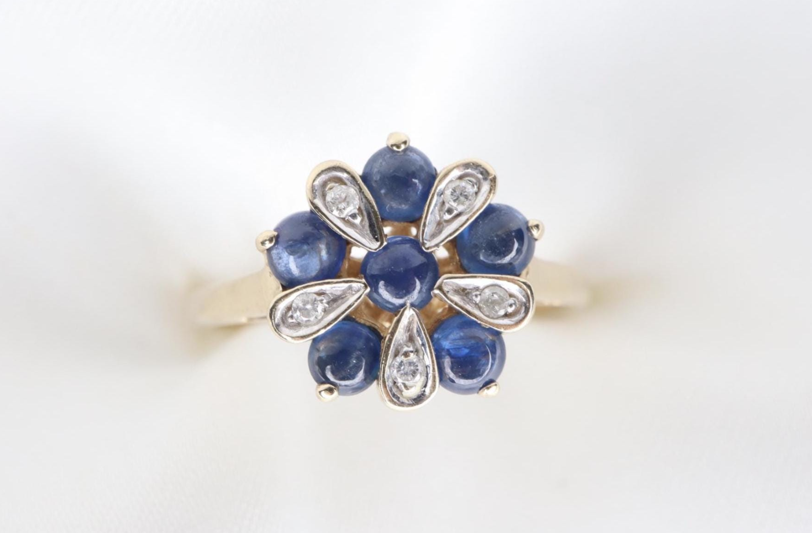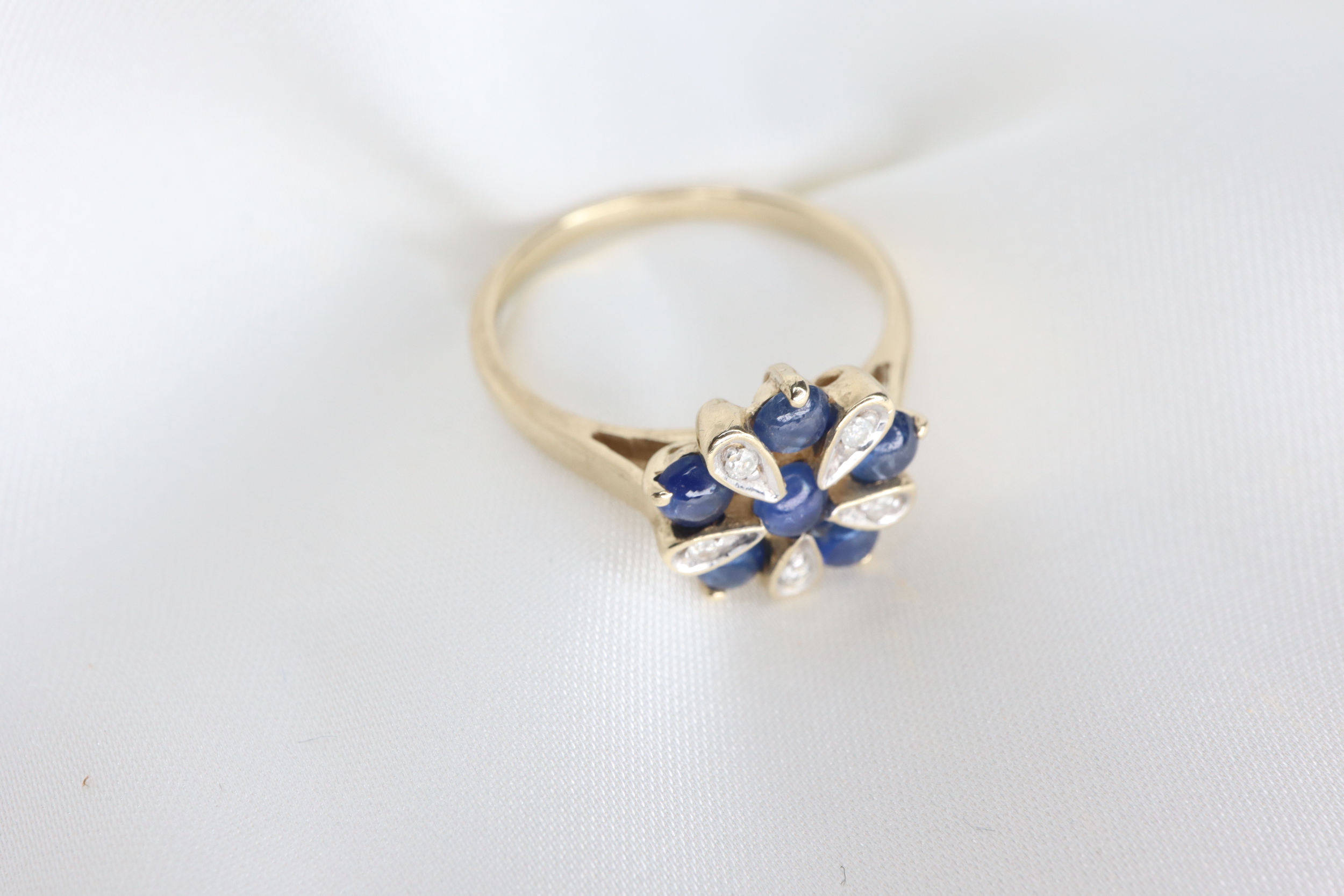 Ten uroczy pierścionek z 9-karatowego żółtego złota zachwyca subtelnym motywem kwiatka, w którym szafiry w szlifie kaboszonowym tworzą delikatne płatki, a diamenty stanowią błyszczące akcenty między nimi.