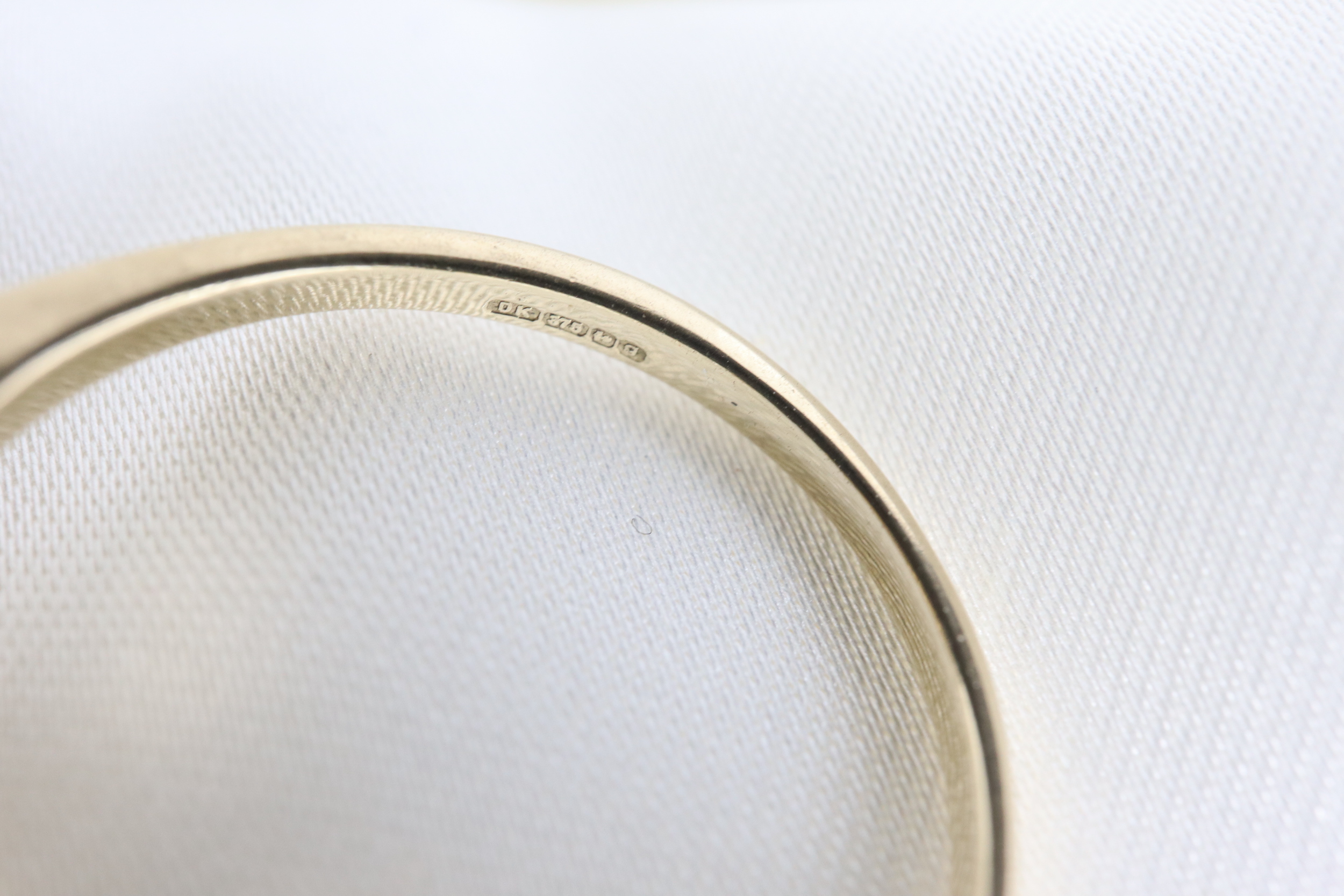 Wewnątrz obrączki znajduje się pełna cecha probiercza złota 9 ct (375), Birmingham, wraz ze znakiem sponsora „DK”.