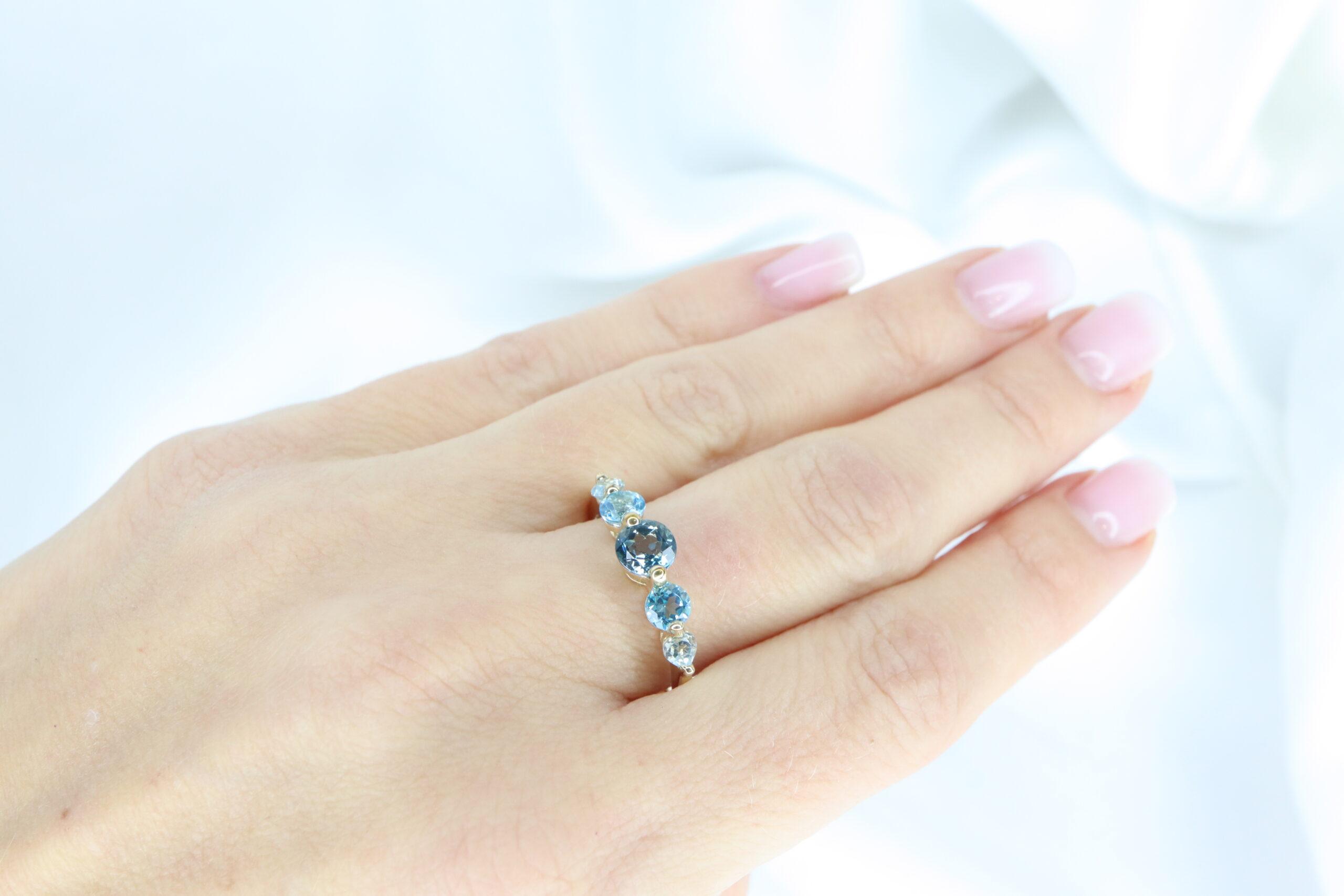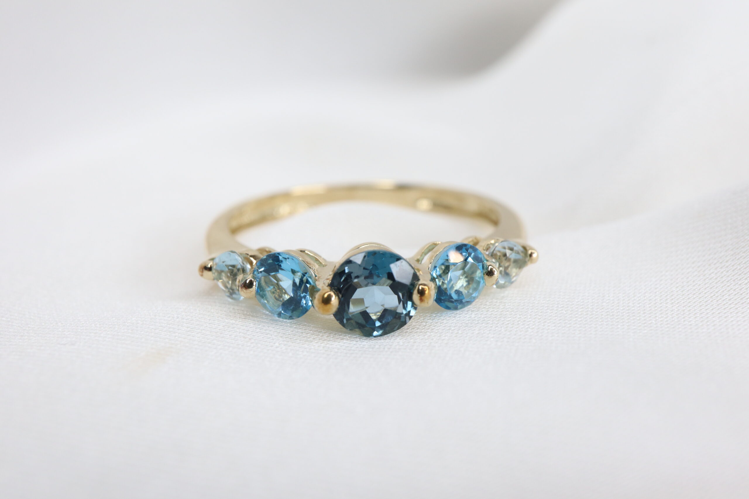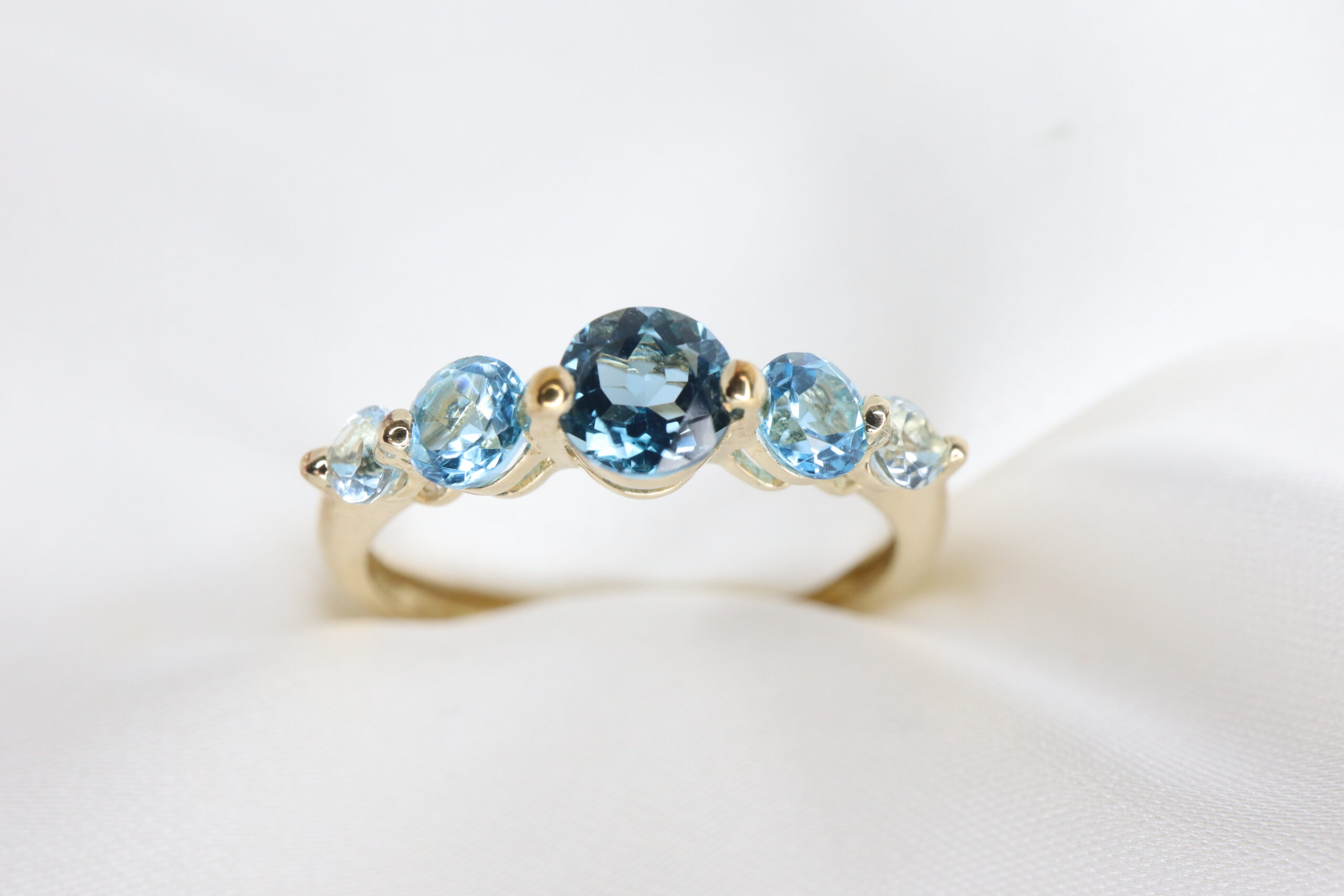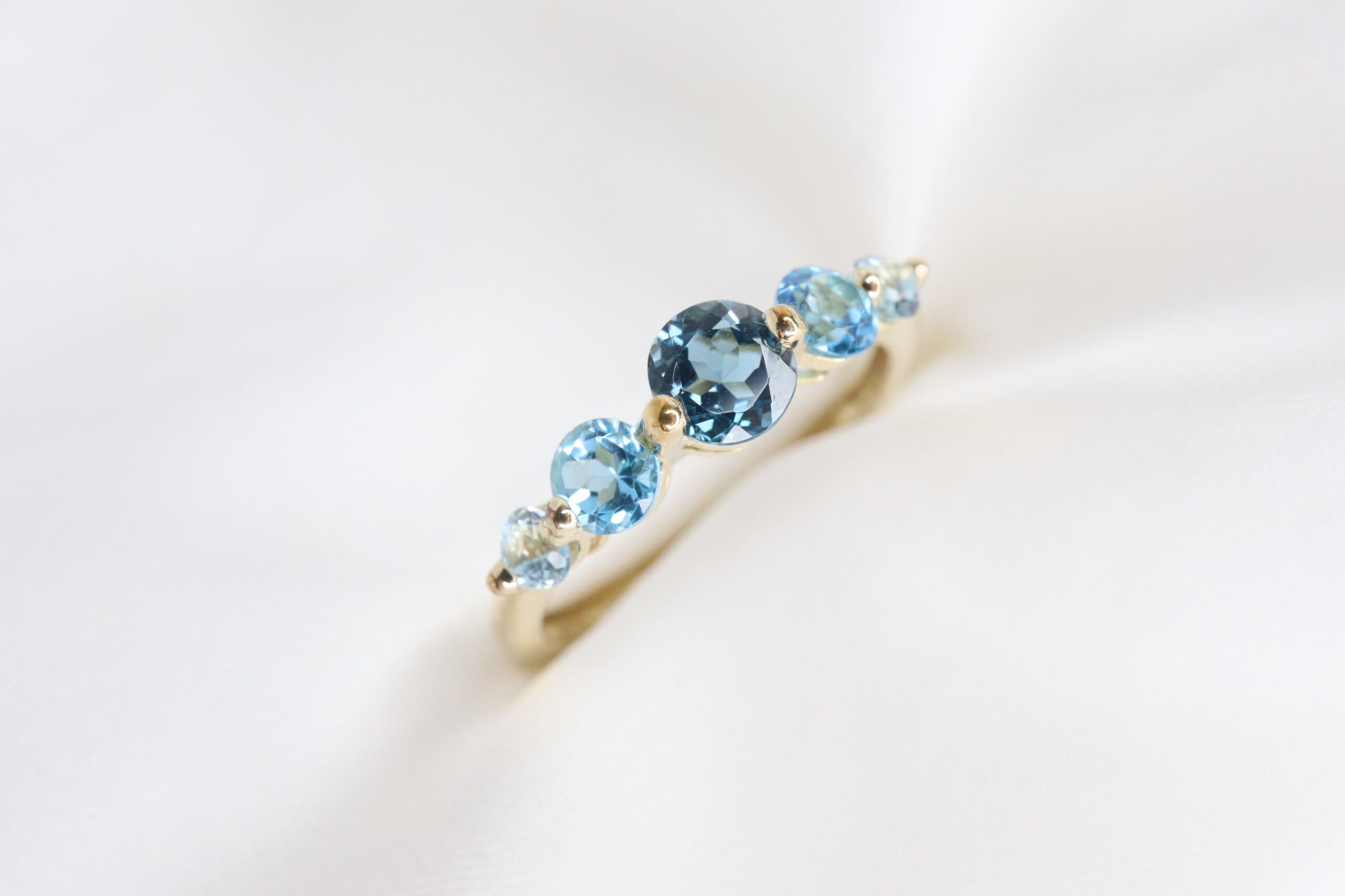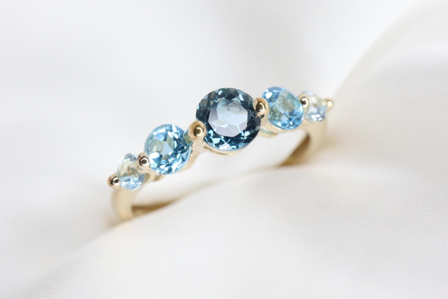 Uroczy pierścionek zdobiony pięcioma okrągłymi topazami w subtelnym, stopniowanym układzie kolorów.