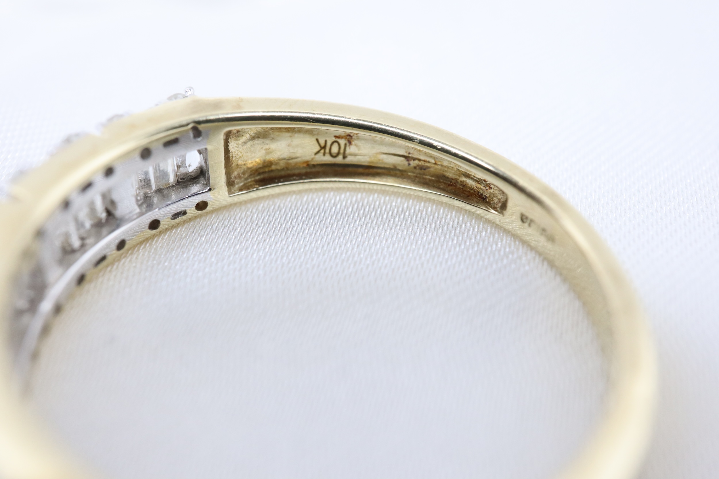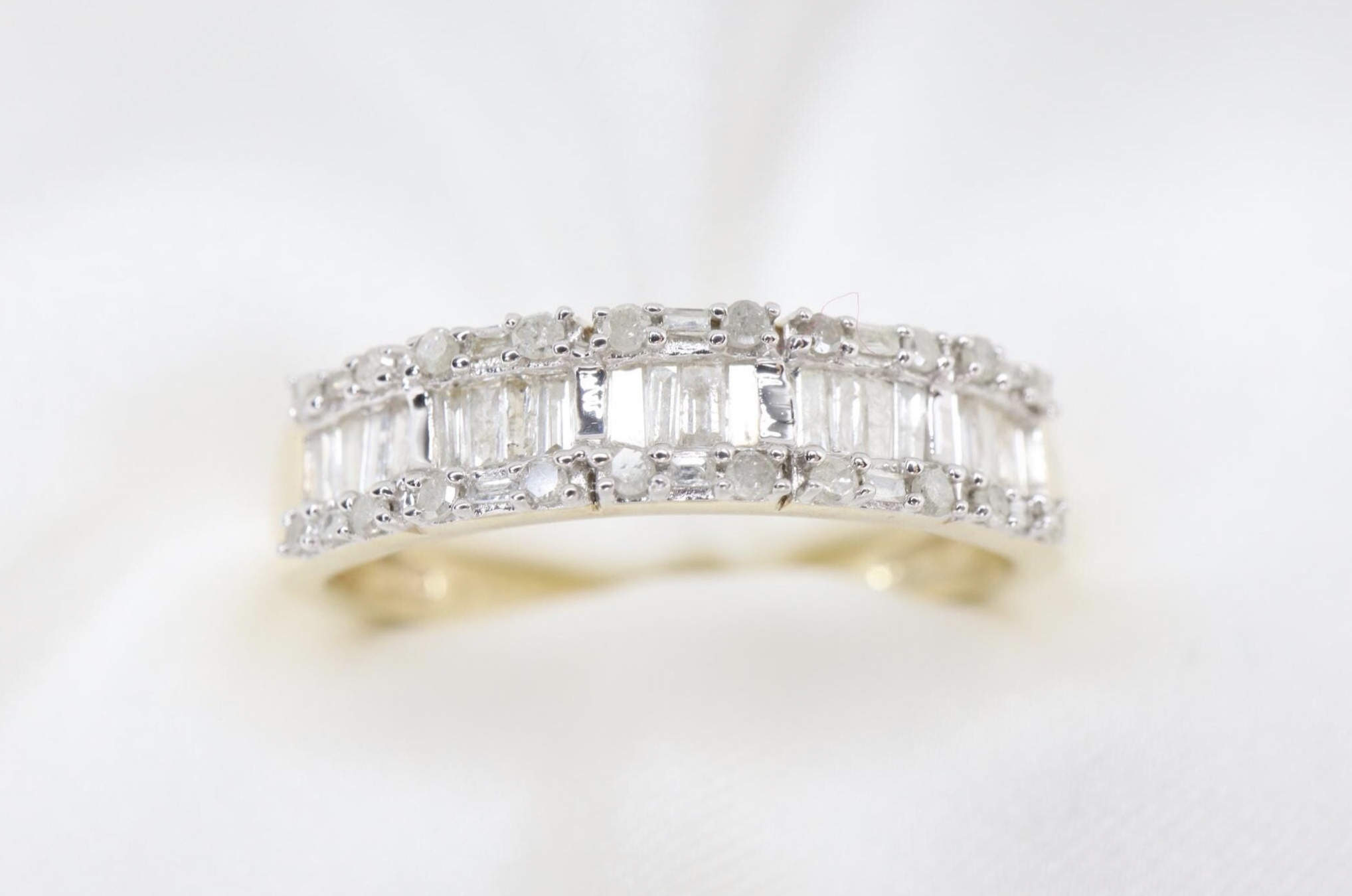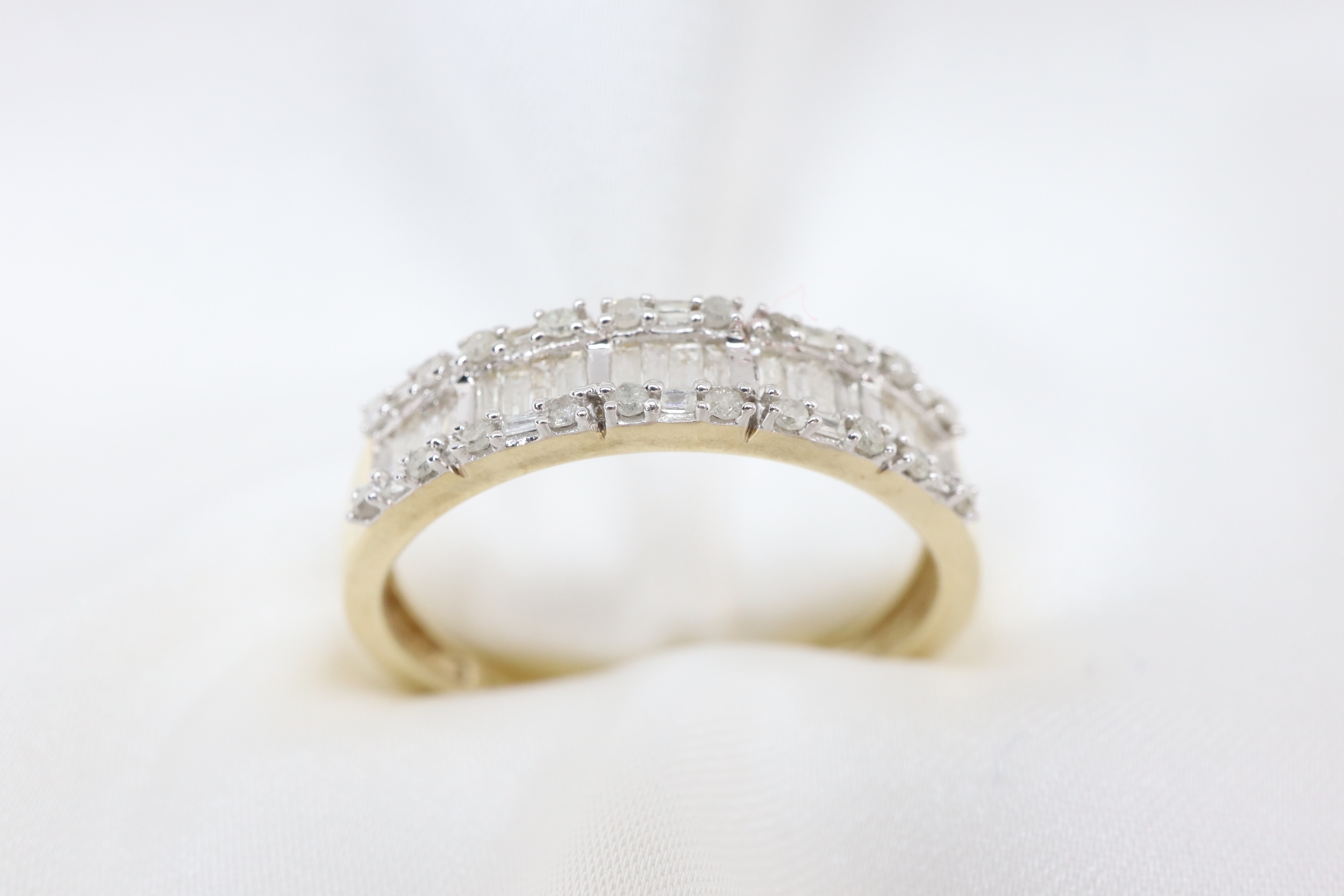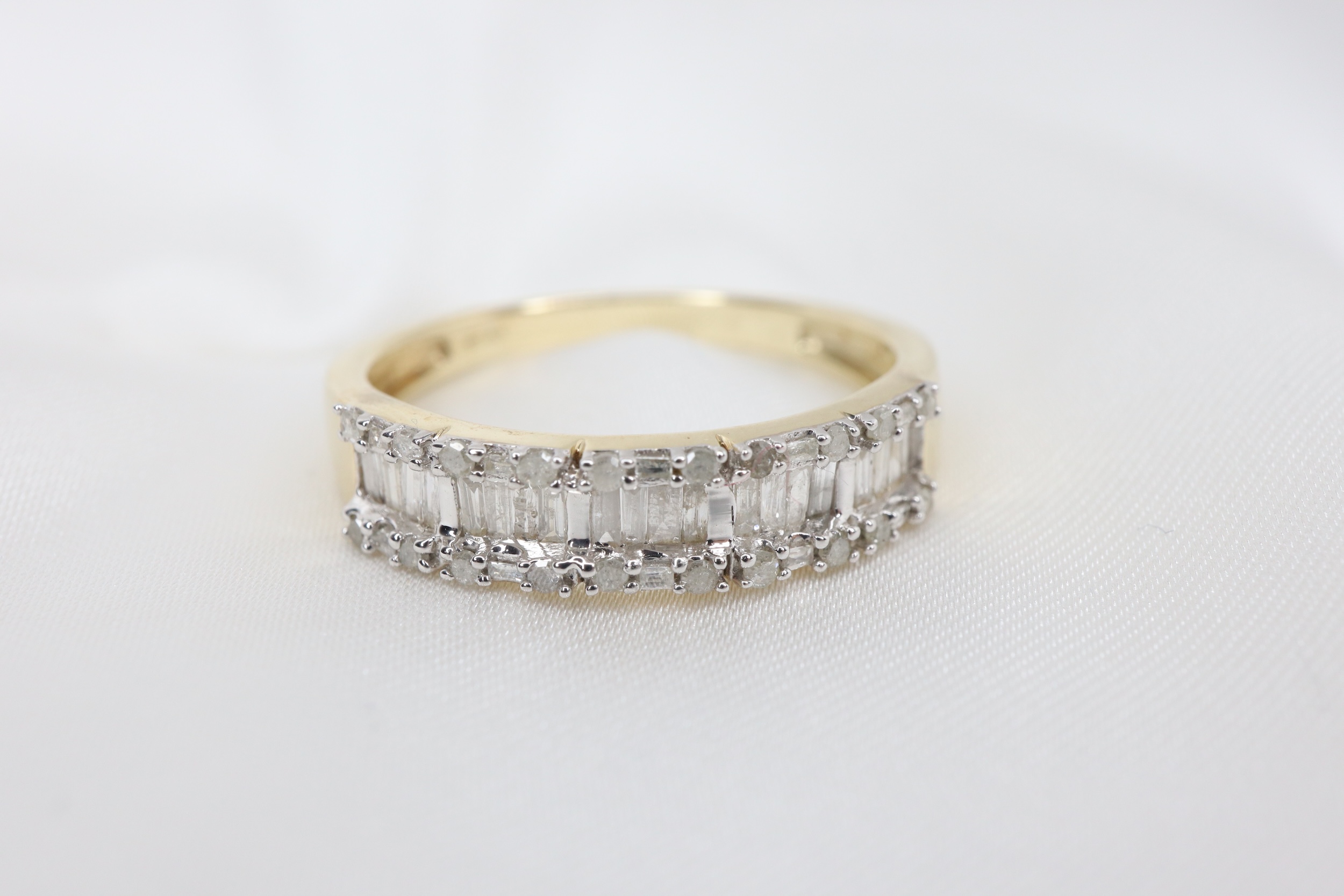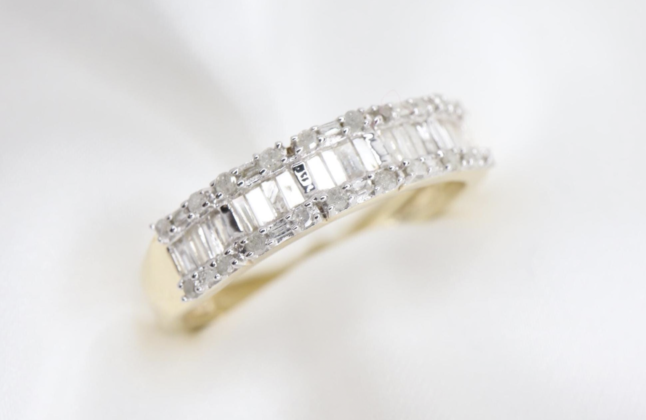 Elegancki pierścionek wykonany z 10-karatowego żółtego i białego złota, ozdobiony diamentami w szlifie bagietowym oraz okrągłym (brylant).