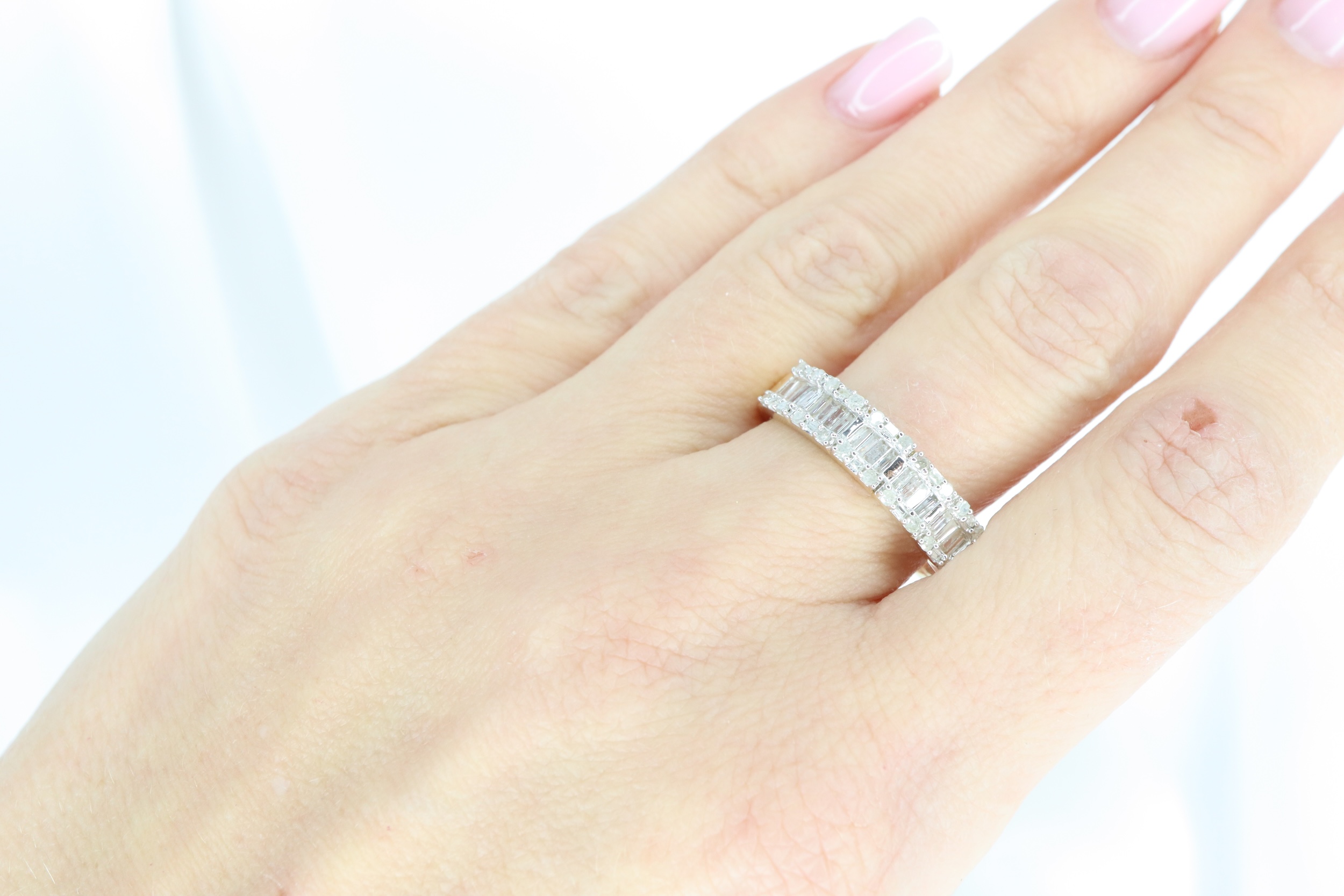 Kamienie są pięknie oprawione w panel z białego złota, który biegnie do połowy obrączki, tworząc klasyczny wzór typu half eternity.