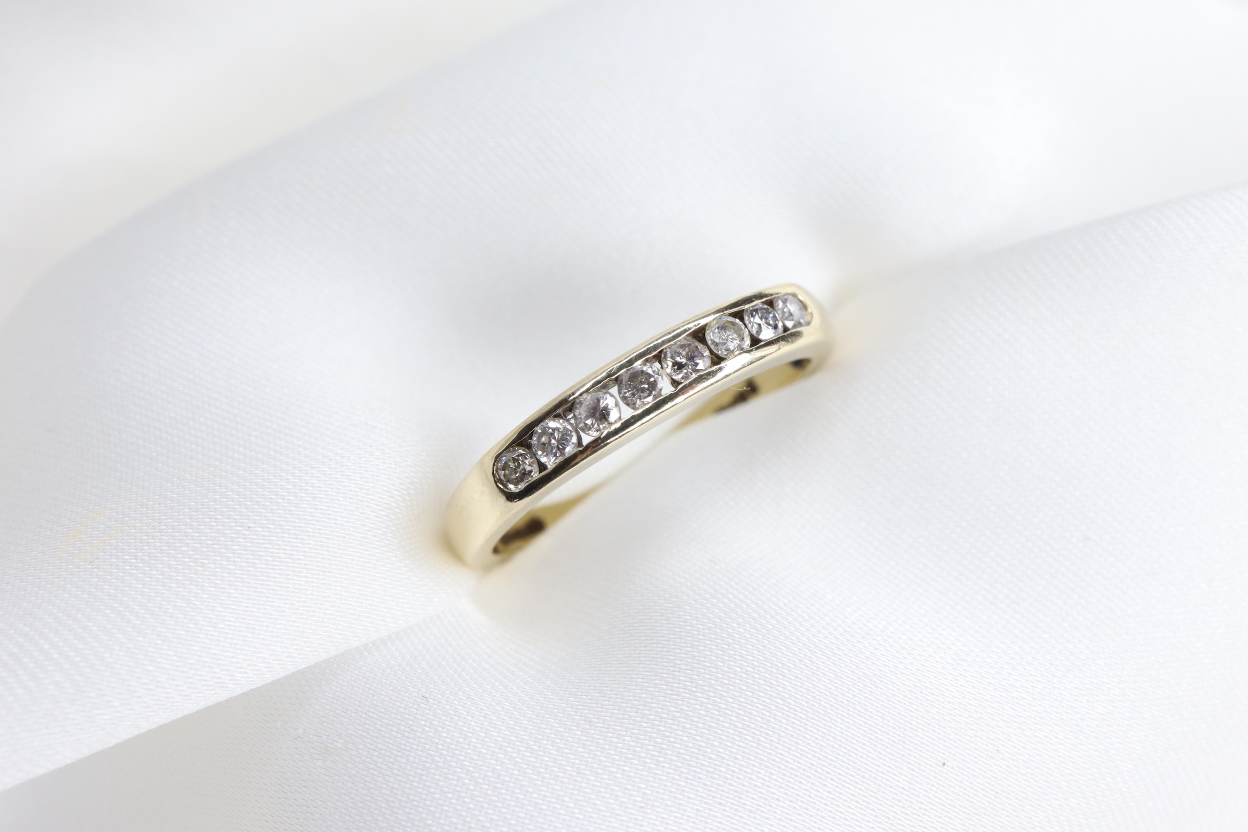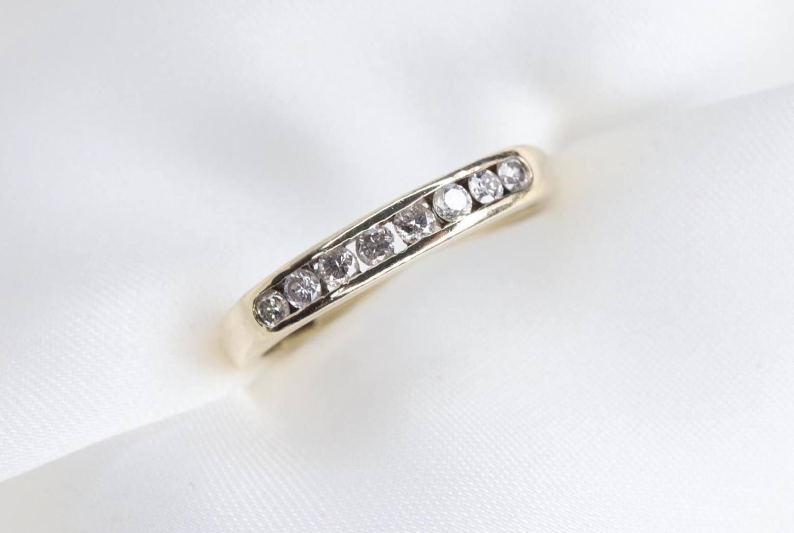 Subtelny i pełen klasy pierścionek wykonany z 9-karatowego żółtego złota, którego ponadczasowy charakter podkreśla rząd 8 lśniących diamentów w szlifie okrągłym.