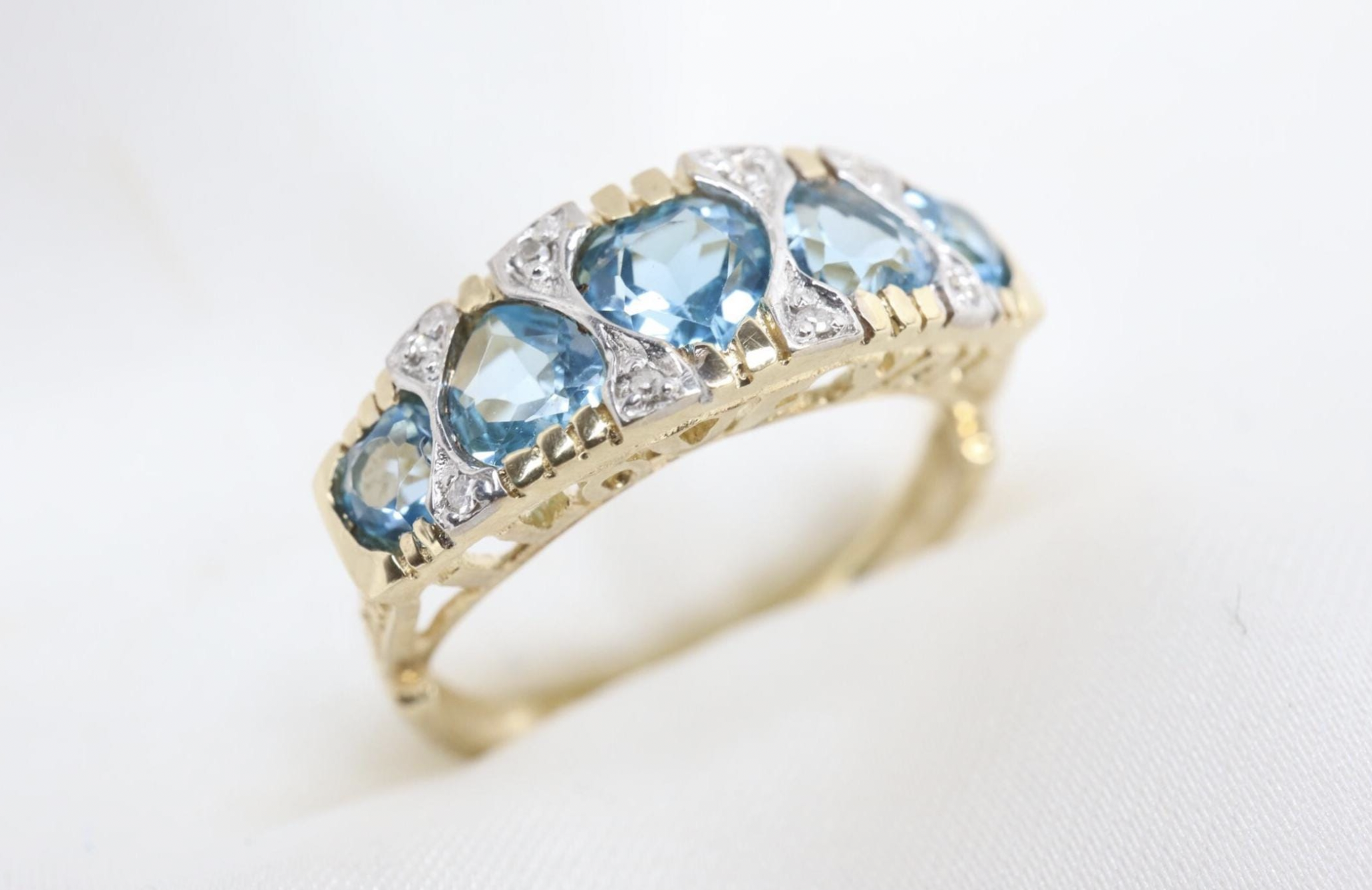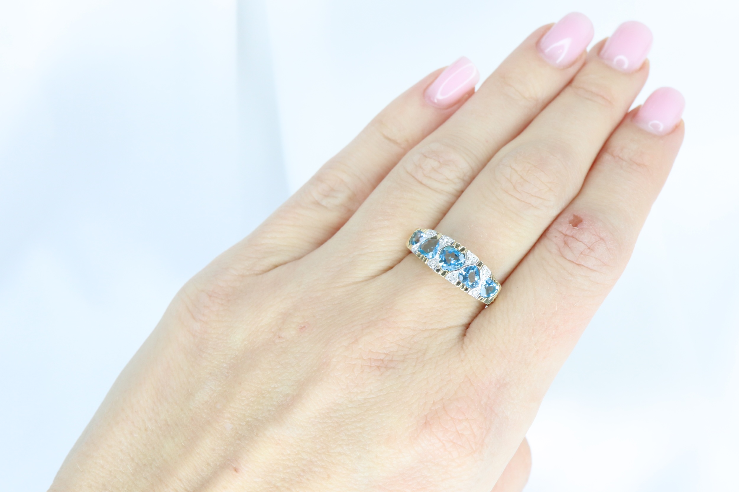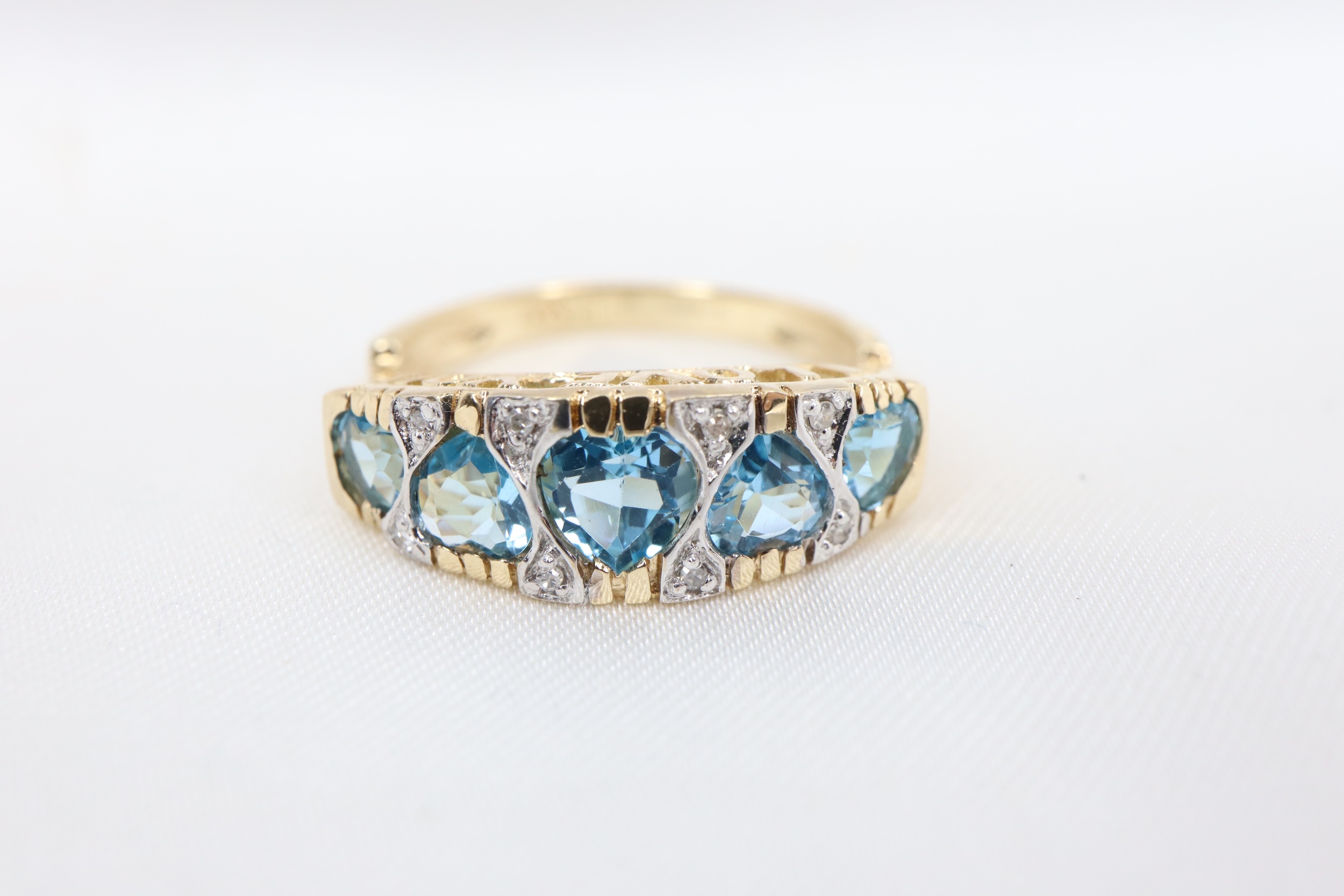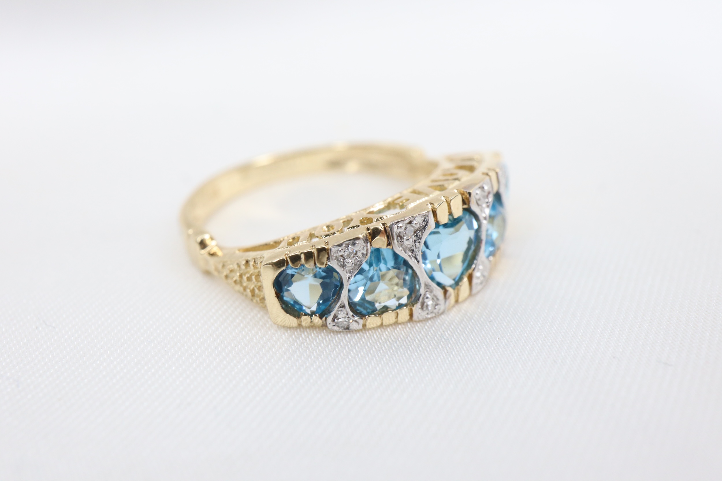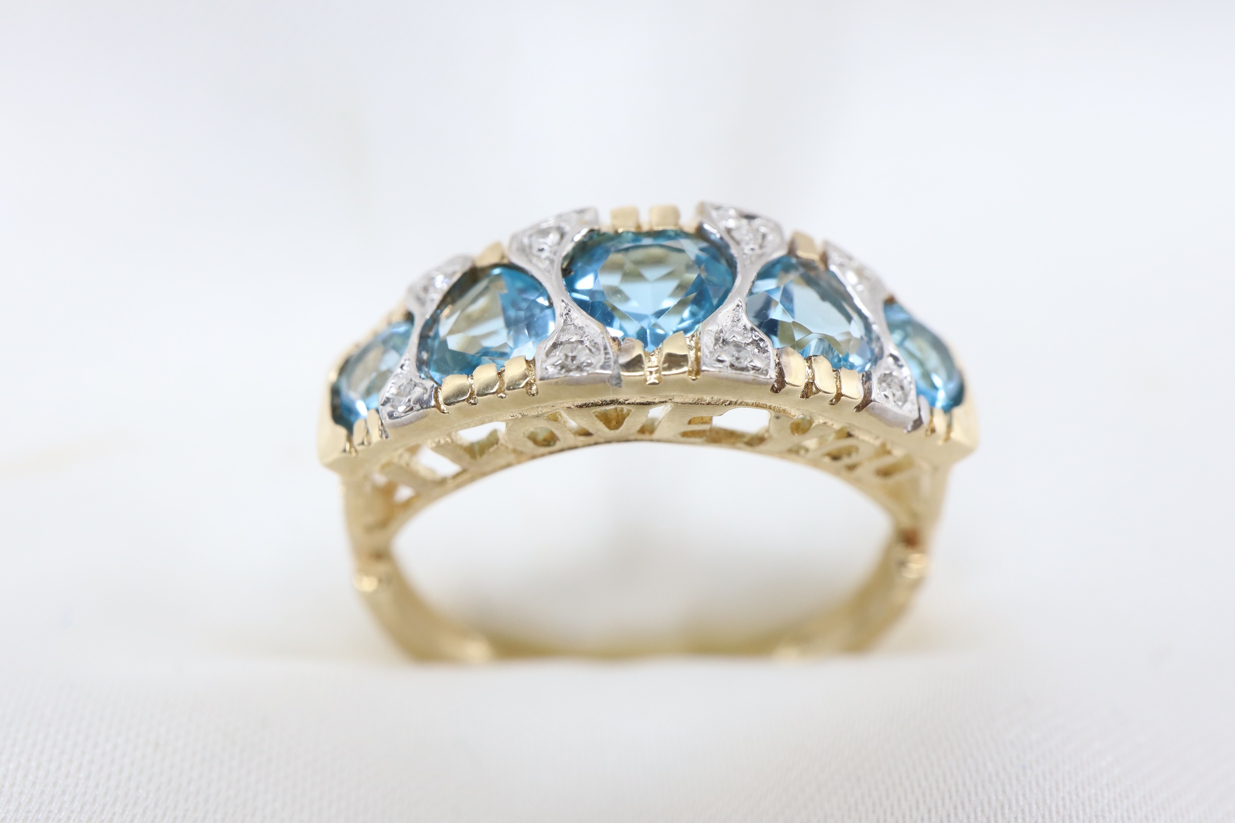 Uroczy pierścionek vintage wykonany z żółtego złota próby 9 ct, ozdobiony rzędem pięciu serduszek z błękitnego topazu o stopniowanej wielkości.