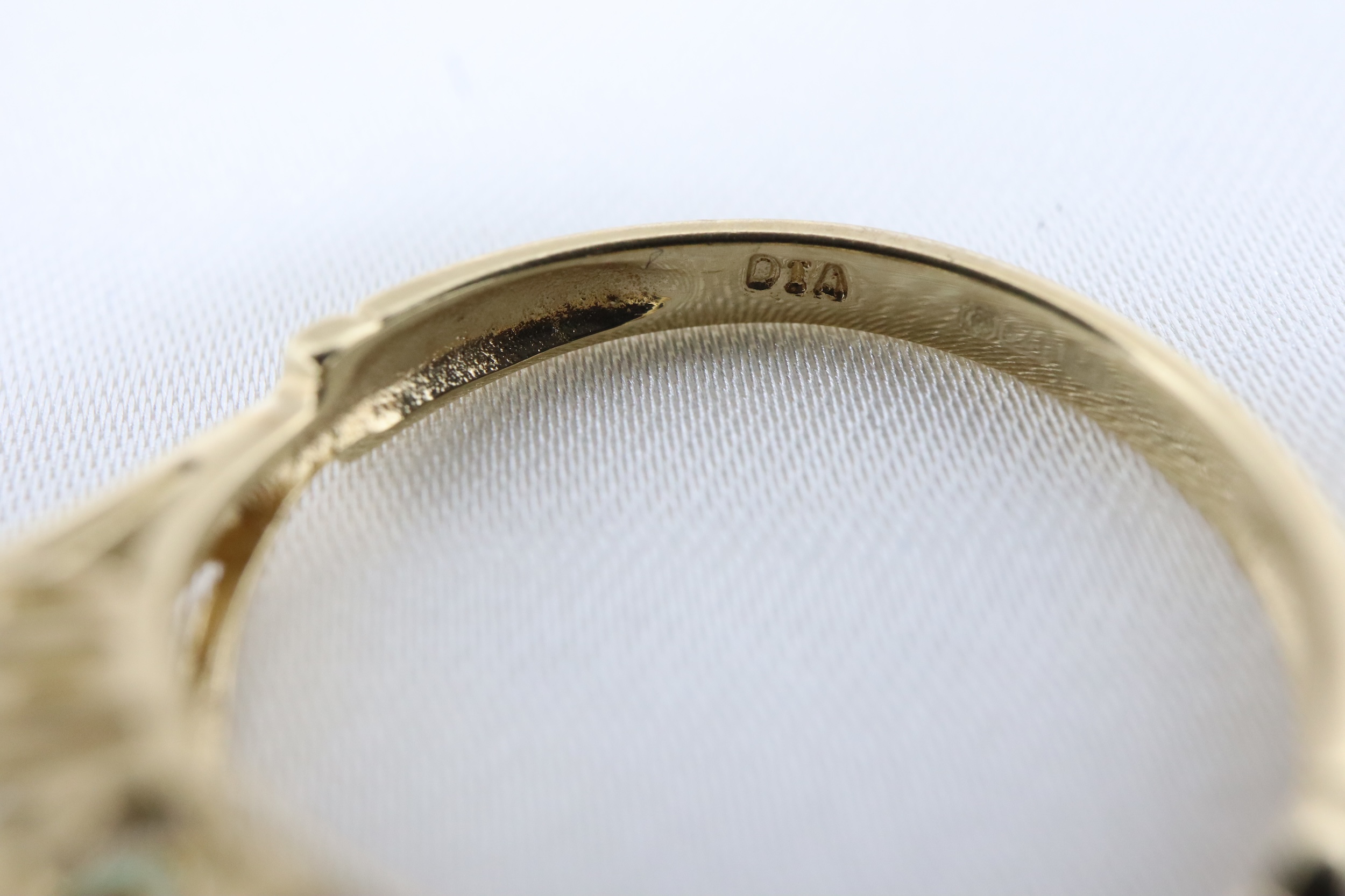Pierścionek posiada pełne cechowanie wewnątrz obrączki potwierdzające próbę złota 9 ct (375), znak imienny „GA” oraz oznaczenie „DIA” wskazujące na obecność diamentów.