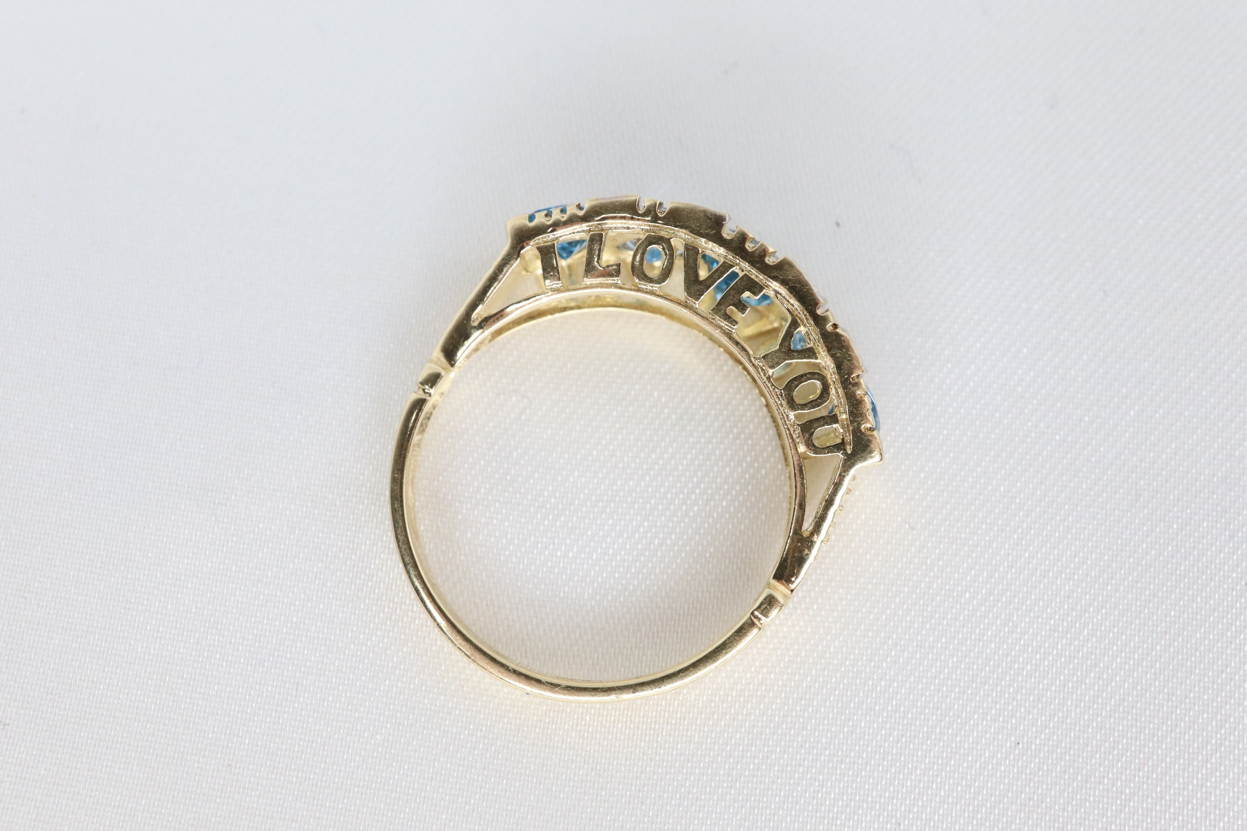 Pierścionek vintage z 9-karatowego złota z błękitnym topazem i diamentami „I LOVE YOU” – rozmiar EU 10,5