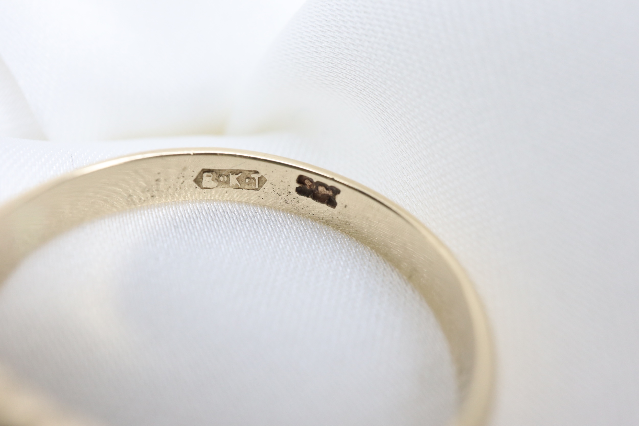 Pierścionek posiada cechę probierczą 9ct (9CT) oraz znak sponsora „RKJ”.
