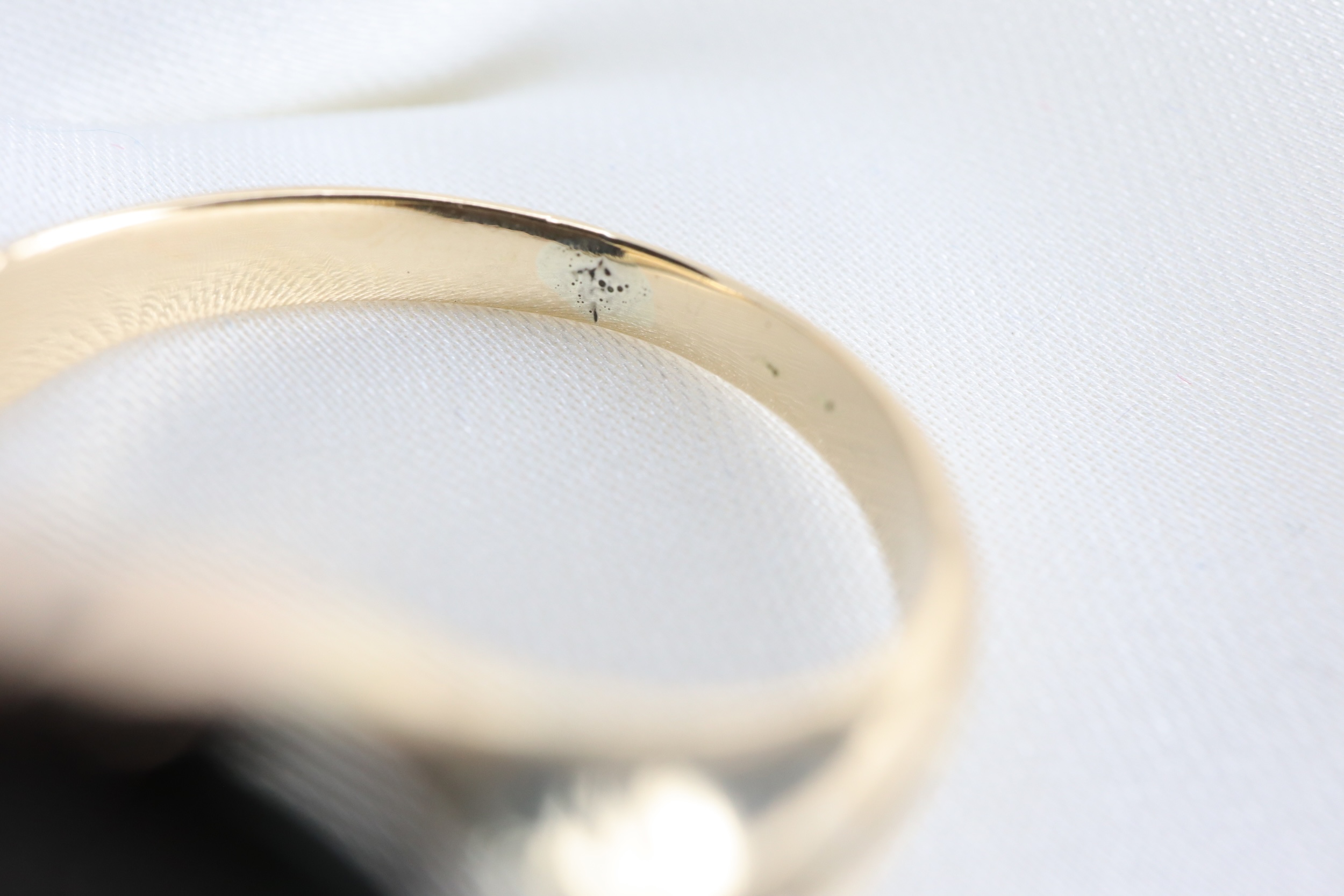 Pierścionek nie posiada cech probierczych, gdyż zatarły się one z upływem czasu, jednak został przetestowany i potwierdzony jako wykonany z 9-karatowego złota.