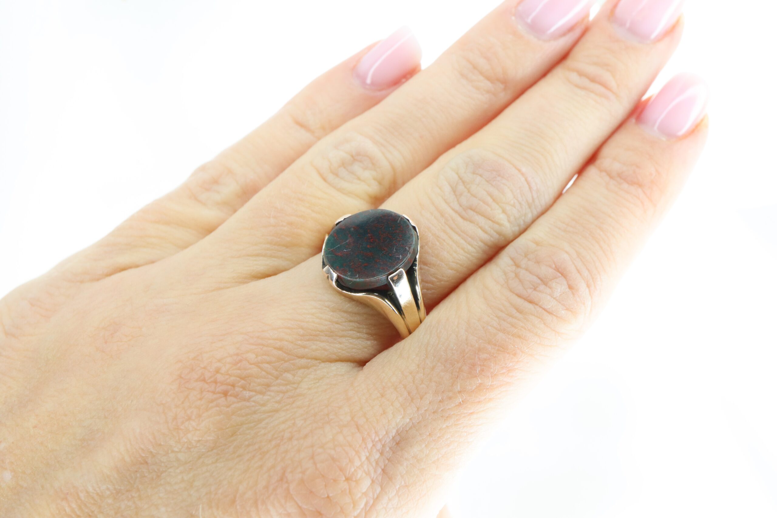 Wspaniały sygnet wykonany z 9-karatowego żółtego złota, ozdobiony owalnym krwawnikiem (heliotropem) o wymiarach 12 × 10 mm, osadzonym pomiędzy dekoracyjnymi ramionami. Zielony kamień z naturalnymi czerwonymi inkluzjami nadaje pierścionkowi wyrazisty charakter i ponadczasowy urok.